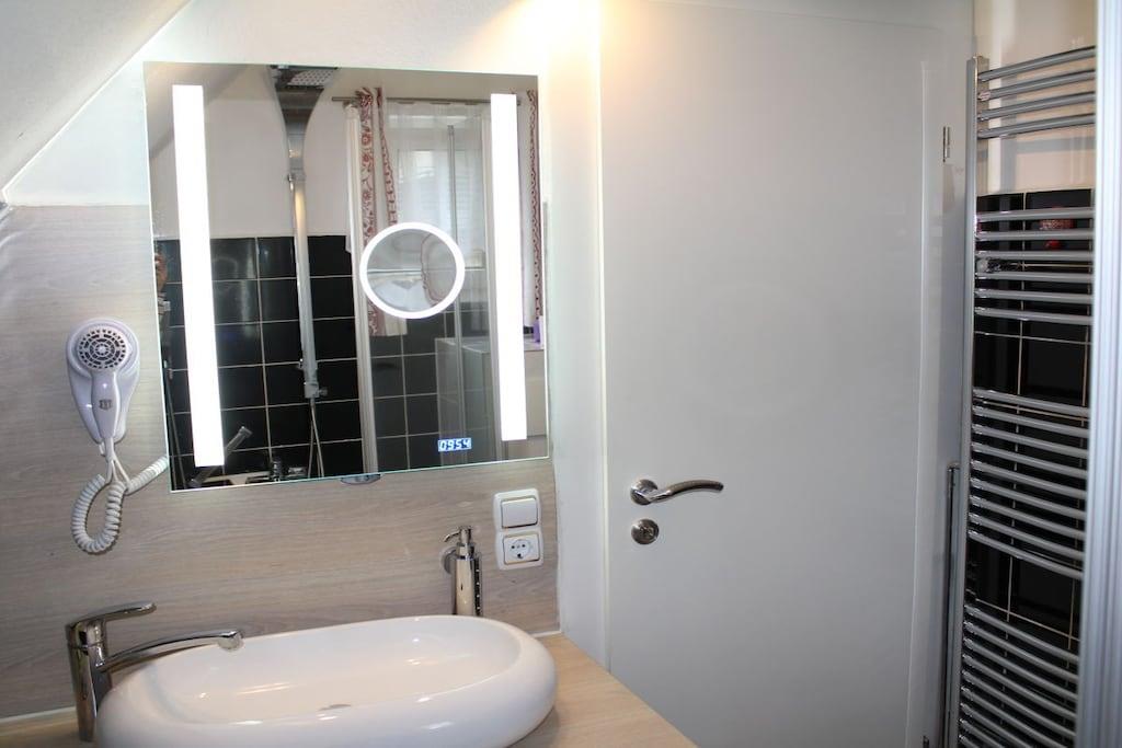 Die Ferienwohnung Daun liegt im Zentrum der Kleinstadt und des Ferienortes Daun, in unmittelbarer Nähe zum Vulkanmuseum, dem Hallenbad und vielen weiteren Freizeiteinrichtungen und Ausflugszielen. Alle Informationen auch auf unserer Website www.villa1.de Die liebenswürdige Kleinstadt Daun bietet in vielen kleine Geschäften, Restaurants und Cafes ein sehr gutes Angebot in unmittelbarer Nähe zur Ferienwohnung. Das Wandergebiet "Wehrbüsch" ist nur wenige Gehminuten entfernt. Die Seen und Maare sind nur ca. 2 km entfernt. Ferienwohnung Daun: Die schöne Ferienwohnung ist neu renoveirt und für 8 Personen geeignet, Größe auf 2 Etagen: ca. 95 qm. Sie liegt in der 1. und 2. Etage des City Ferienhauses Vulkaneifel (separater Eingang). Sie verfügt über einen Wohnraum mit mit Doppelschlafsofa, Sofaecke und Essecke, großer HD Fernseher mit vielen deutschen und internationalen Sendern (2 Satellitten, Astra und Hotbird)) mit DVD und Stereoanlage mit Radio, CD und USB, 3 separate Schlafzimmer mit großen Doppelbetten, ein Schlafraum befindet sich in einem apartmentähnlichen Raum im Obergeschoß (über Wendeltreppe erreichbar). Dort befindet sich zudem eine komplette Sofagarnitur, 2. HD Fernseher mit DVD und Stereoanlage mit Radio, CD und USB. Die Wohnung verfügt zudem über eine separate neue, moderne Küche mit 4 Platten-Herd (Ceranfeld), Backofen, Spülmaschine, Kühlschrank mit Gefrierfach und einer zusätzlichen Essecke in der Küche, Bad/DU/WC mit Badewanne und Duschvorrichtung, modernes Aufsatzwaschbecken, schöner LED Spiegel mit Uhrzeit, Hotelfön, HD TV und DVD und Stereoanlage mit Radio, CD und USB im Bad, schöne Holzdiele, Garderobe, Zentralheizung, Spiele. Die Wohnung verfügt über einen WIFI Internetzugang. Internet / Wlan / Wifi: Kostenlos nutzbar in allen Räumen! Am Außenbereich des Hauses ist liebevoll und aufwendig eine Zierkiesbereich angelegt worden. Mit Springbrunnen und einem kleinem Wasserfall. Das Haus und die Außenalagen sind am Abend und nachts sehr attraktiv in einem Farbenspiel mit LED Strahlern angestrahlt. Das City Ferienhaus Vulkaneifel liegt zur einen Seite zur Straße und zur anderen Seite zu einer kleinen, städtischen Parkanlage Zur Ausstattung der Ferienwohnung gehören: Mikrowelle, 2 Kaffeemaschinen (Padmaschine Bosch Tassimo und eine Filtermaschine), Toaster und Wasserkocher. Töpfe und Pfannen sowie Besteck und Geschirr für die höchstmögliche Personenzahl sind selbstverständlich vorhanden. Kinderbett und Hochstuhl können kostenlos bereitgestellt werden. Ein Parkplatz gehört zur Wohnung. Dieser befindet sich direkt hinter dem Haus, im Hof. Viele Sehenswürdigkeiten und Freizeiteinrichtungen sind nur wenige Gehminuten entfernt. Einkaufen, Shoppen, Restaurants, Cafes, Kino, Wellnesss oder Hallen- Warmwasserbad usw. finden Sie direkt um die Ecke. Ein Supermarkt und 2 große Bäckereien liegen ca. 50 bis 150 m entfernt (Bäckereien und Cafes, sonntags geöffnet). Die 3 Seen liegen in nur 2 bis 3 km Entfernung. Besuchen Sie den schönen Kurpark in Daun. Das Wandergebiet Wehrbüsch mit Anschluß zu den Maaren ist nur ca. 600 bis 700 m entfernt. Ein großer Kinderspielplatz liegt nur 100 m entfernt.