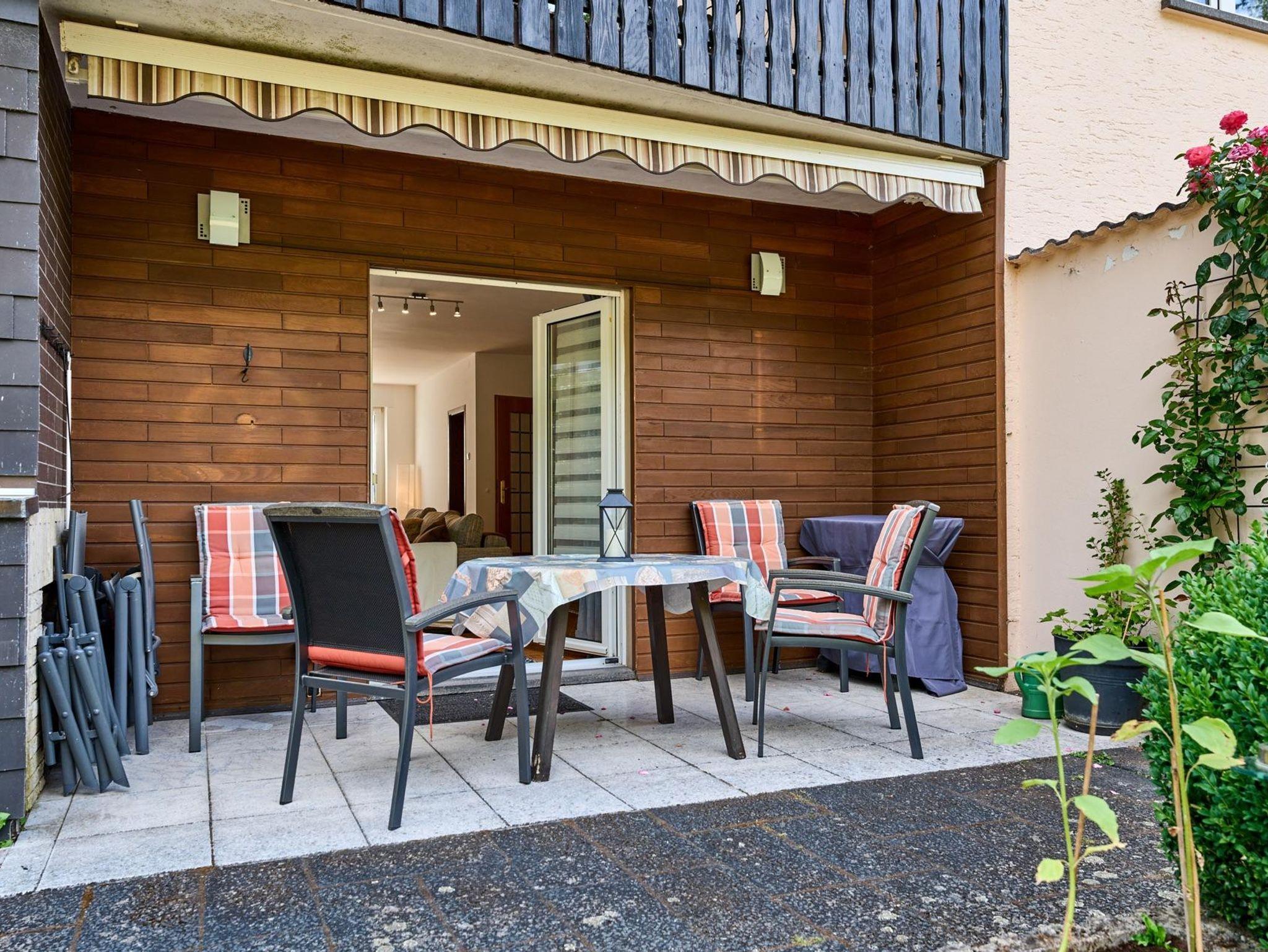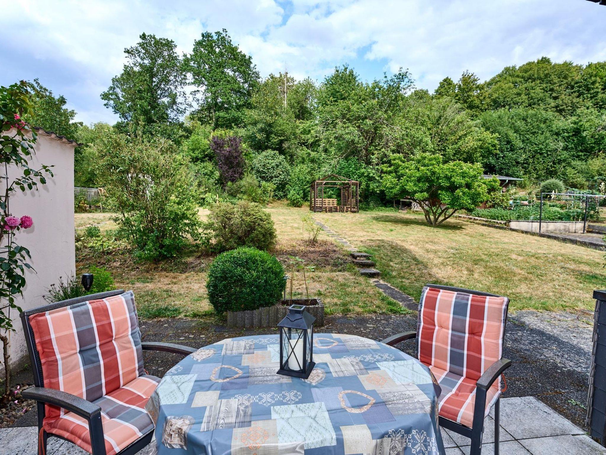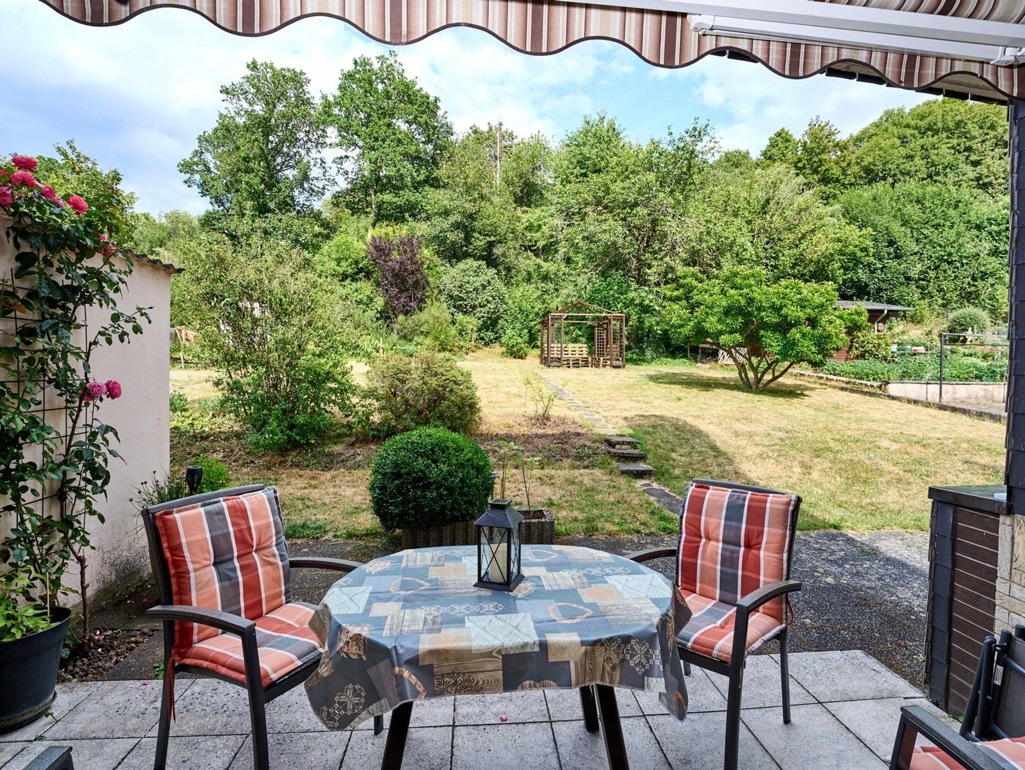 Die Terrasse, ausgestattet mit Gartentisch, 4 Gartenstühlen und zwei Liegestühlen, lädt ein zum gemütlichen Frühstücken oder zum Genießen der Abendsonne bei einem leckeren Glas Wein von der Mosel. Außerdem steht Ihnen dort ein Elektrogrill zur Verfügung. Vom oberen Bereich des Gartens haben sie durch ein Gatter direkten Zugang an den angrenzenden Waldweg.