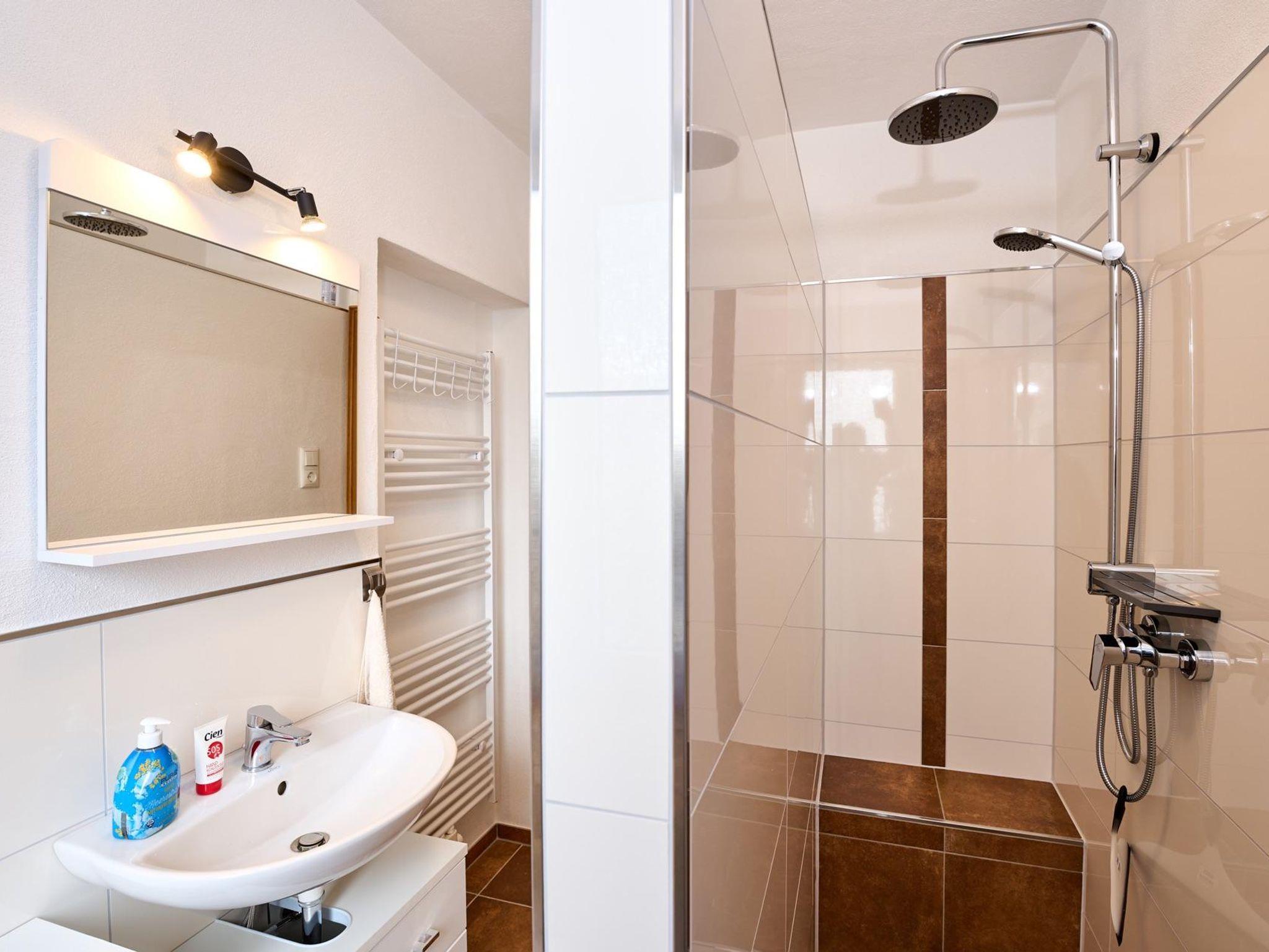 Das 2023 komplett erneuerte Badezimmer verfügt über eine ebenerdige Dusche mit Sitzgelegenheit, ein WC und ein Waschbecken.