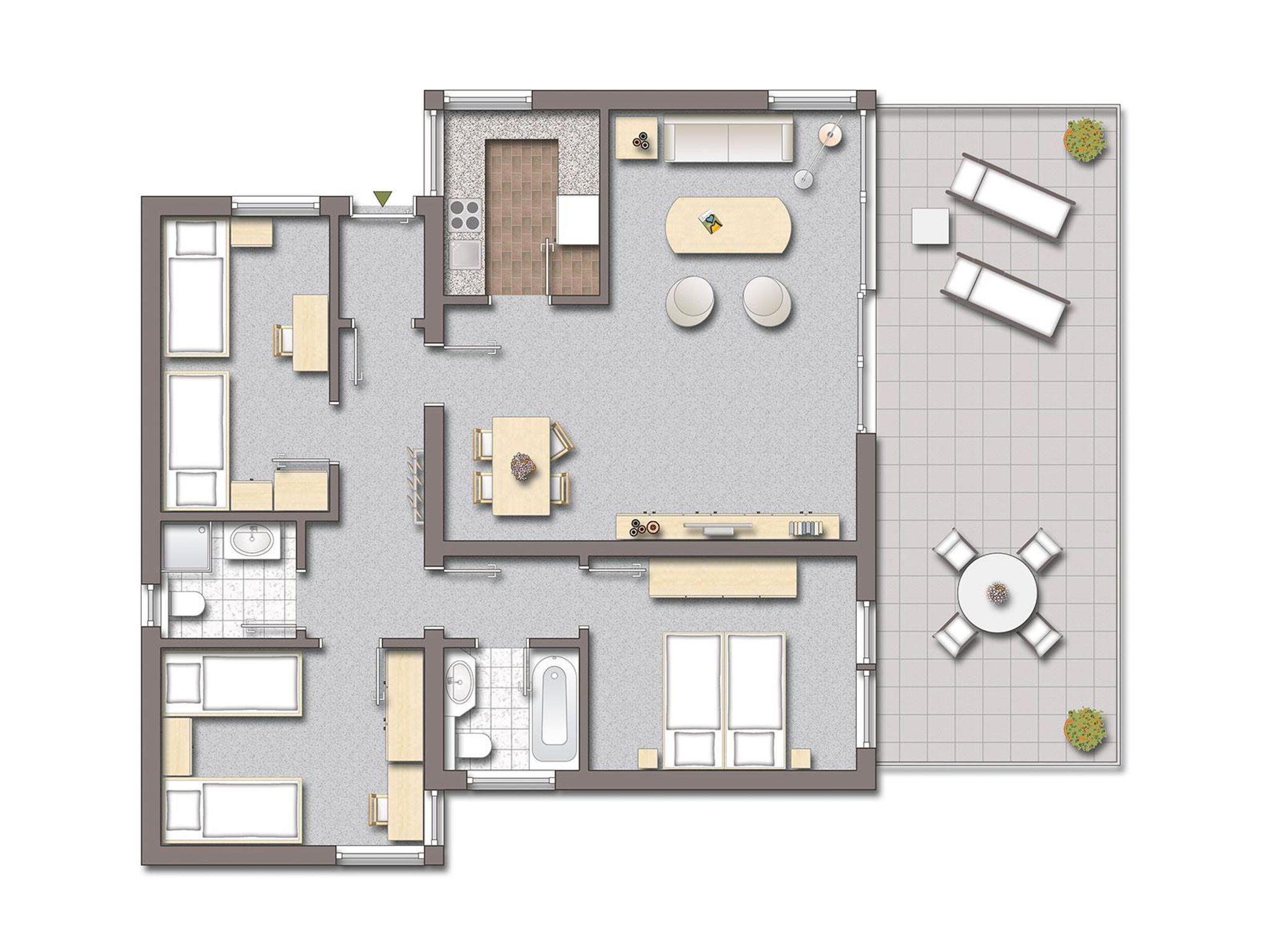 Gerade für Familien oder bei einem längeren Aufenthalt sind die geräumigen Ferienhäuser mit bis zu drei Schlafzimmern (max. 7 Pers.), Wohnzimmer, Küche, Balkon oder Terrasse eine ideale Wahl.