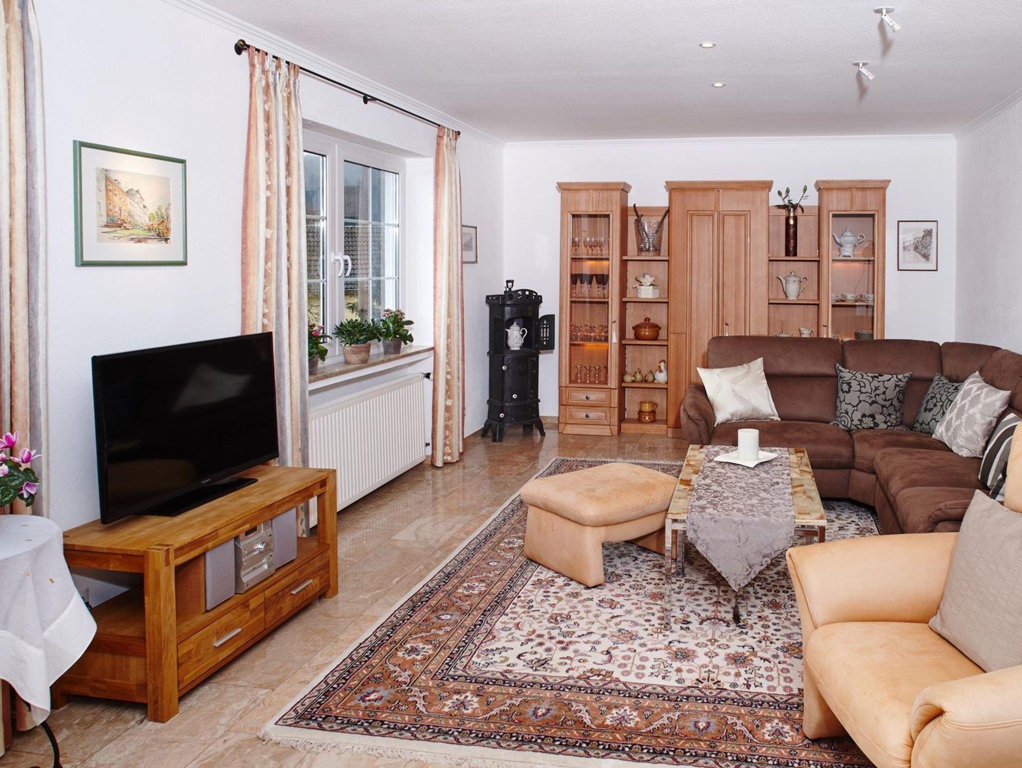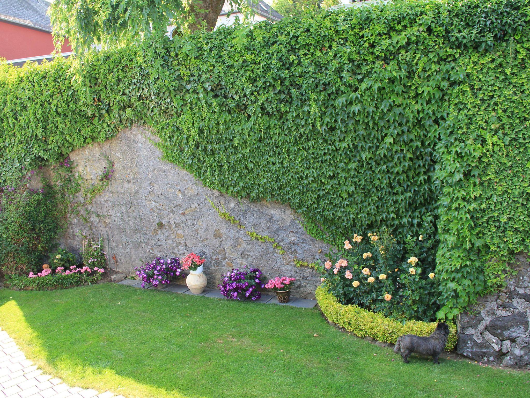Mitten in Daun, zentral gelegen und doch ruhig. Eine sehr schöne, komfortable 105 qm große Ferienwohnung. 2 Doppelschlafzimmer, eines mit TV. Ein romantischer Wintergarten mit schöner Aussicht. Ein großes Wohnzimmer (36 qm) sehr schön eingerichtet mit Blick ins Liesertal und Viadukt. Essecke mit 6 Stühlen, große gemütliche Couchgarnitur. TV, CD-Player, Radio, W-LAN und Internetanschluss sind vorhanden. Die Küche: Ceran-Kochfeld, Backofen, Mikrowelle, Geschirrspüler, Kühlschrank mit separater Gefrierbox, Toaster, Wasserkocher und vieles mehr. Badezimmer mit DU/WC, Waschbecken, Föhn und ein zusätzliches Gäste-WC. Der Garten, ein lauschiger Platz in Grünen, ist nicht einsehbar und begrenzt von einer hohen Wallmauer, bietet eine Liegewiese und für Sie eine reservierte Sitzgruppe. In einer abgeschlossenen Garage kann ein Auto-Stellplatz gemietet werden. Sie bietet auch Unterstellmöglichkeiten für Fahrräder.
