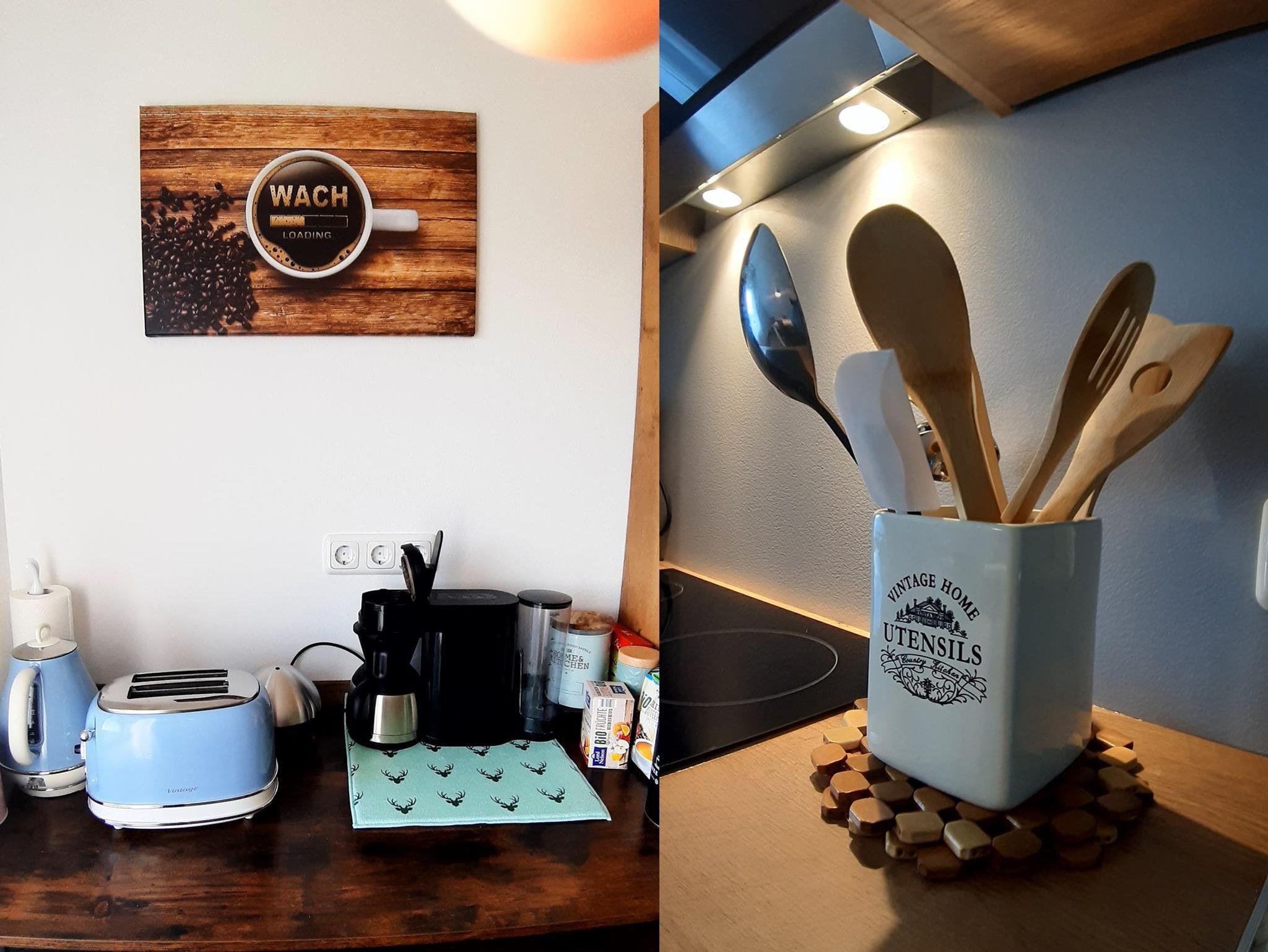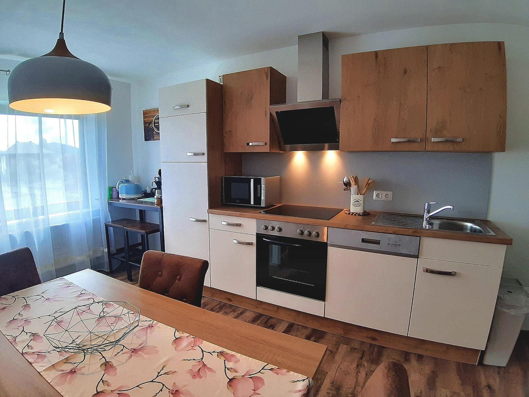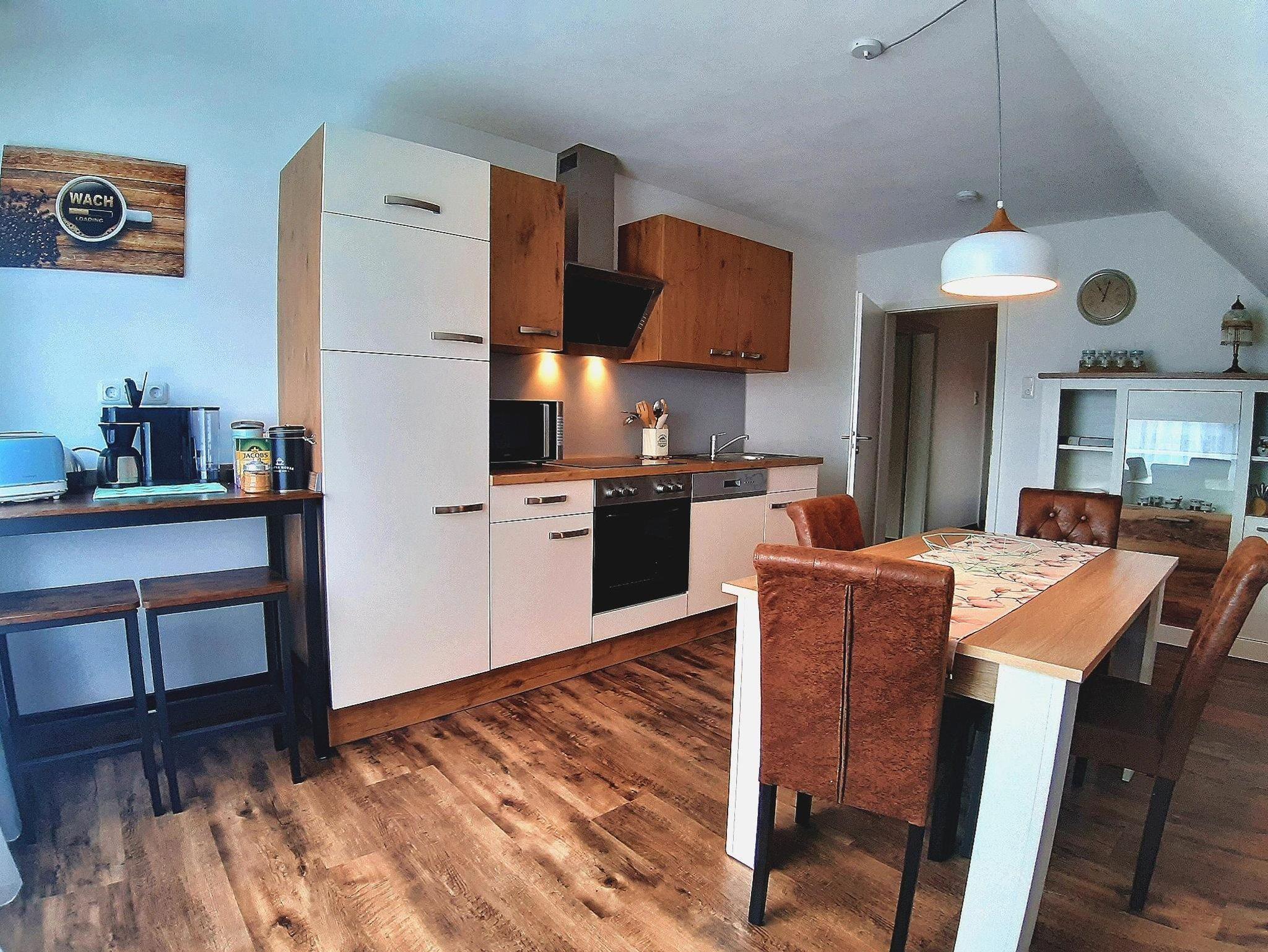 Die komplett eingerichtete Küche verfügt über einen Herd, Backofen, Mikrowelle, Kühl- Gefrierschrank, Kaffeemaschine, Wasserkocher, Toaster, Waffeleisen, Mixer, sonstige Küchenutensilien, Esstisch, 4 Stühle, sowie eine „Kaffee-Ecke“ mit 2 Hockern.