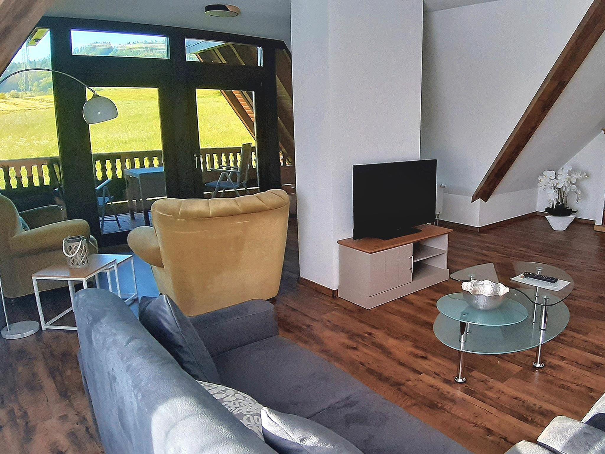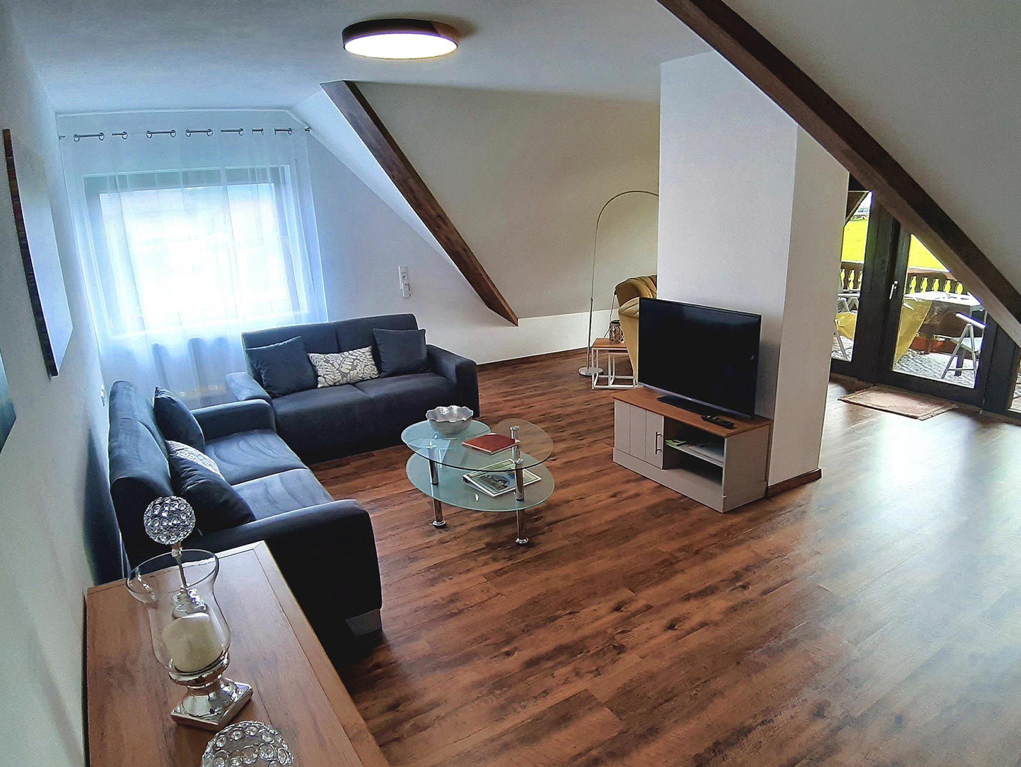 Das Wohnzimmer ist das Schmuckstück. Zur Ausstattung gehören 3er- und 2er Sofa mit Tisch, dazu eine Kommode + Bücherschrank + Sideboard. Fernseher, Radio und WLAN sind ebenso vorhanden. Auf dem Balkon stehen Stühle & Tische für einen gemütlichen Aufenthalt.