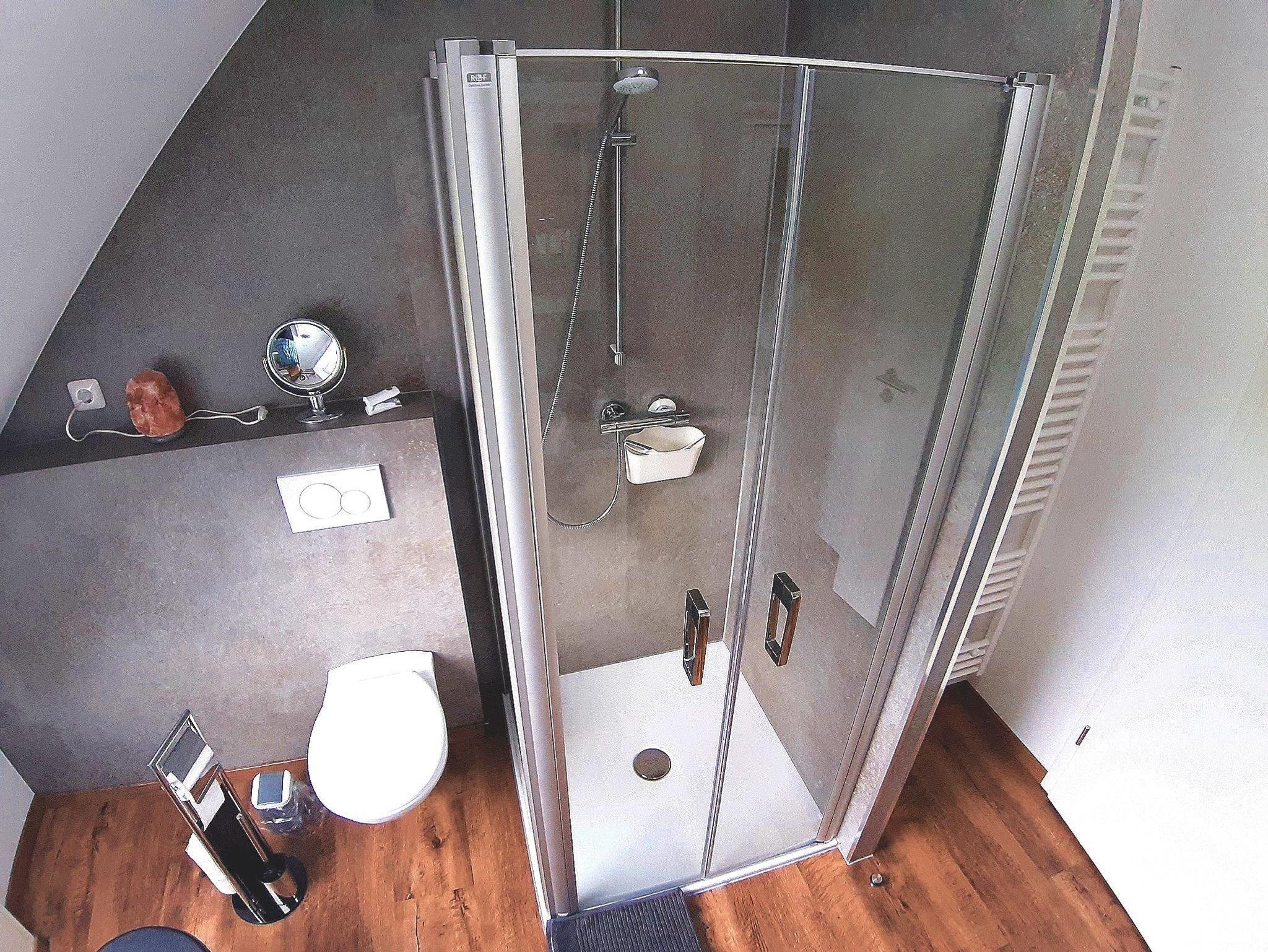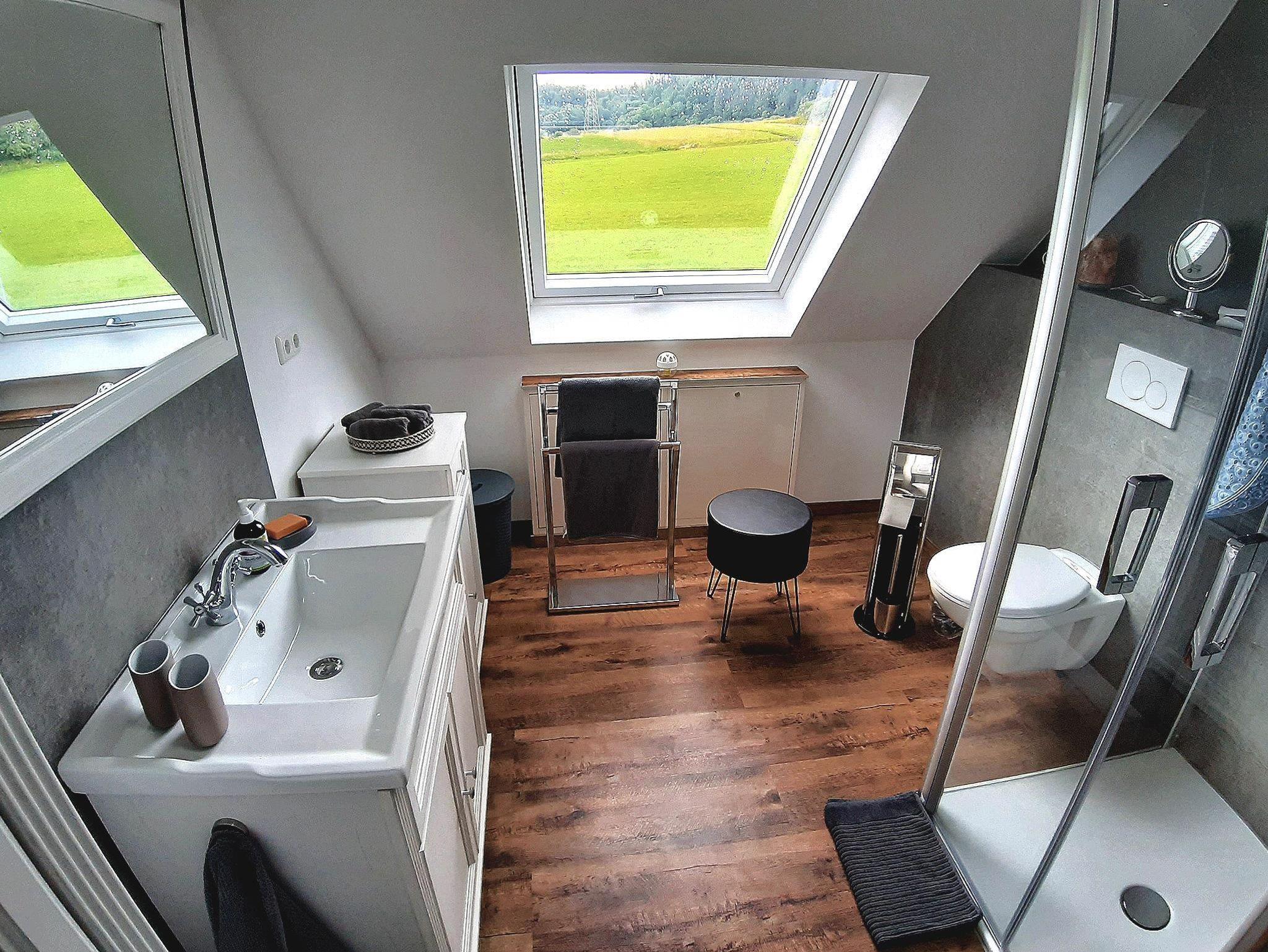 Das Badezimmer verfügt über eine Dusche (ebenerdig), WC, Waschtisch mit Unterschrank/Spiegel & Hochschrank, sowie über einen Föhn.