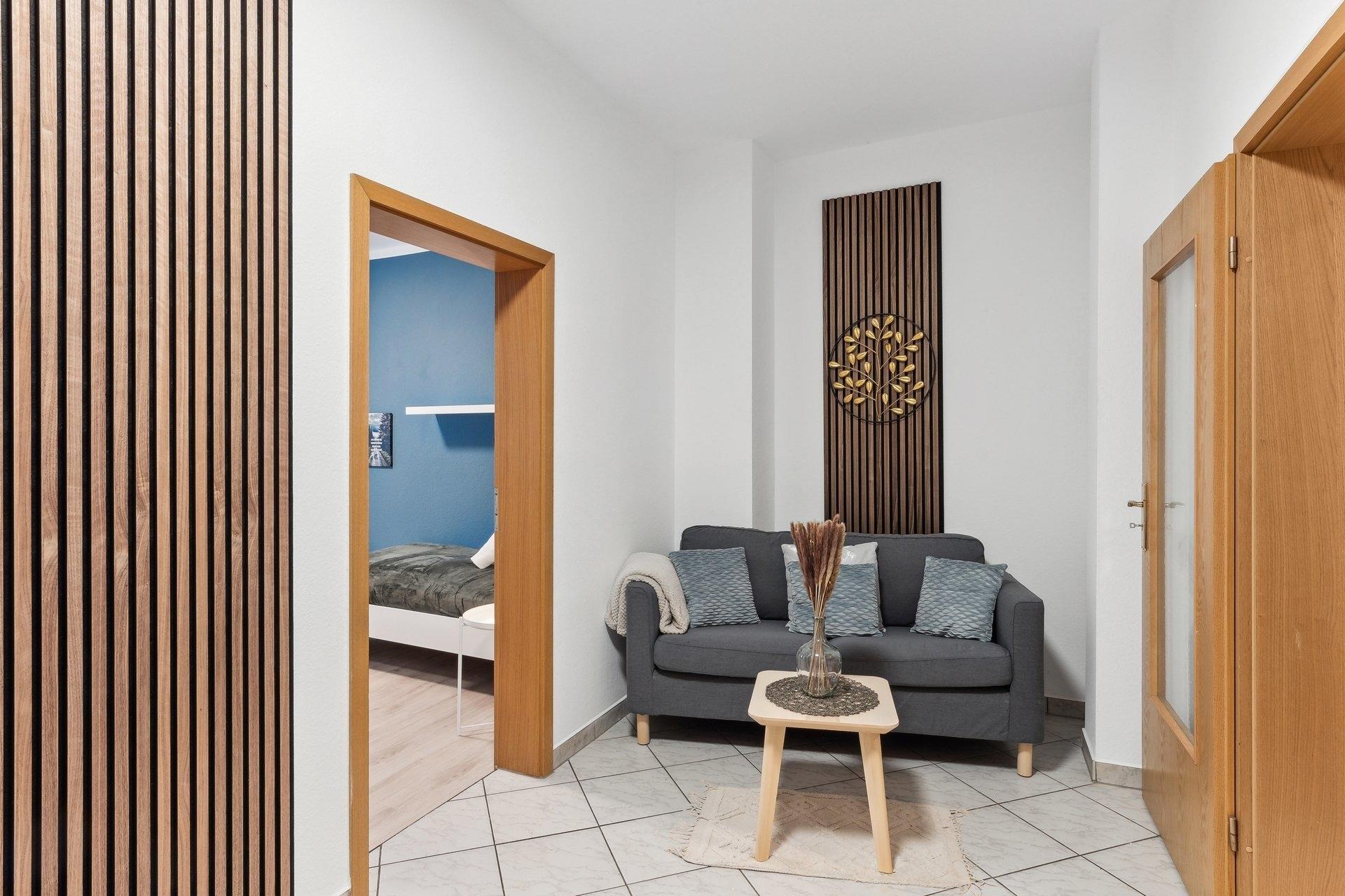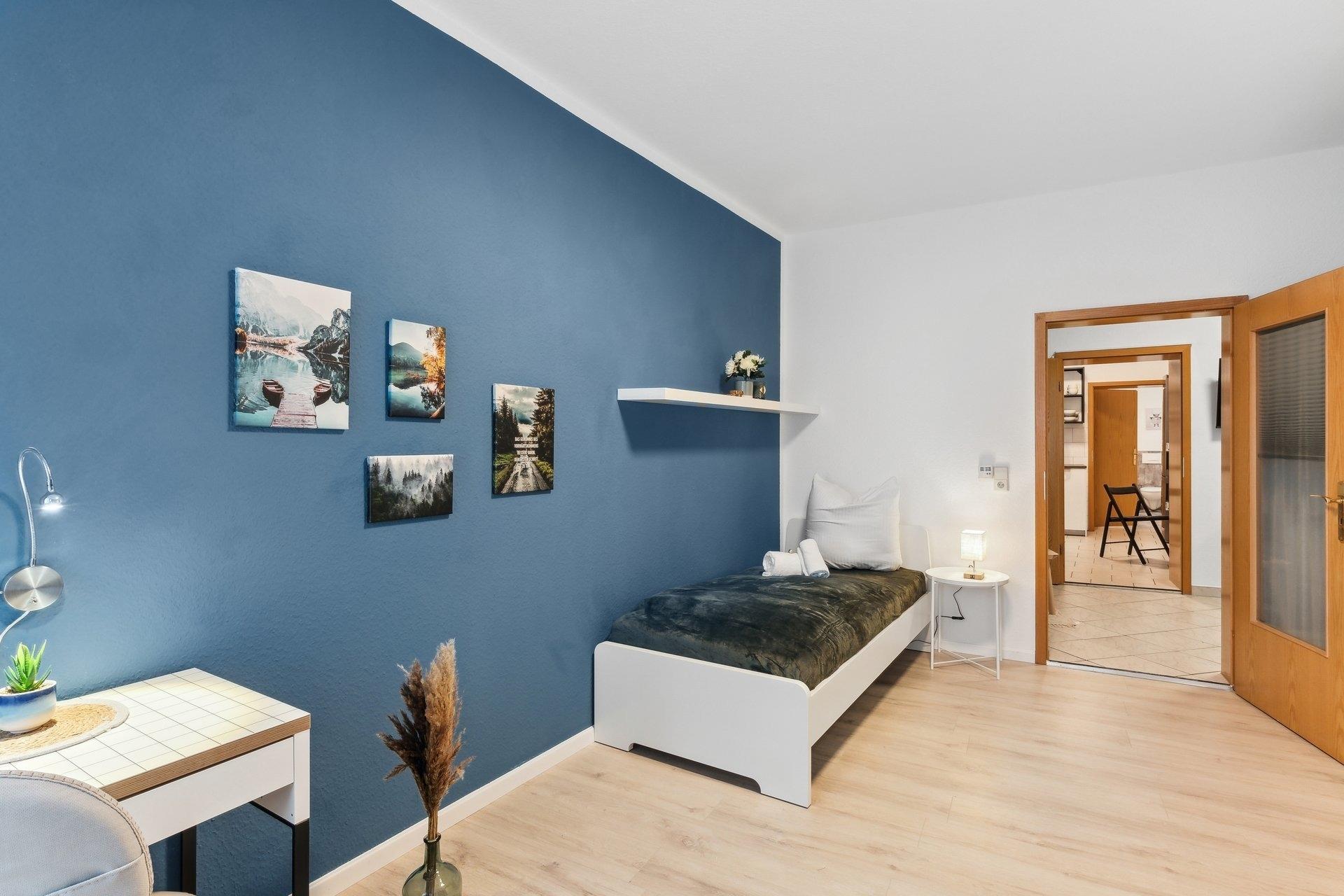 In unserer zentralen großen Wohnung finden bis zu 6 Personen Platz zum Übernachten im schönen Delitzsch. Im Winter warm dank Fußbodenheizung, im Sommer angenehm durch die Lage im Erdgeschoss. Jeder Schlafraum verfügt über zwei Einzelbetten mit EmmaOne Matratzen, viel Stauraum und einen Arbeitsplatz. Für eine gemeinsame schöne Zeit gibt es, neben dem Essbereich in der voll ausgestatteten Küche, eine Sitzecke mit Smart-TV. Im Bad gibt es neben Dusche und Wanne eine Waschmaschine +Waschtrockner.