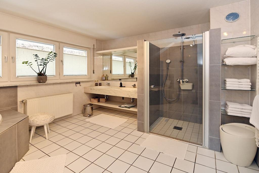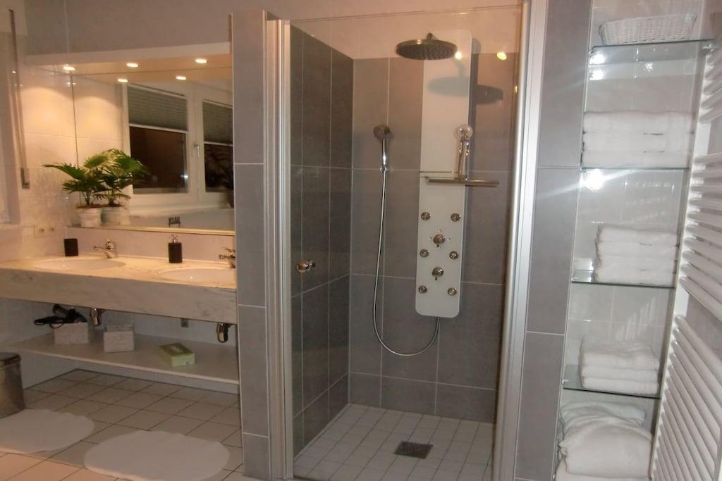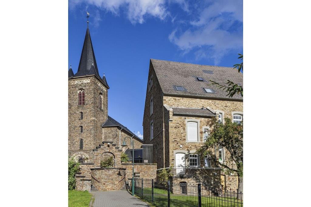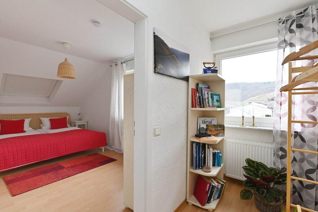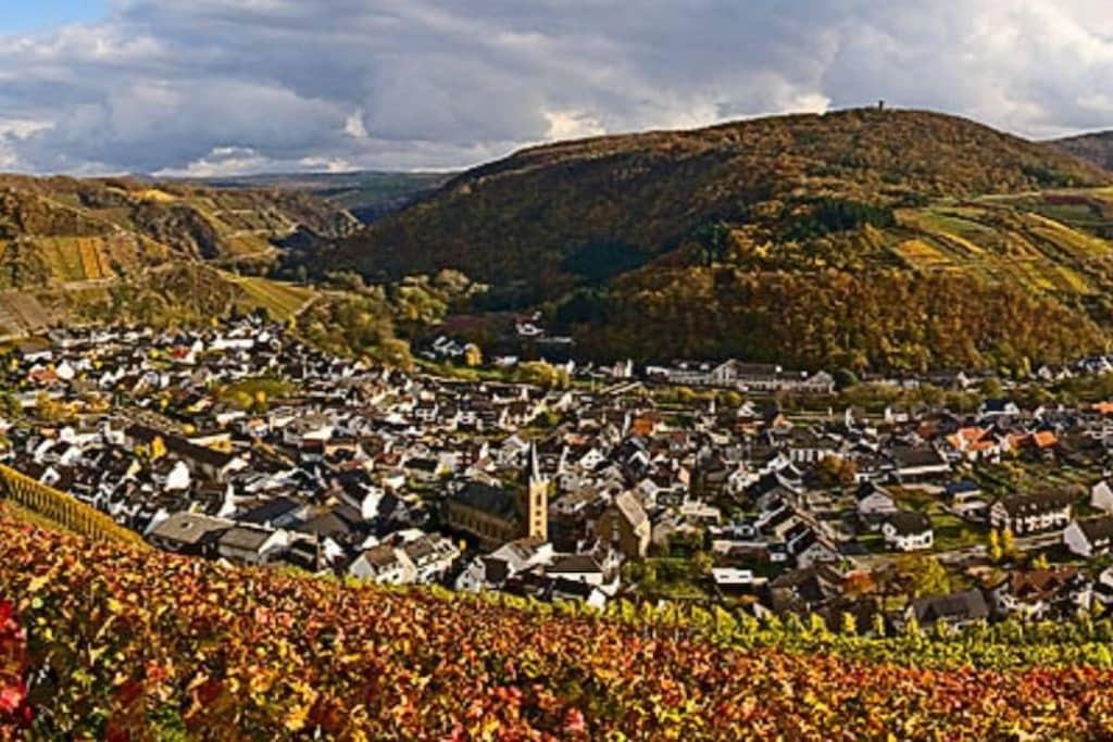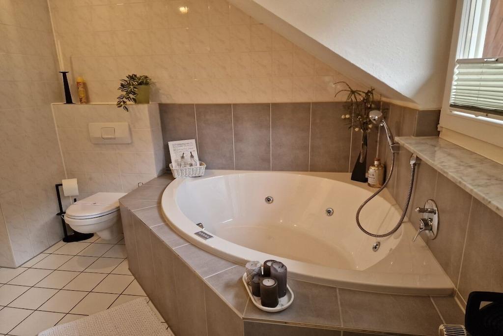 Romantisk wellness-ferielejlighed, lys og indbydende i eksklusive omgivelser, med spabad til to personer i det luksuriøse badeværelse, inviterer dig til at forkæle dig selv og slappe af. Badeværelse (brusepanel med regnbruser, massagedyser, dobbelt håndvask). Køkkenet er udstyret med topmoderne apparater, krydderier, kaffe, te osv. Til afslappende aftener kan du nyde vine fra Meyer-Näkel-vingården (vinkælderpris). Rigelige håndklæder og friskredte senge er inkluderet. Der er også bløde badekåber (babyseng og højstol). Drømmeagtig udsigt over Dernau. Näkel-ferievillaen i Dernau ligger i Pfarrwingert-vingården og består af tre lejligheder: Sonnenberg (45 kvm), Pfarrwingert (75 kvm) og Hardtberg (55 kvm) (maks. 14 personer).