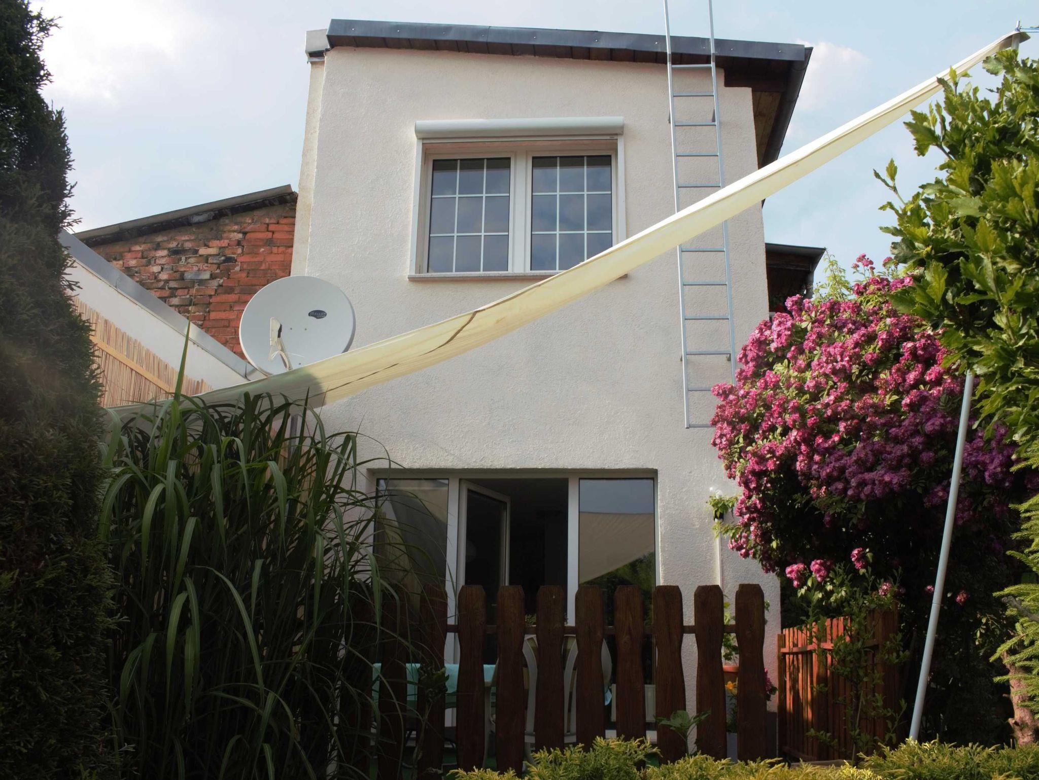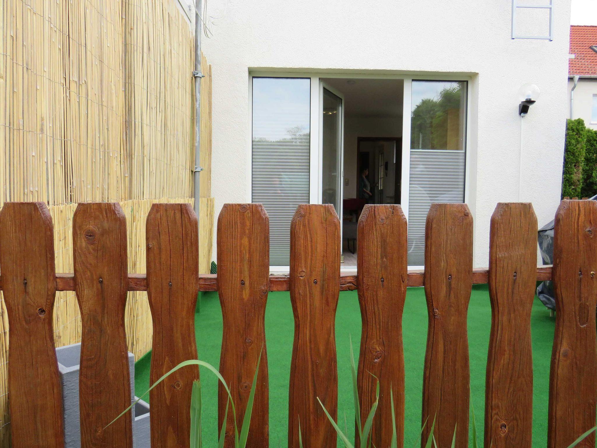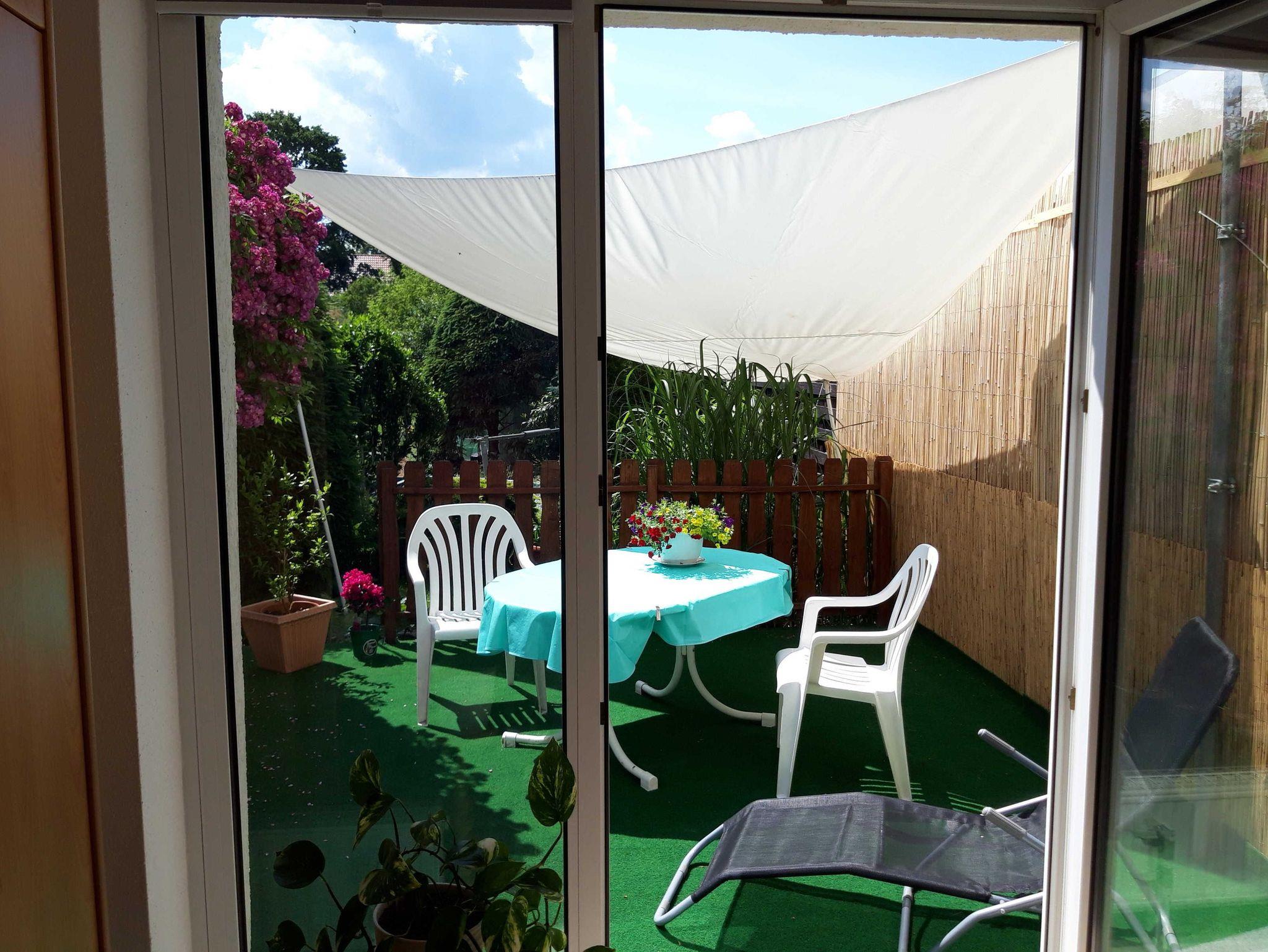 Die Süd-Terrasse des Nichtraucher- Apartment am Klinikum, dass sich im Erdgeschoss des Nebengebäudes befindet, lädt mit Blick in den Hausgarten und auf die Melanchtonkirche (200 m) zum Verweilen ein. Ein Sonnensegel beschattet von Mai bzw. Juni bis ca. Oktober des Jahres einen Teil der Süd-Terrasse, die durch eine Balkontür zu erreichen ist und ca. 20 cm tiefer liegt als das Apartment.