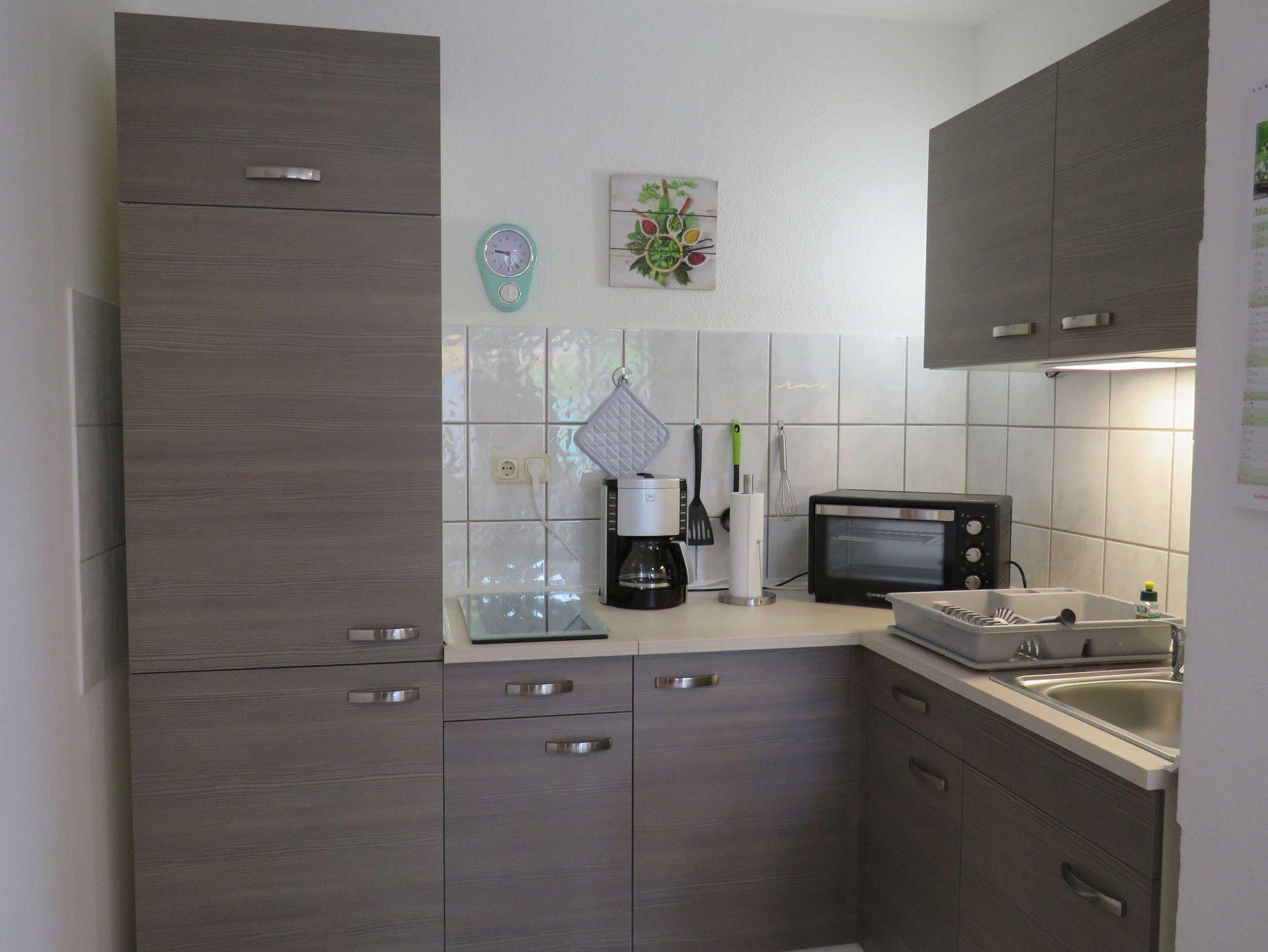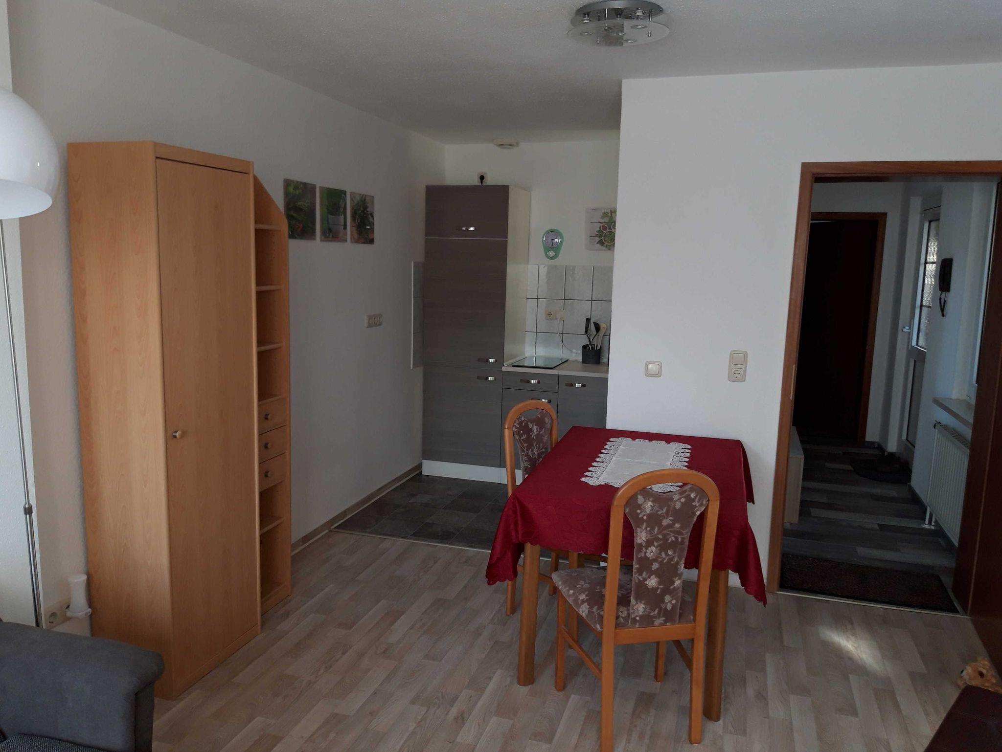 Sie Wohnen und Schlafen in einem separat abschließbaren Raum mit Doppel-Schlafcouch (Nutzun2 für Aufbettung) und offener kleiner Küche mit Abzug, Kühlschrank, Kaffeemaschine, Wasserkocher, Toaster und kleinen Backofen. Das Apartment befindet sich am Ende eines kurzen Flurs, über den auch Ihre Dusche/WC (gegenüber der Eingangstür) und die hauseigenen Wirtschaftsräume, die nur vom Gastgeber genutzt werden, erreichbar sind.