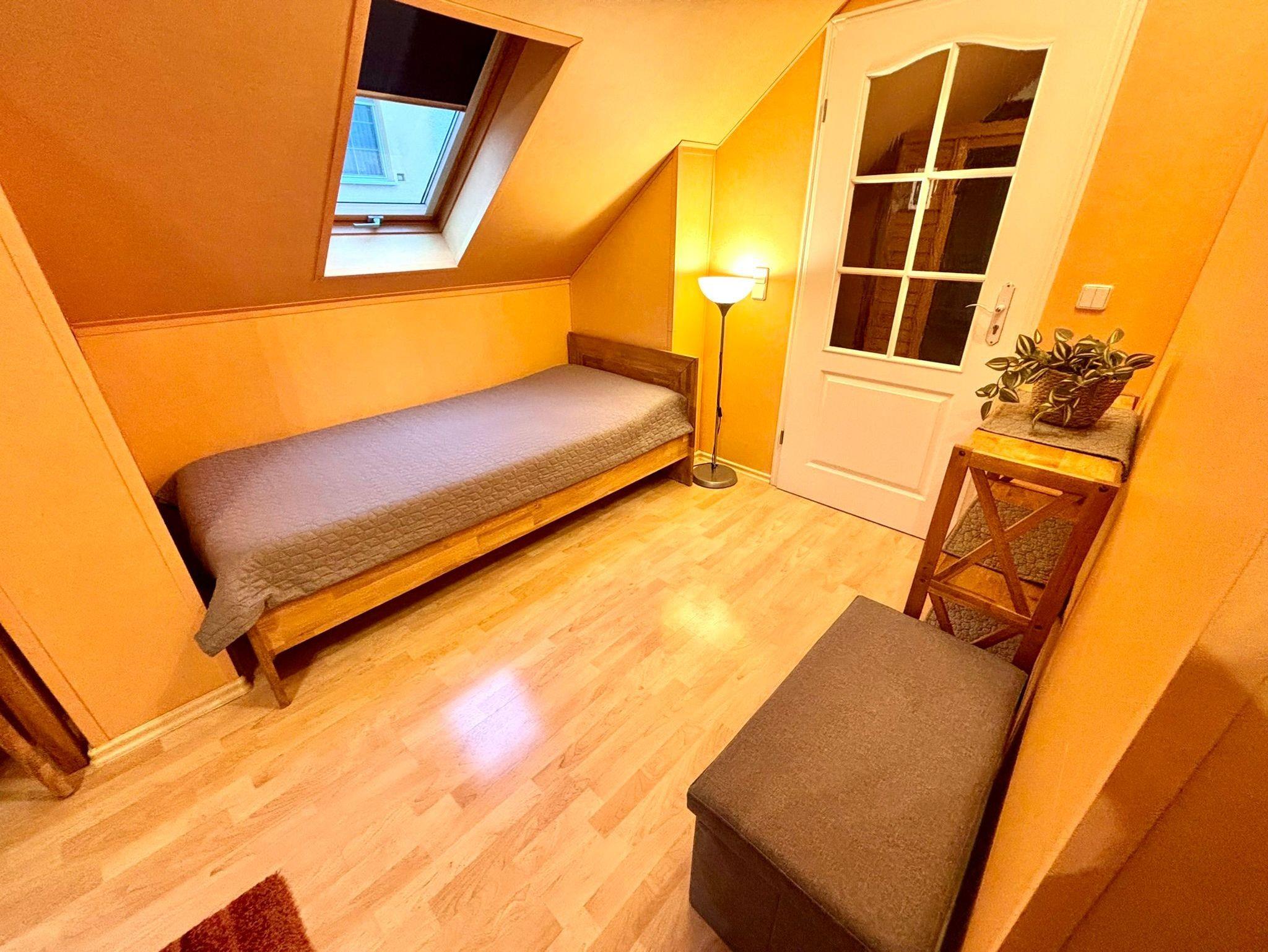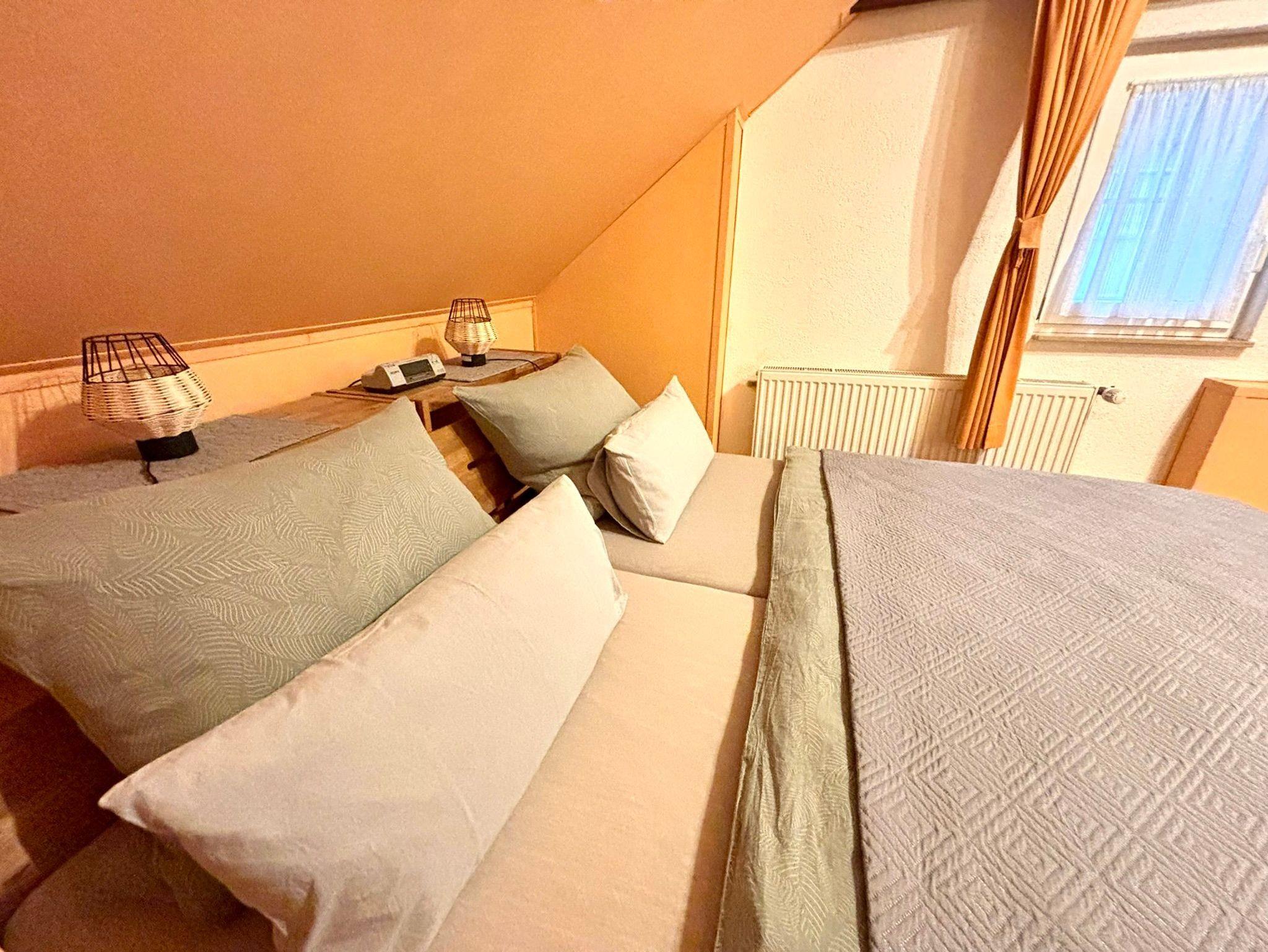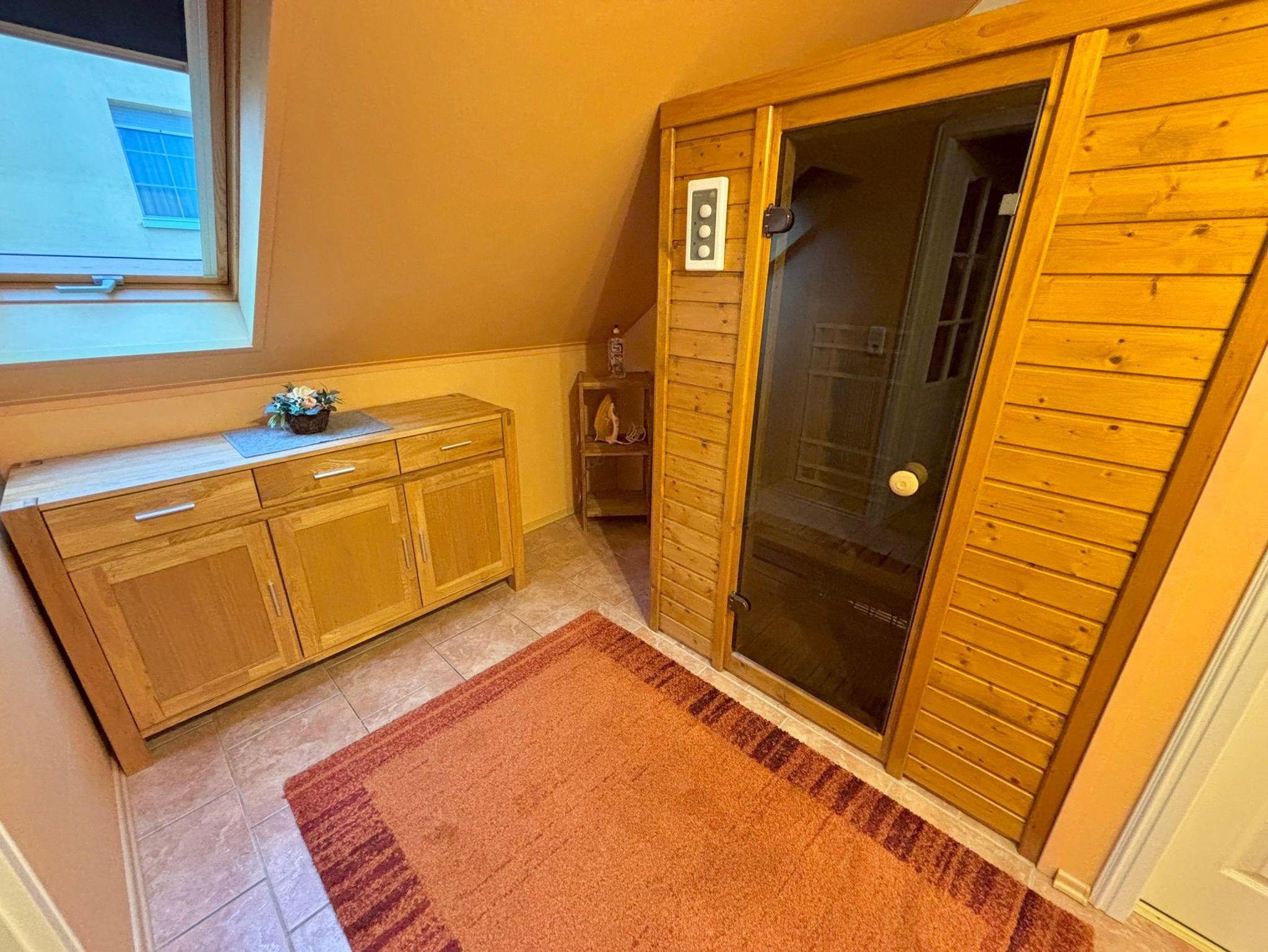 Das Obergeschoss ist 39 m² groß. Die im Flur befindliche Infrarotsauna, kann für einen kleinen Aufpreis benutzt werden. Das Schlafzimmer beinhaltet ein Doppelbett und ein Einzelbett, sowie eine kleine Sitzecke. Im großen Badezimmer befindet sich eine Badewanne und eine Dusche.