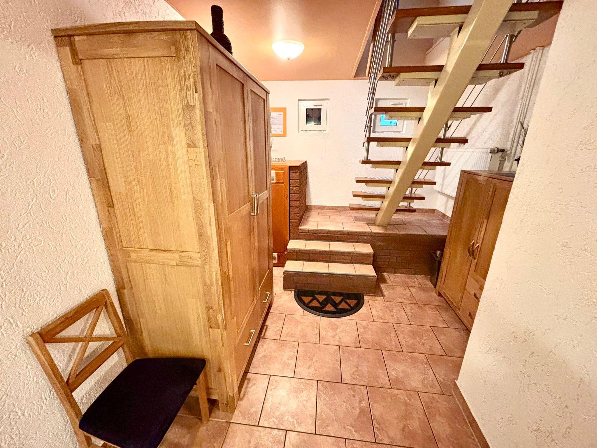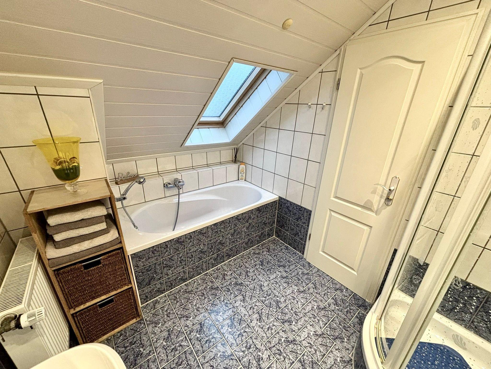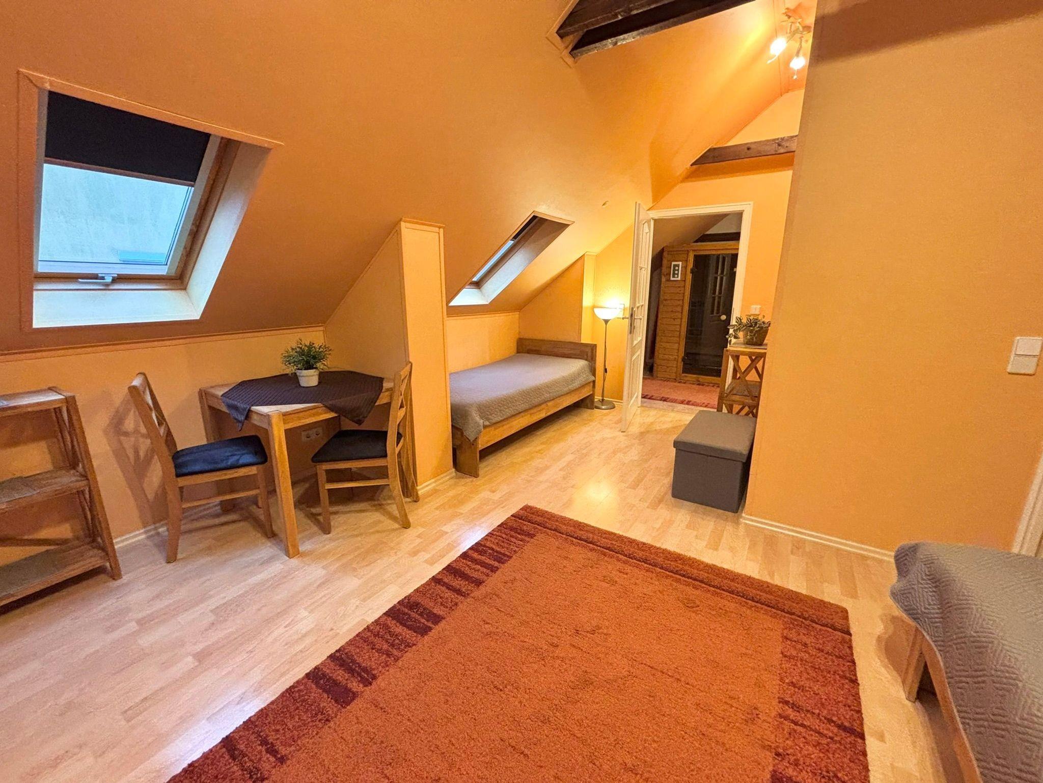 Das Obergeschoss ist 39 m² groß. Die im Flur befindliche Infrarotsauna, kann für einen kleinen Aufpreis benutzt werden. Das Schlafzimmer beinhaltet ein Doppelbett und ein Einzelbett, sowie eine kleine Sitzecke. Im großen Badezimmer befindet sich eine Badewanne und eine Dusche.