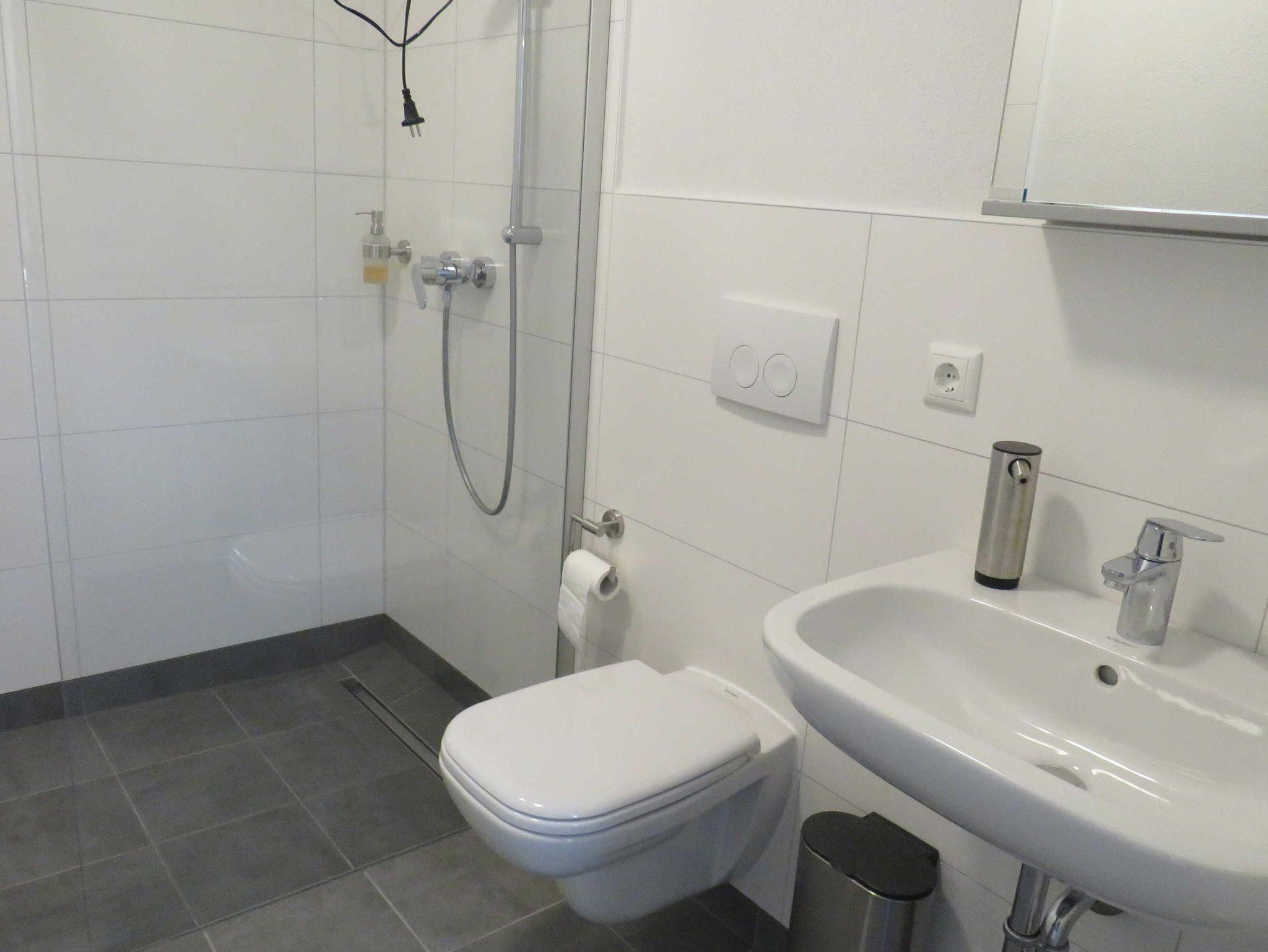 Das Badezimmer ist mit Dusche und WC ausgestattet. TV, WLAN und Klimaanlage sind vorhanden.