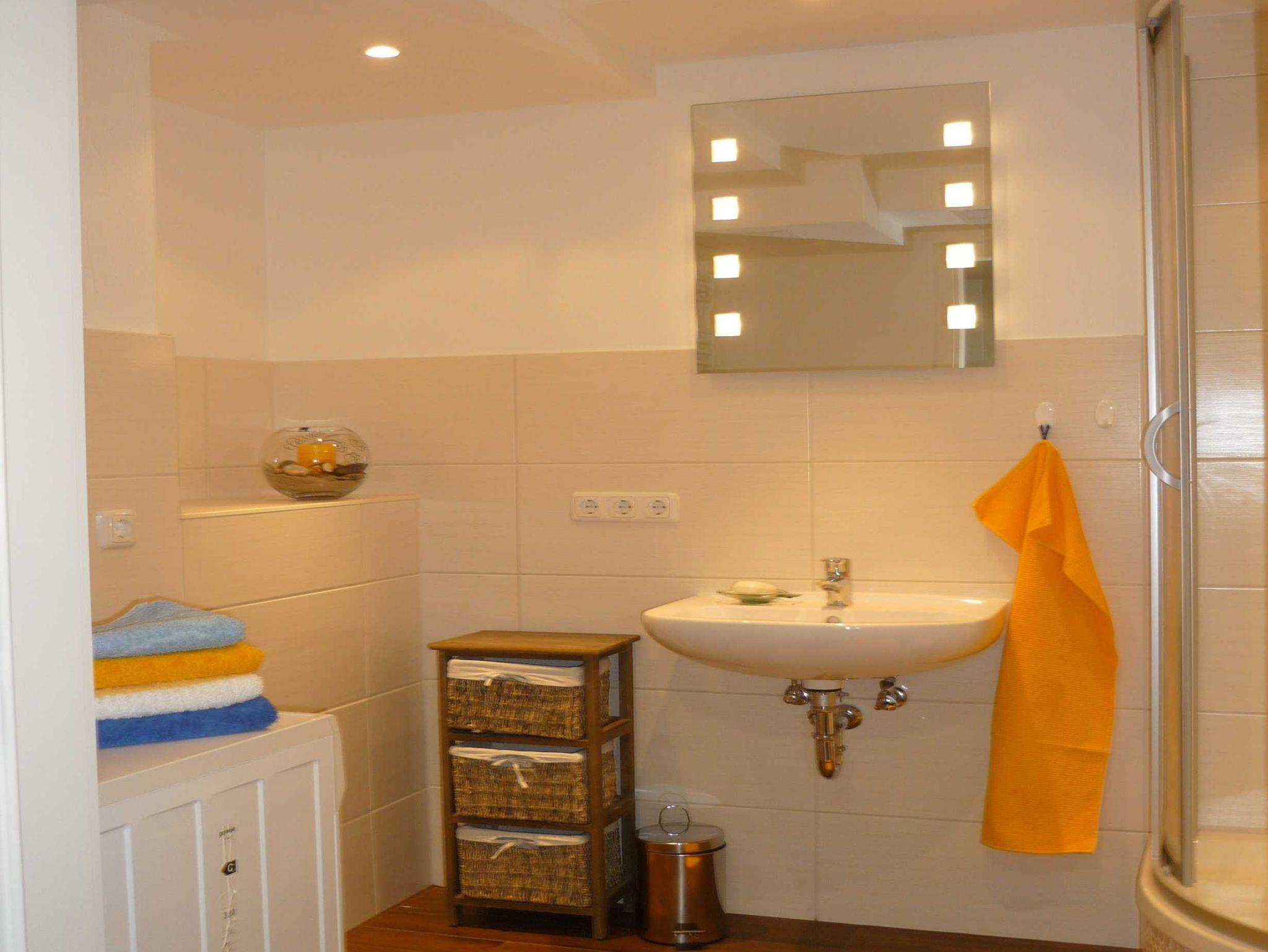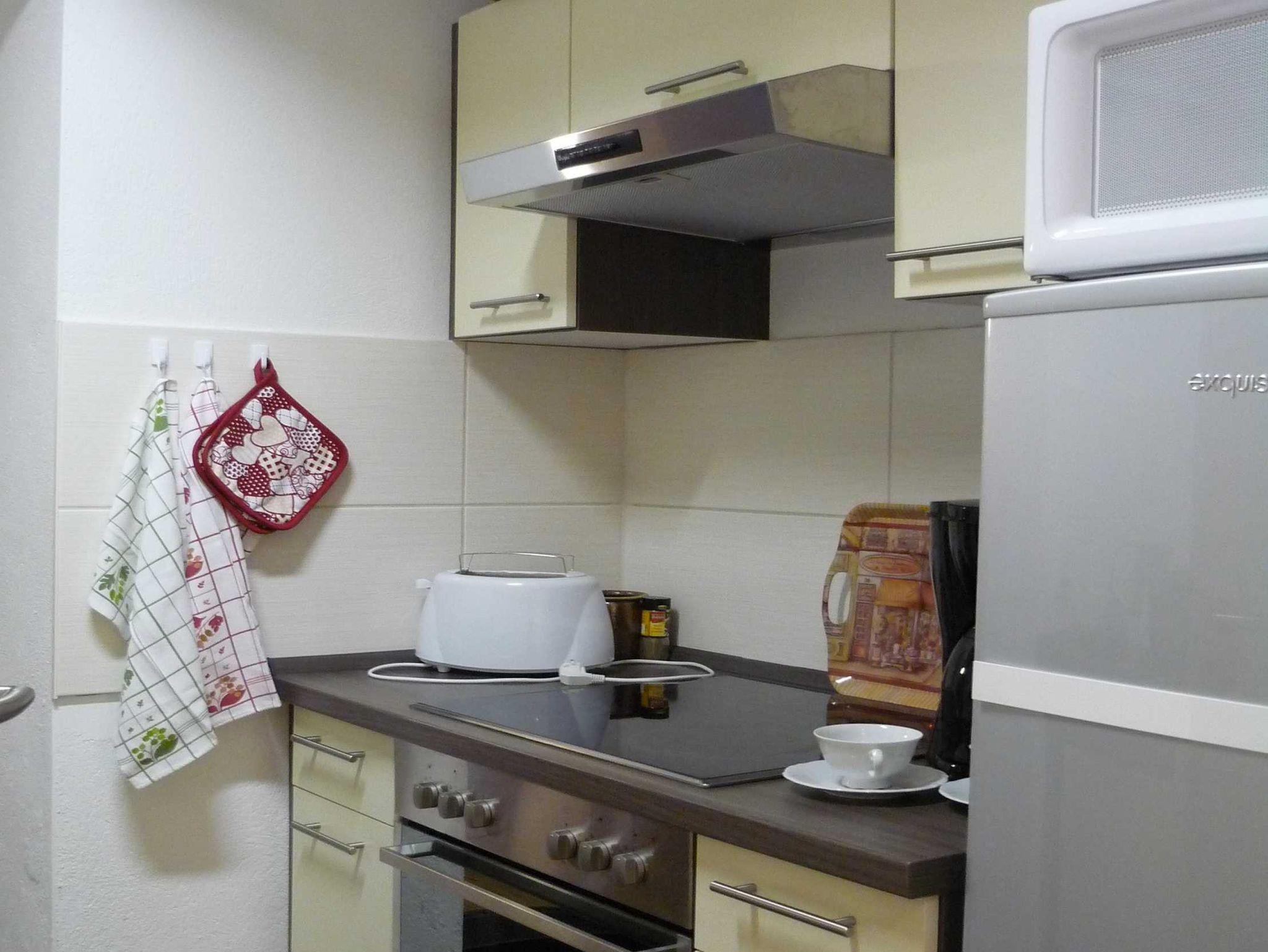 Ferienwohnung mit 2 kombinierten Wohn-Schlafräumen in offener Gestaltung, Essbereich, Küchenbereich, Bad und Eingangsbereich. 2 Fahrräder können gestellt werden.