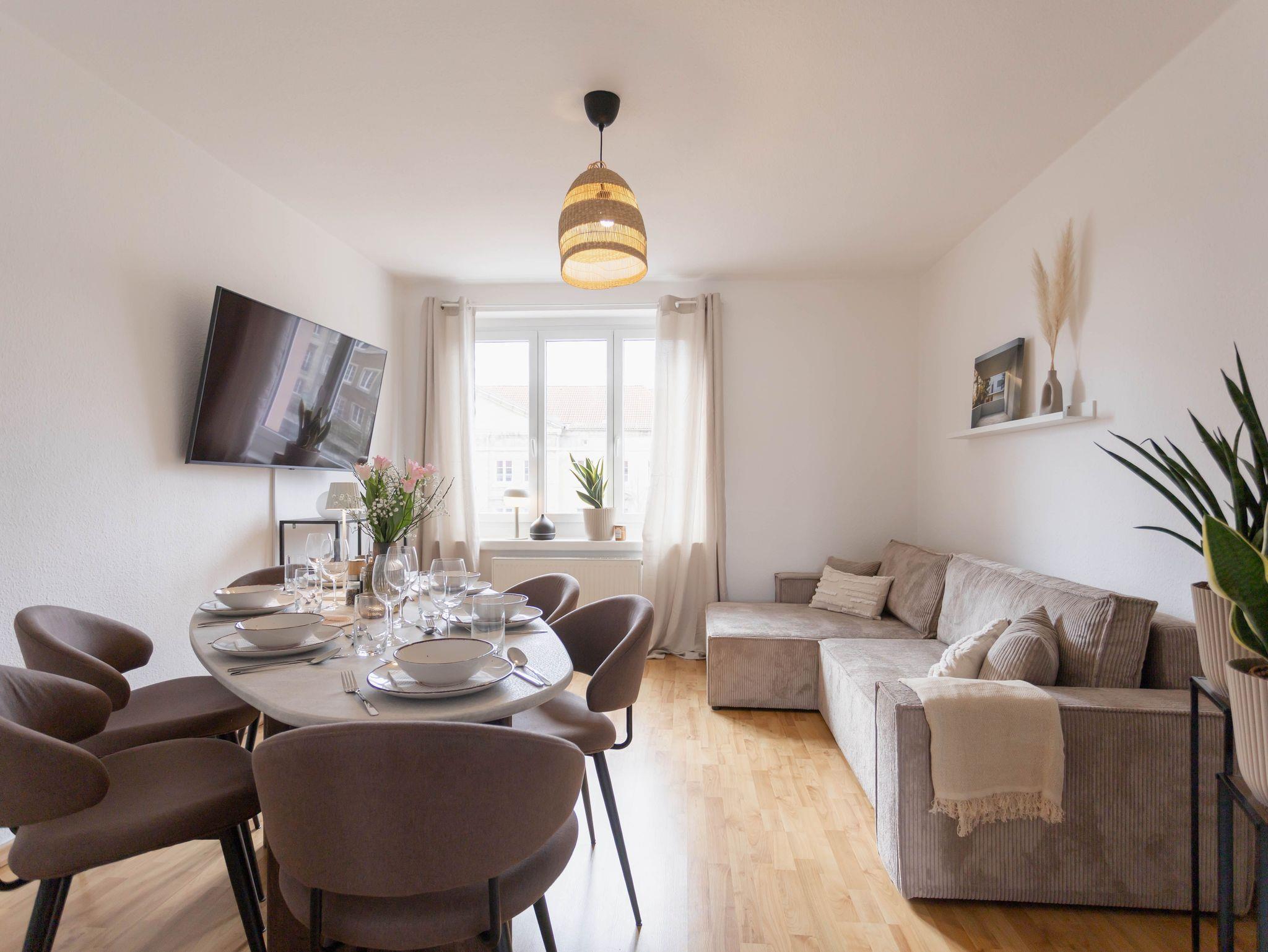 Das Apartment ist mit hochwertigen Möbeln ausgestattet und bietet Schlafplätze für 8 Personen. Es steht Ihnen ein kostenfreier Parkplatz, sowie kostenfreies WLAN zur Verfügung. Hausiere sind bei uns herzlich Willkommen!