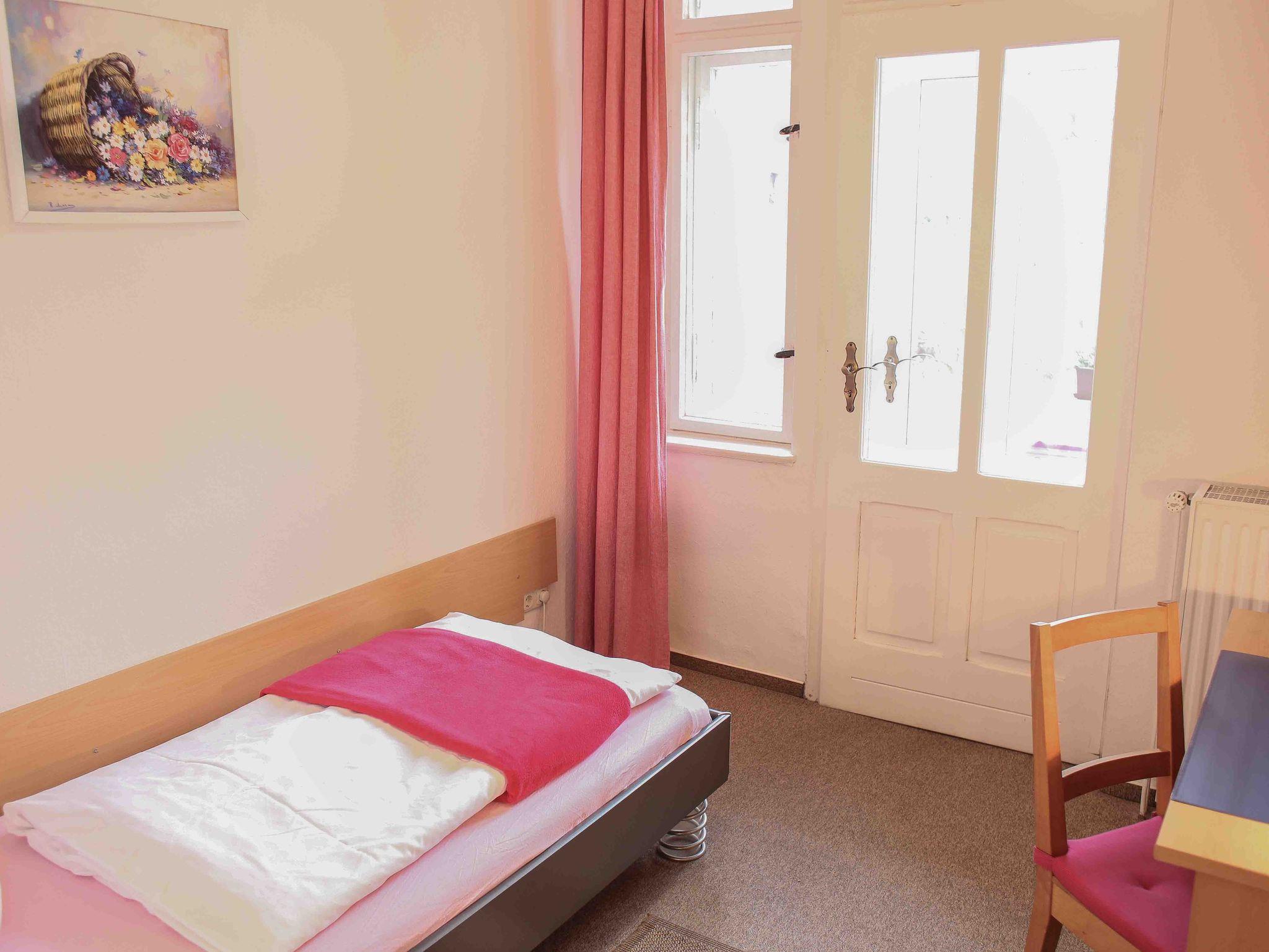 Das helle Zimmer hat hohe Fenster und eine Stuckdecke. Ein Verdunklungsvorhang ist vorhanden.
