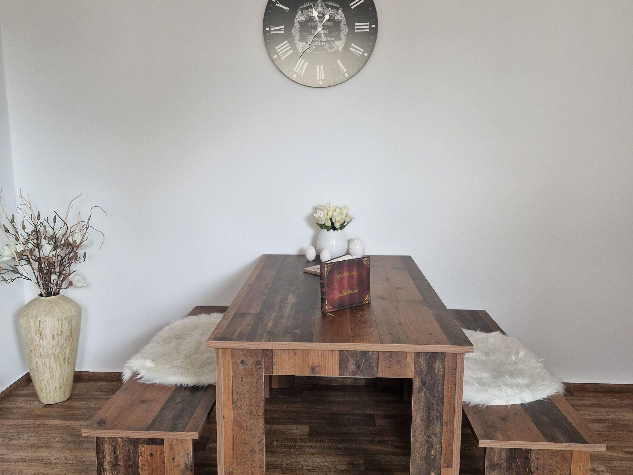 Das Wohnzimmer ist mit einem SmartTV, einer gemütlichen Schlafcouch für 2 Personen sowie einem großen Esstisch für gessellige Abende, ausgestattet.