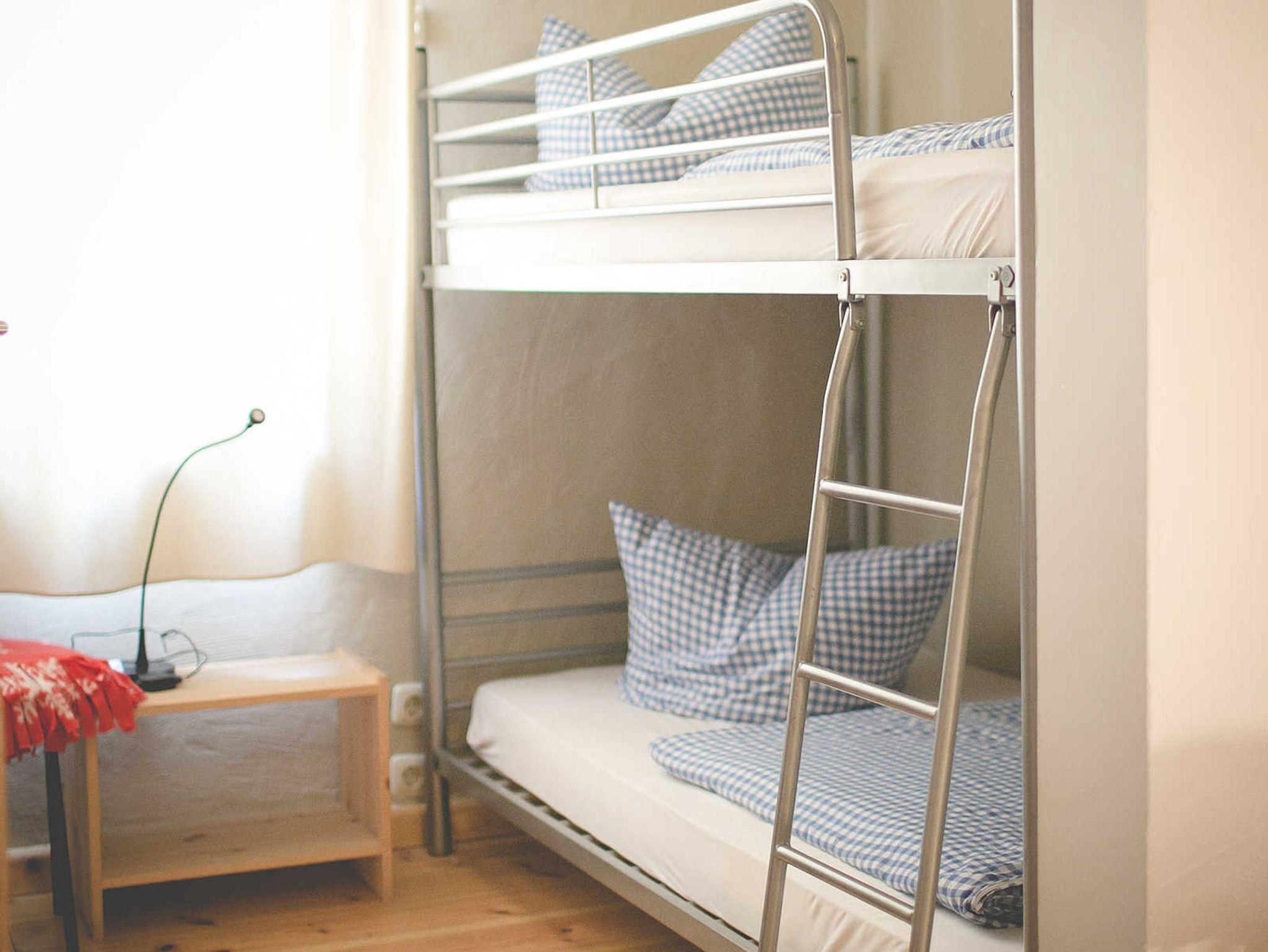 Modernes Mehrbettzimmer mit Hochbett und Doppelbett sowie Dusche und WC.
