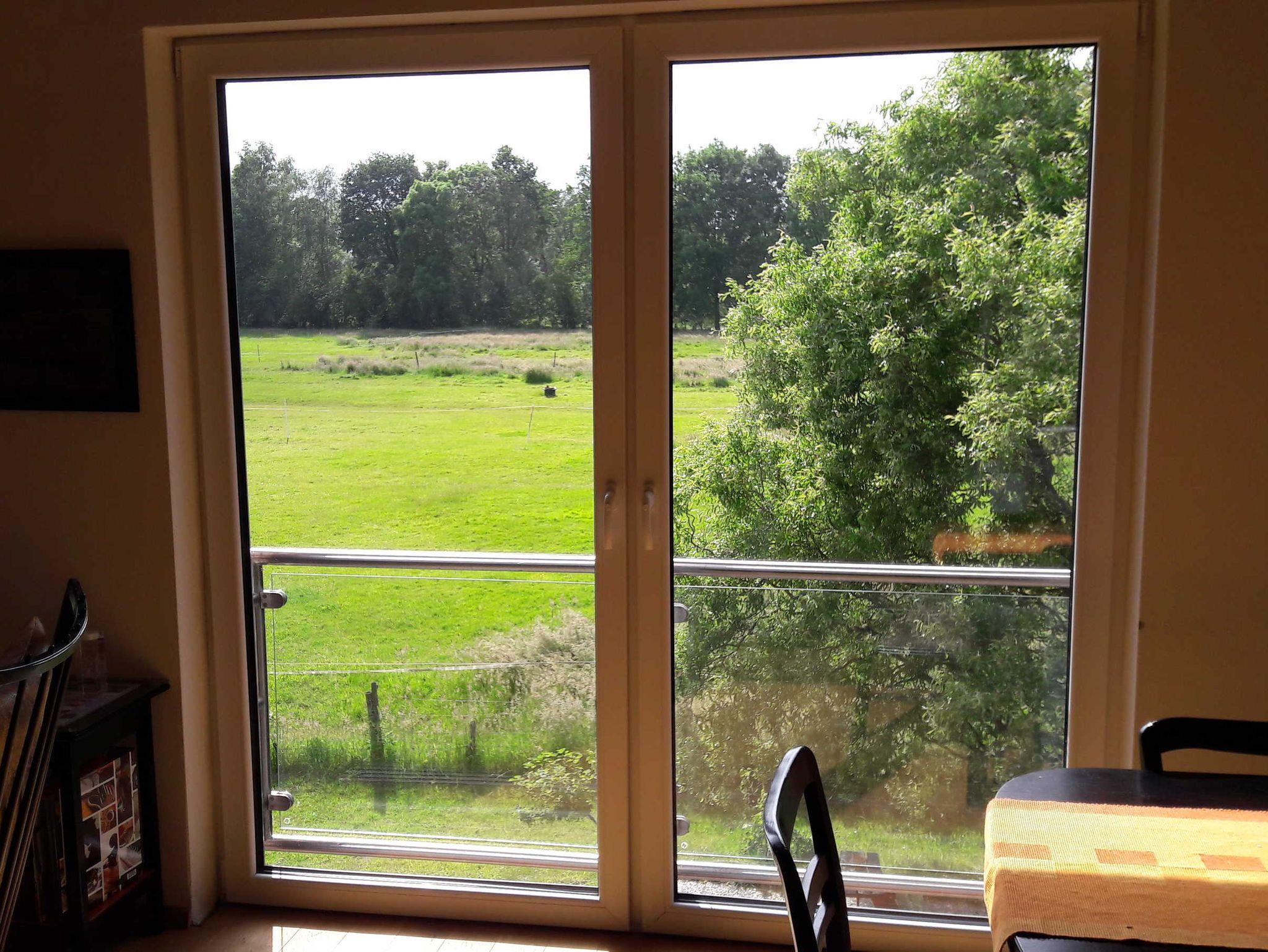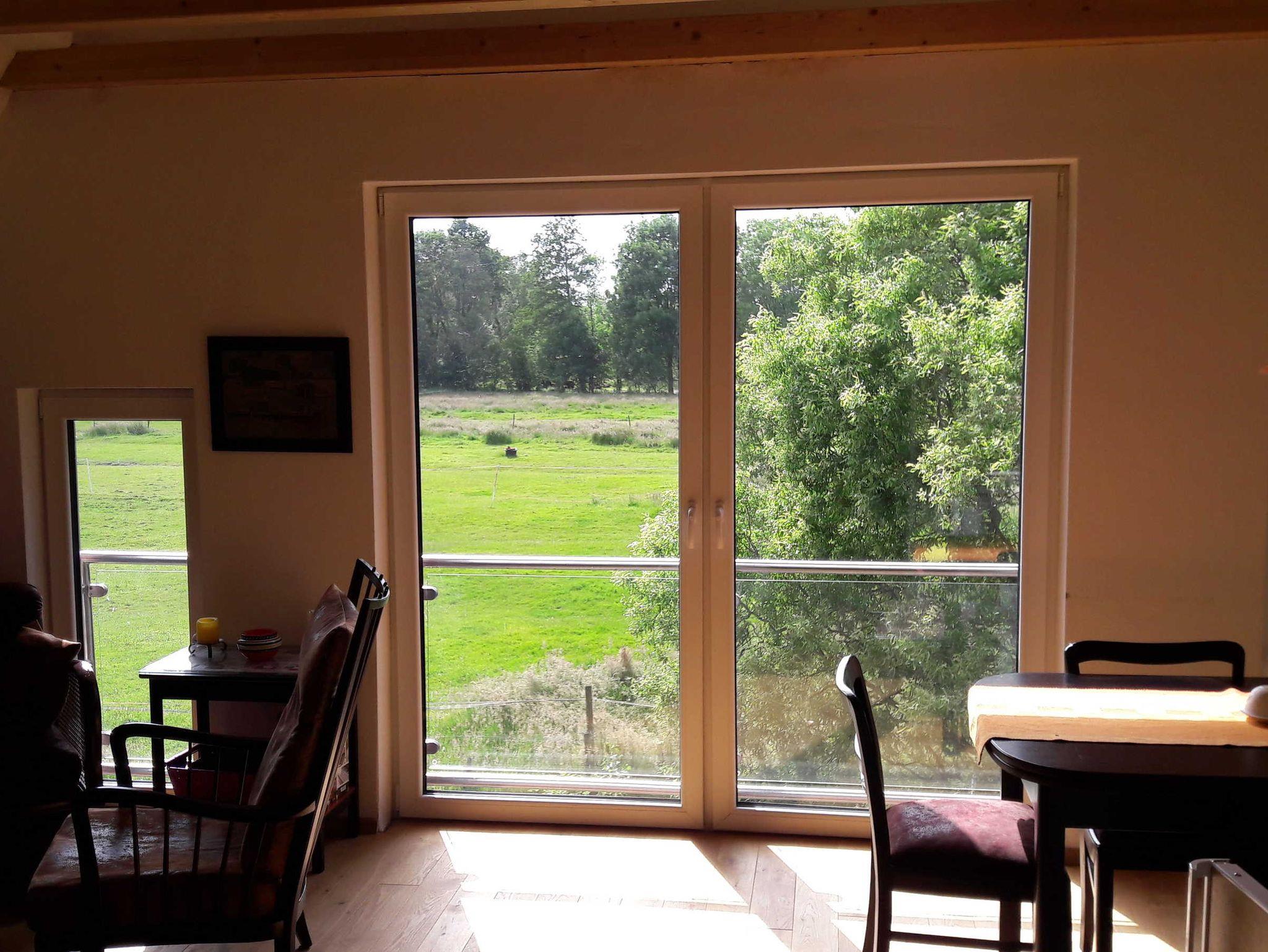 Der zugehörige Grillplatz mit Gartenmöbeln befindet sich geschützt hinter dem Haus und ist von der Küche aus einsehbar. Von dort haben Sie einen wunderbaren Blick auf die grasenden Pferde und ein Storchenpaar, dass bei uns Quartier bezogen hat. Der Fitnessraum zur Mitbenutzung befindet sich im benachbarten Gulfhof.
