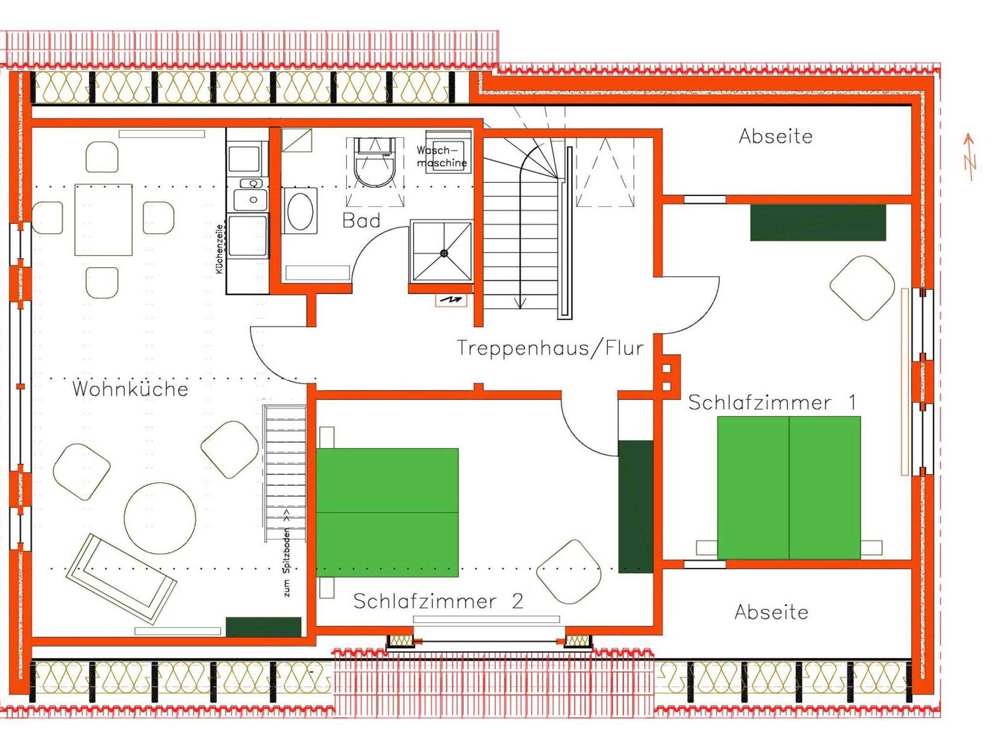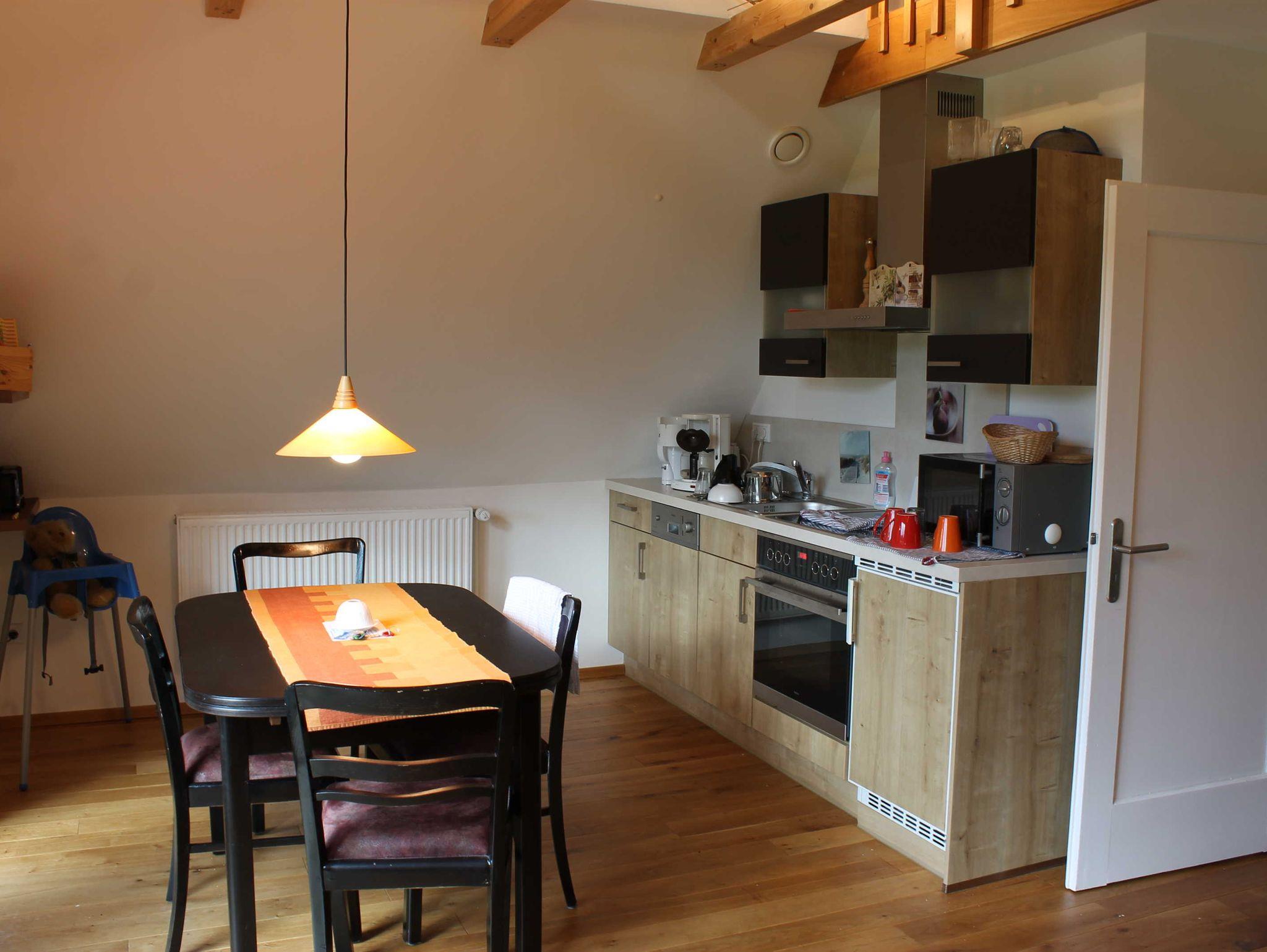 Zu dieser 97 m² großen Maisonette-Wohnung gehören ein Wohn-/Esszimmer mit komplett ausgestatteter Einbauküche, Kinderhochstuhl, TV-SAT, Radio, CD-Player, 3 Doppelzimmer, Kinderreisebett, ein Badezimmer mit Dusche, WC, Wickeltisch und Waschmaschine, ein Abstellraum. Die Wohnung erstreckt sich über 2 Ebenen und beeindruckt durch den Panoramablick auf die angrenzende Pferdeweide sowie unseren historischen Gulfhof.
