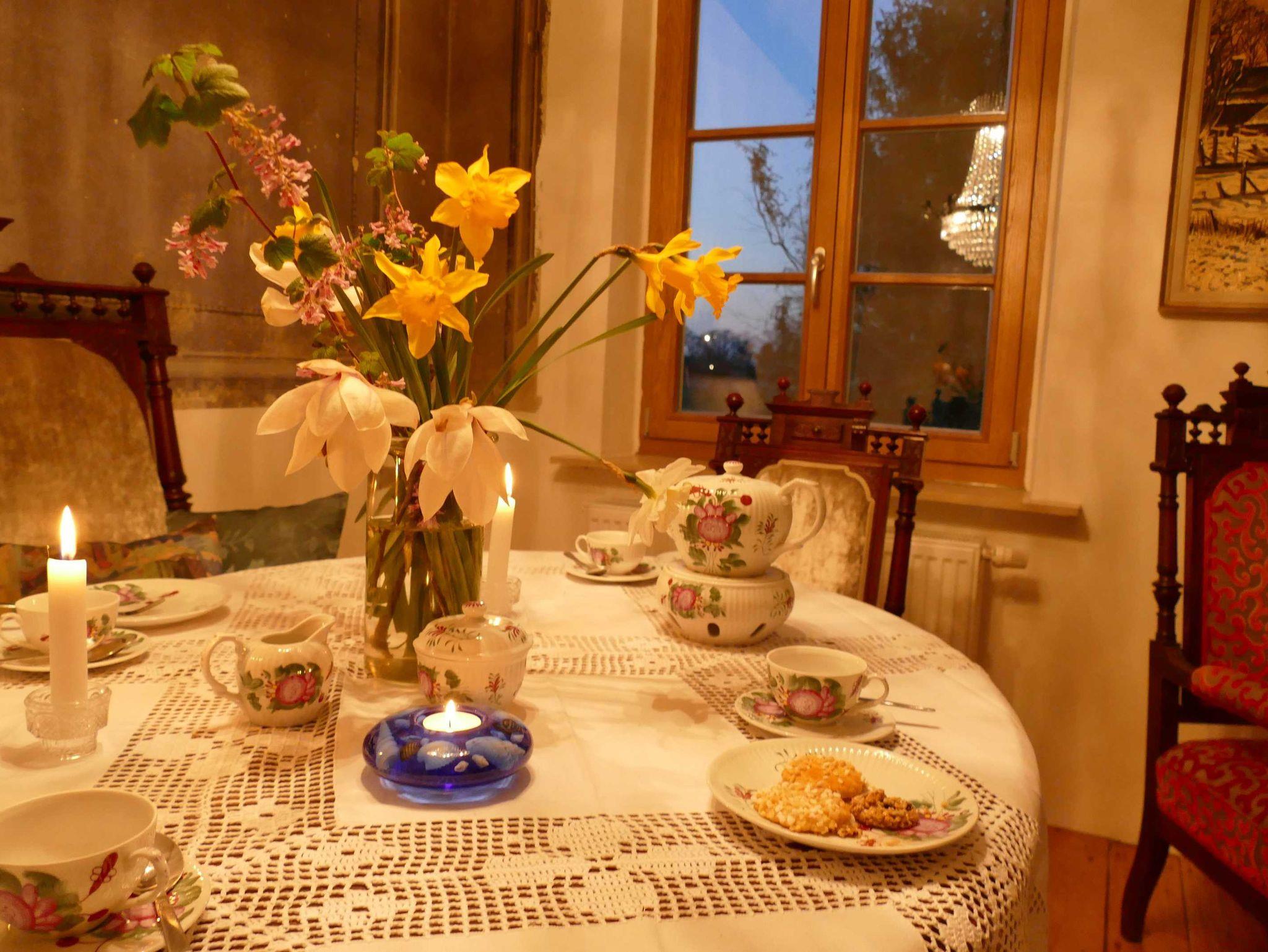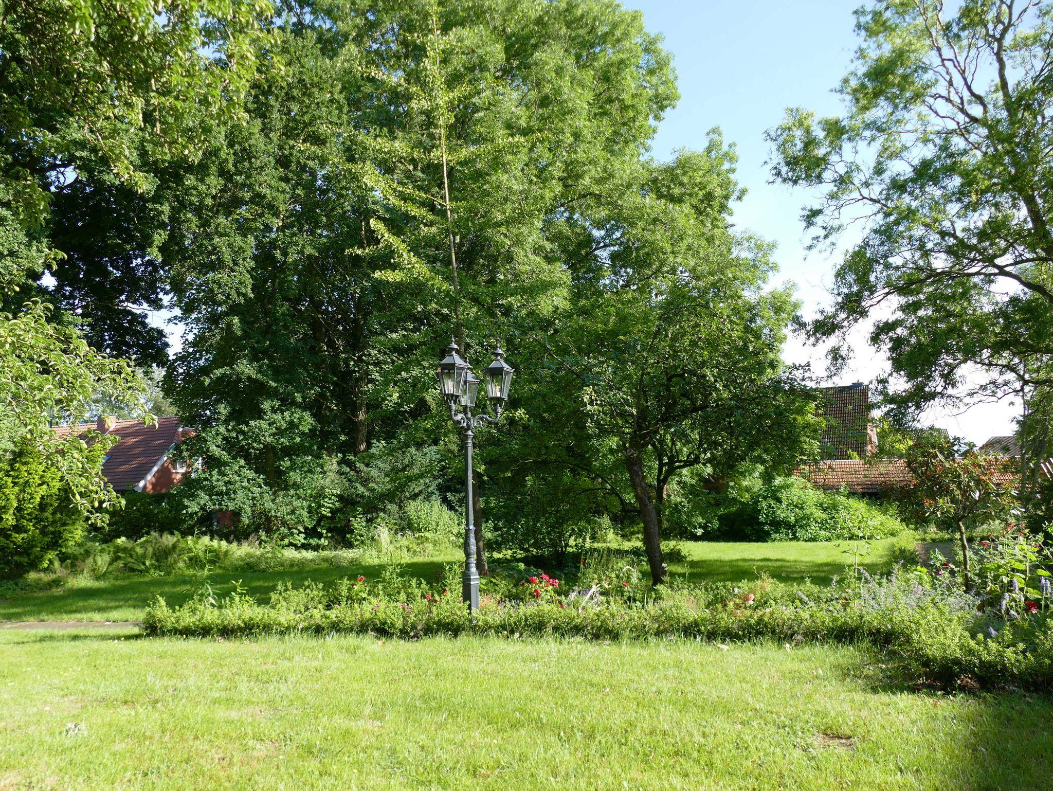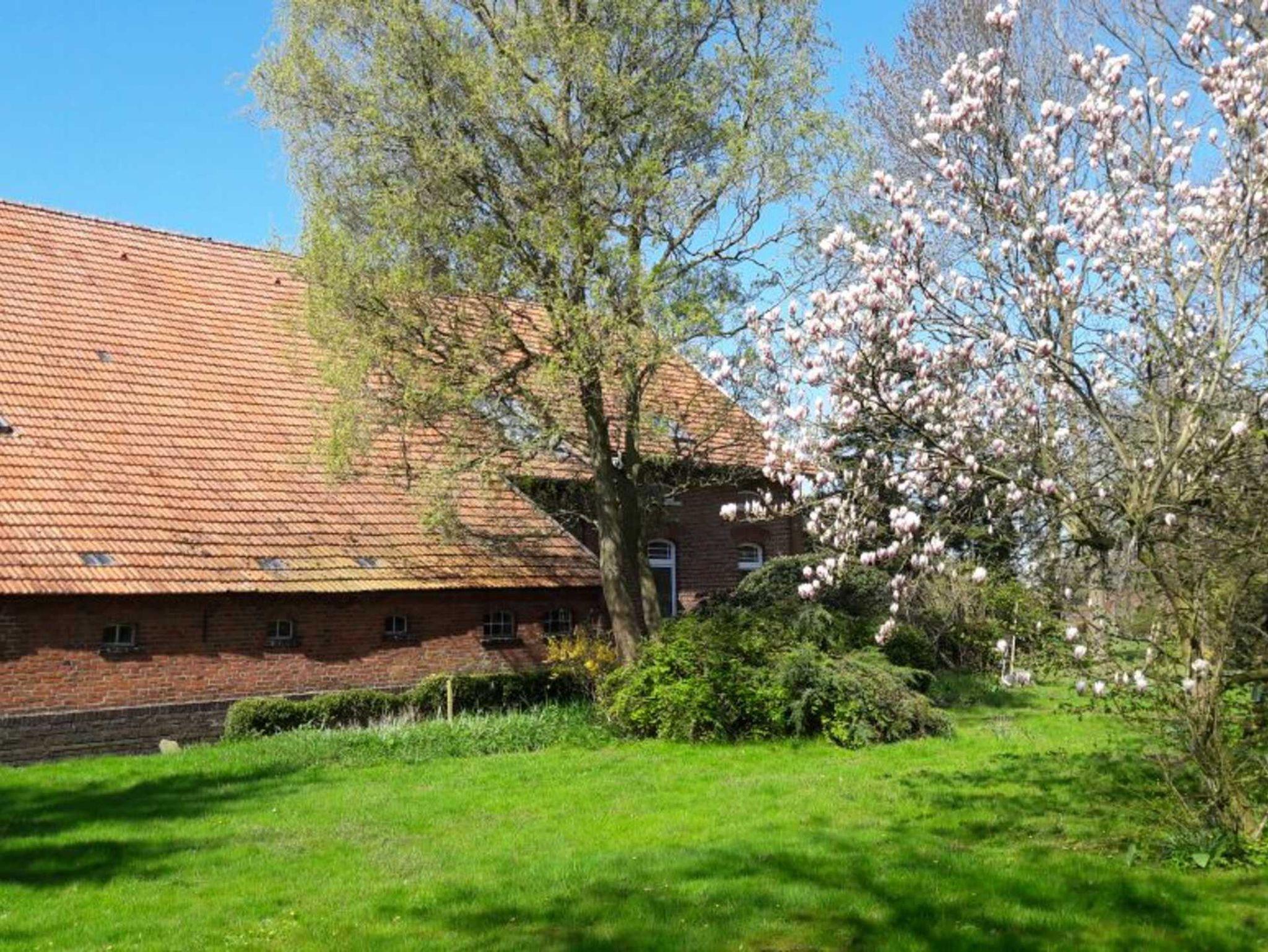 Ein herrlicher großer Bauerngarten umgibt das historische Gebäude, begrenzt durch einen breiten Graben - auch Gracht genannt - sowie einen reichen, alten Baumbestand z. T. über 100 Jahre alt. Mittendrin haben wir eine Schaukel für Kinder eingerichtet, auf der es sich in jedem Alter bis in luftige Höhe schwingen lässt. Der Garten besticht weiterhin je nach Jahreszeit durch Obstbäume, herrlich blühende Rhododendronbüsche in prächtigen Farben, einer Magnolie, einem Meer von Buschwindröschen, Osterblumen, Schneeglöckchen, Krokussen, Gänseblümchen und Löwenzahn. Rosenbeete zieren den Eingangsbereich. Gerne dürfen sich unsere Gäste an den Schnittblumen und Obstbäume frei von Schadstoffen bedienen. Der Garten lädt ein zum Spielen und zum Lauschen der Vogelstimmen, die sich in nächster Nähe in unterschiedlichem Tonlagen „unterhalten“.ein. Abends fasziniert bei klarem Himmel der Sonnenuntergang am Himmel inmitten des beeindruckenden ostfriesischen Wolkenhimmels. Das alles können sie beim Grillen auf der Terrasse beobachten und hören. Tagsüber lässt sich die Friesische Freiheit hautnah auf Radwandertouren erleben, wenn Sie Ihren Blick streifen lassen über die grünen Wiesen bis zum Horizont.