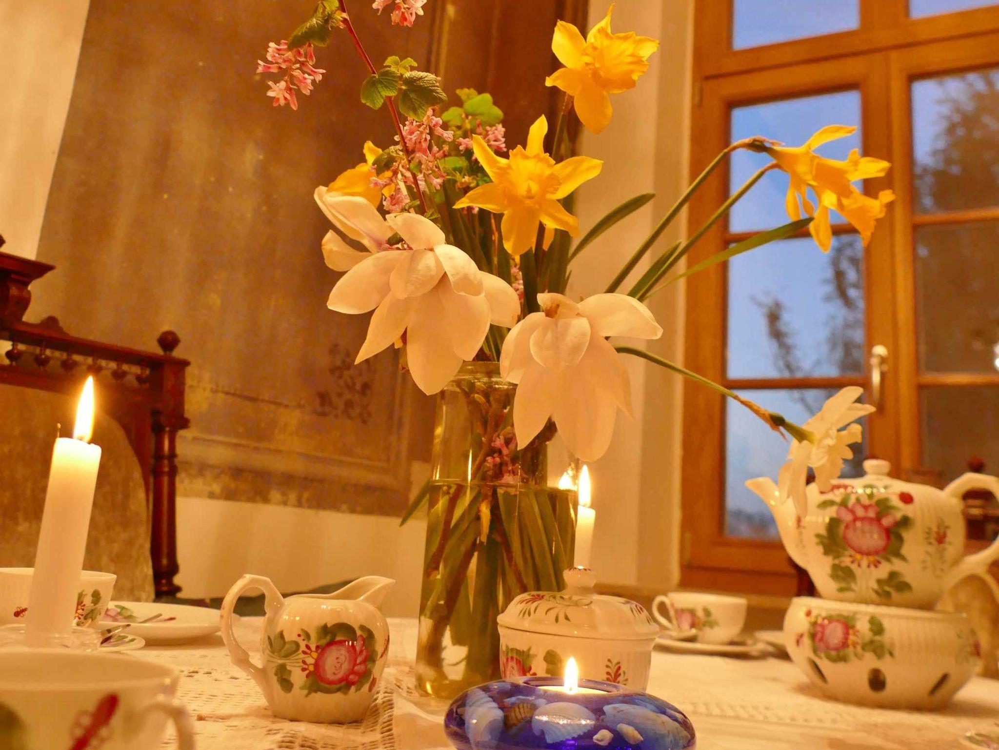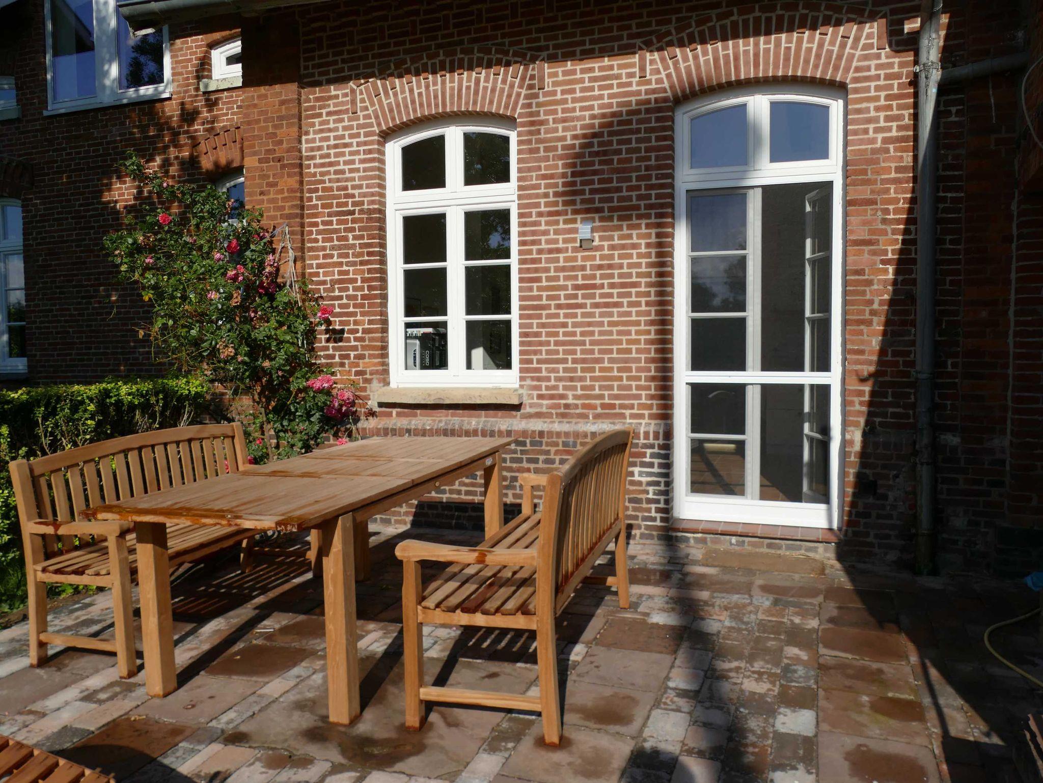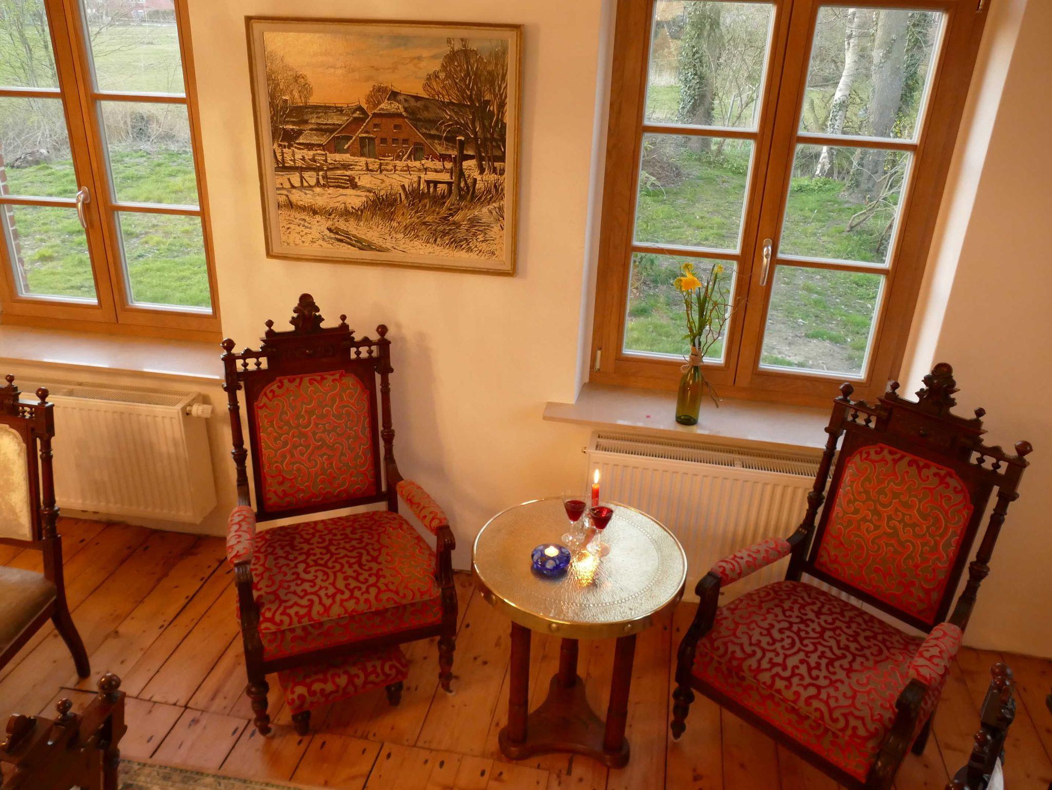 Ein herrlicher großer Bauerngarten umgibt das historische Gebäude, begrenzt durch einen breiten Graben - auch Gracht genannt - sowie einen reichen, alten Baumbestand z. T. über 100 Jahre alt. Mittendrin haben wir eine Schaukel für Kinder eingerichtet, auf der es sich in jedem Alter bis in luftige Höhe schwingen lässt. Der Garten besticht weiterhin je nach Jahreszeit durch Obstbäume, herrlich blühende Rhododendronbüsche in prächtigen Farben, einer Magnolie, einem Meer von Buschwindröschen, Osterblumen, Schneeglöckchen, Krokussen, Gänseblümchen und Löwenzahn. Rosenbeete zieren den Eingangsbereich. Gerne dürfen sich unsere Gäste an den Schnittblumen und Obstbäume frei von Schadstoffen bedienen. Der Garten lädt ein zum Spielen und zum Lauschen der Vogelstimmen, die sich in nächster Nähe in unterschiedlichem Tonlagen „unterhalten“.ein. Abends fasziniert bei klarem Himmel der Sonnenuntergang am Himmel inmitten des beeindruckenden ostfriesischen Wolkenhimmels. Das alles können sie beim Grillen auf der Terrasse beobachten und hören. Tagsüber lässt sich die Friesische Freiheit hautnah auf Radwandertouren erleben, wenn Sie Ihren Blick streifen lassen über die grünen Wiesen bis zum Horizont.