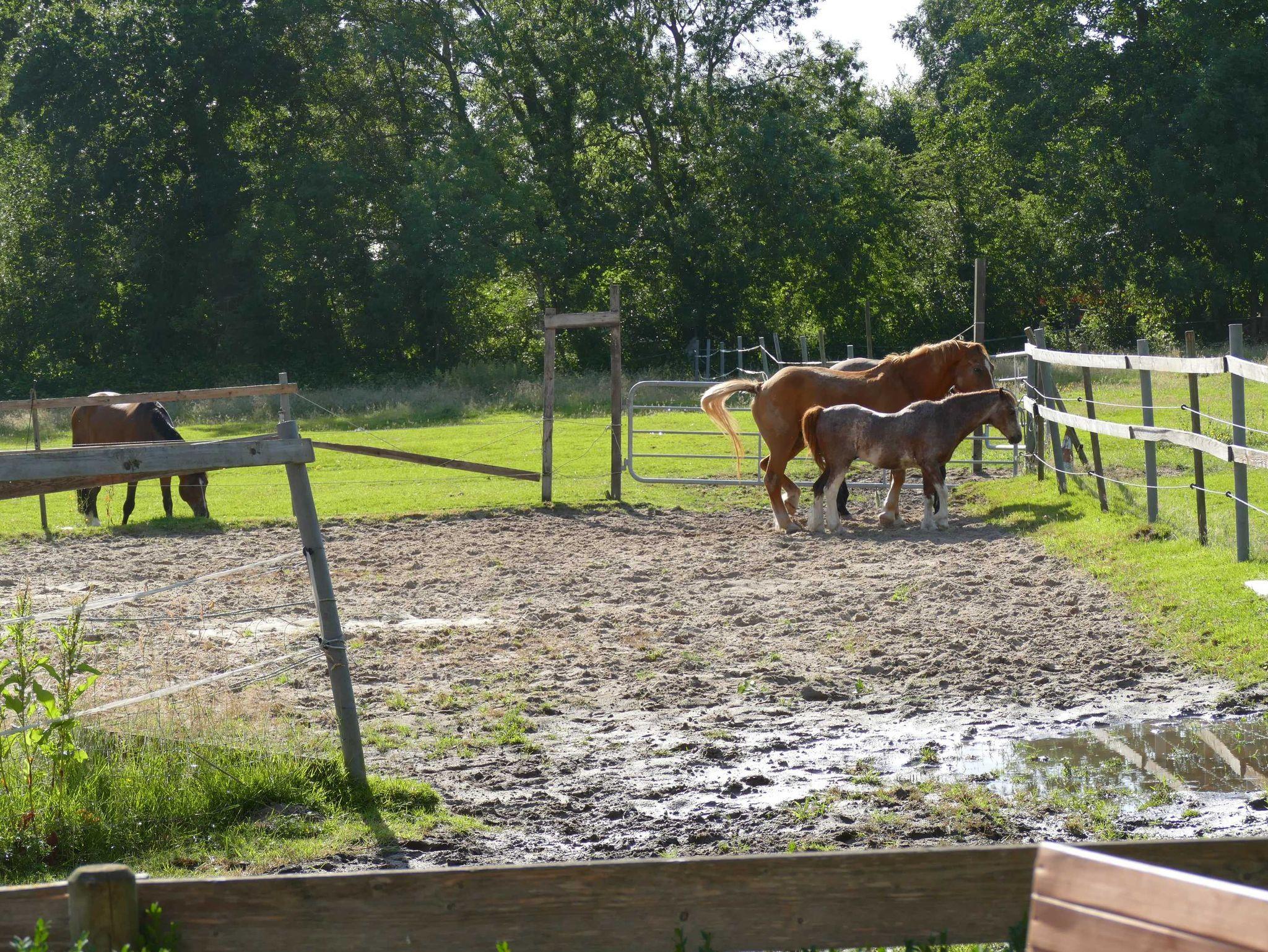 Für die Insekten wurde eine Blühwiese und ein Insektenhotel eingerichtet. Hinter dem Hofgebäude befindet sich eine große Pferdekoppel, deren Entwässerung in Grüppen erfolgt, erwähnenswert, weil es der ursprünglichen, historische Form der Entwässerung handelt, die längs über die Weide verlaufen. In tieferen Stellen bilden sich in feuchteren Monaten seichte Tümpel/Pfützen, an denen Frösche, Enten und oftmals auch Störche beobachtet werden können. Aufgrund der günstigen Lebensbedingungen für Störche hat in diesem Jahr ein Storchenpaar auf der neu eingerichteten Nisthilfe Einzug gehalten.