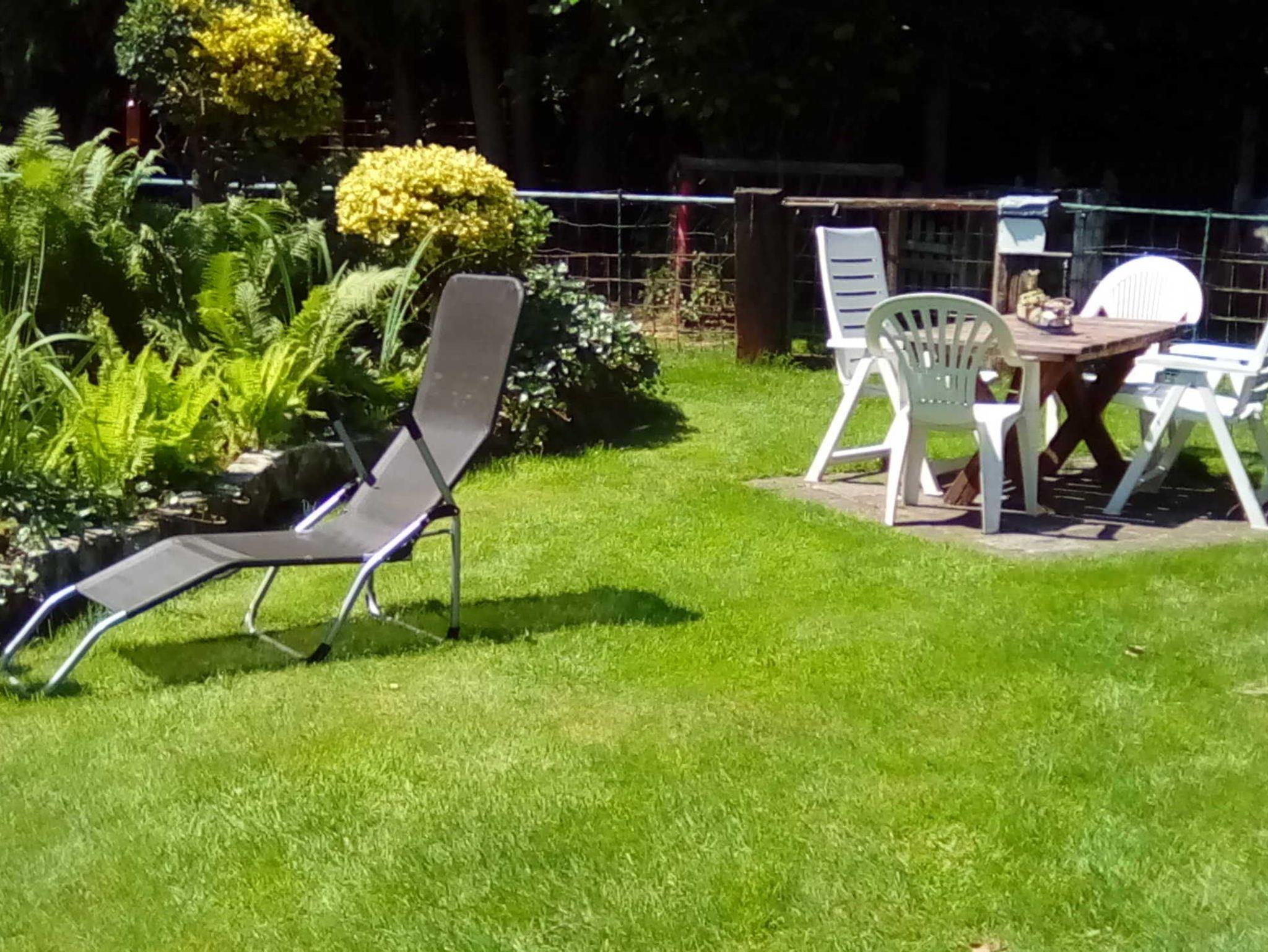Eigene Terrasse mit Gartenmöbel und Grill.