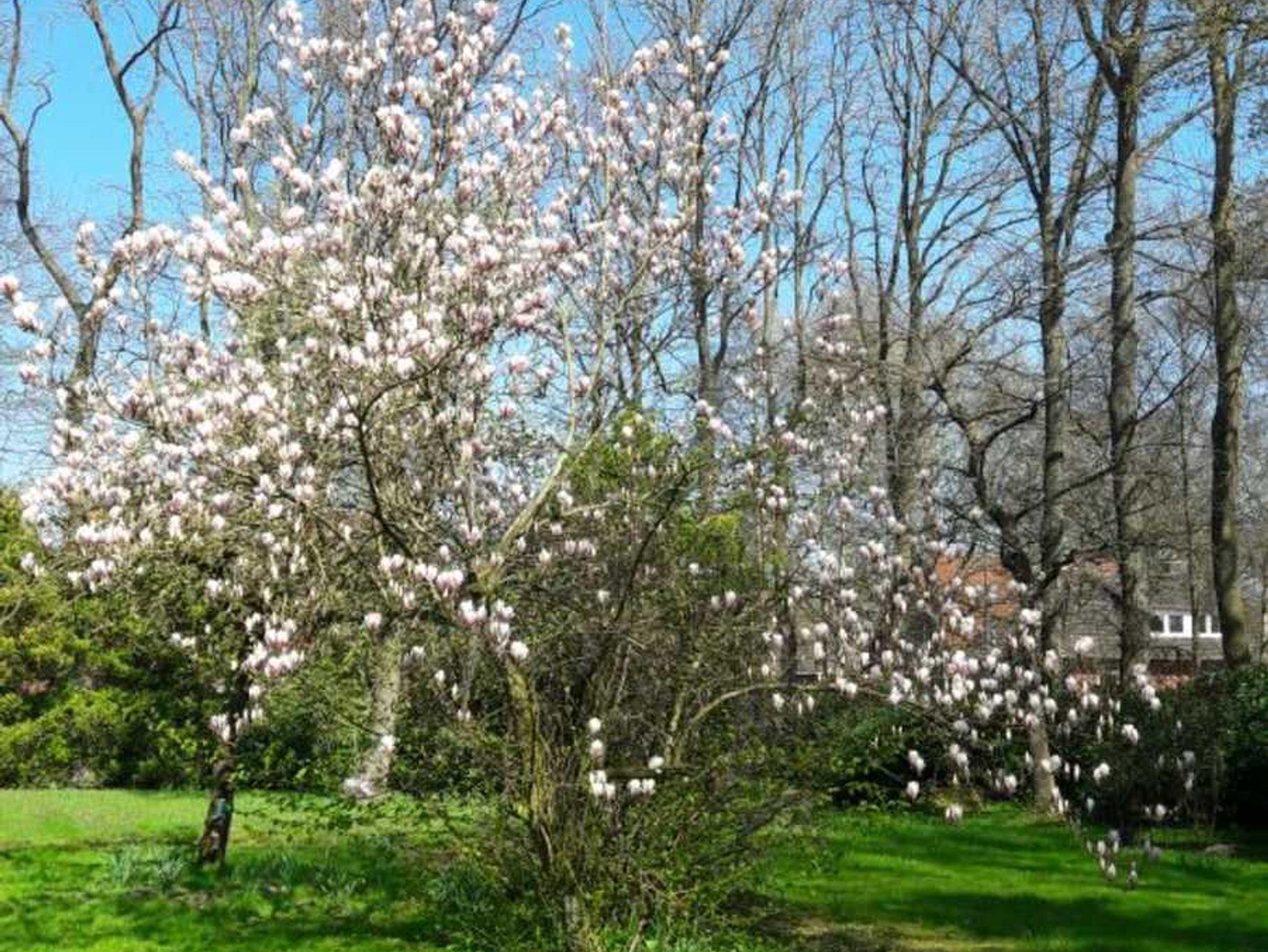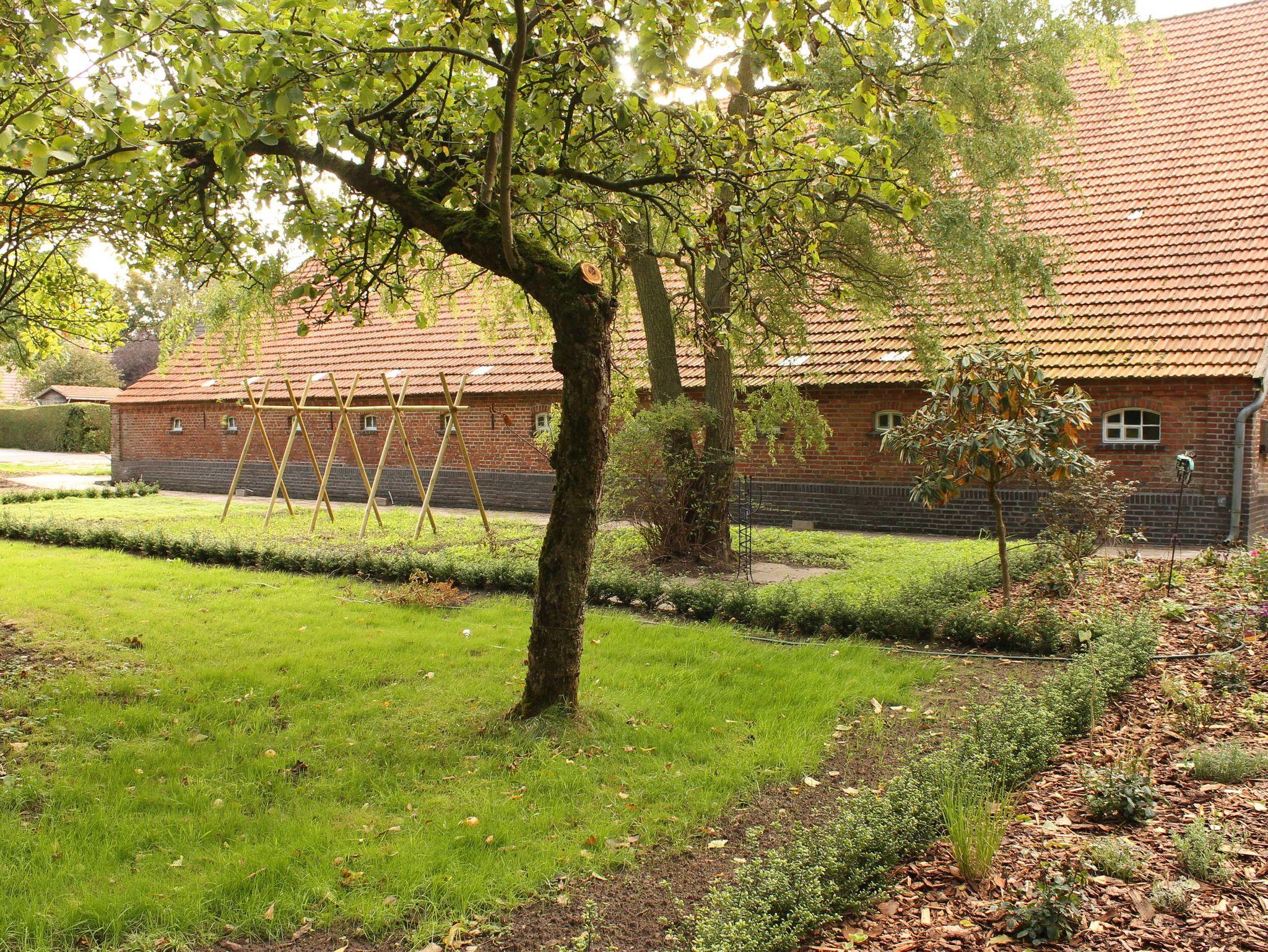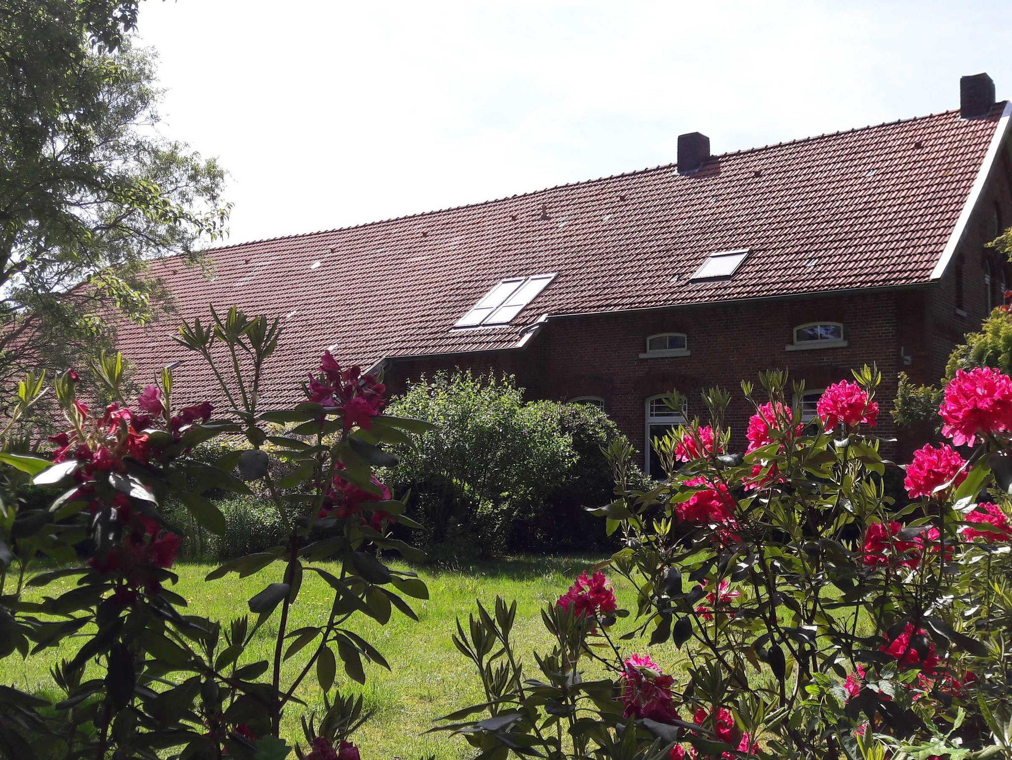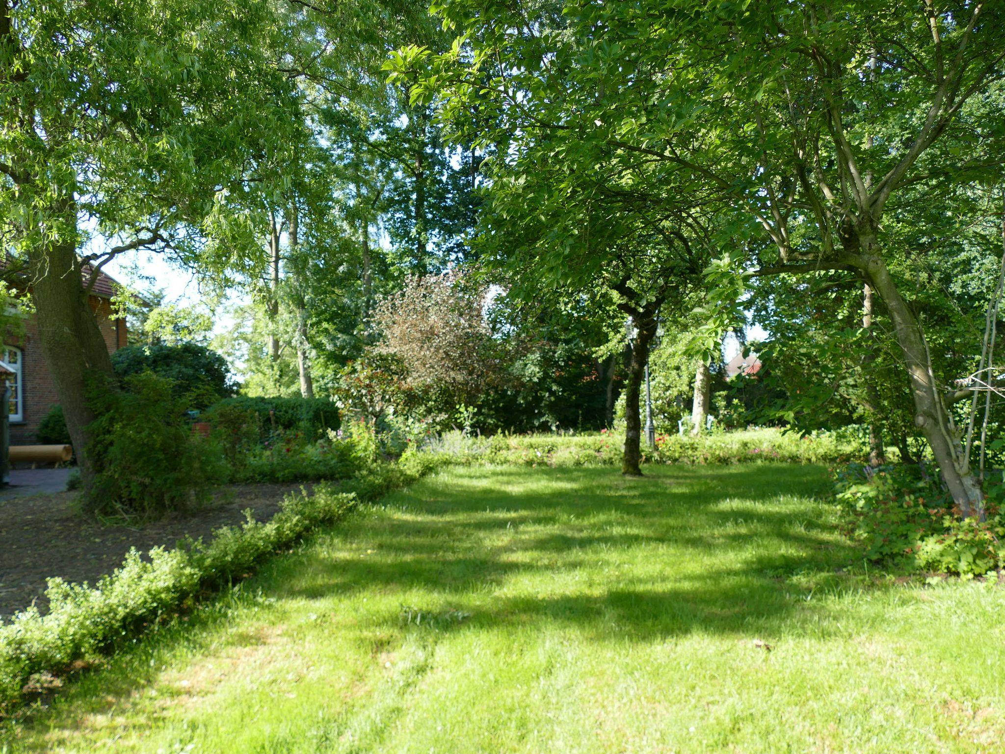 Ein herrlicher großer Bauerngarten umgibt das historische Gebäude, begrenzt durch einen breiten Graben - auch Gracht genannt - sowie einen reichen, alten Baumbestand z. T. über 100 Jahre alt. Mittendrin haben wir eine Schaukel für Kinder eingerichtet, auf der es sich in jedem Alter bis in luftige Höhe schwingen lässt. Der Garten besticht weiterhin je nach Jahreszeit durch Obstbäume, herrlich blühende Rhododendronbüsche in prächtigen Farben, einer Magnolie, einem Meer von Buschwindröschen, Osterblumen, Schneeglöckchen, Krokussen, Gänseblümchen und Löwenzahn. Rosenbeete zieren den Eingangsbereich. Gerne dürfen sich unsere Gäste an den Schnittblumen und Obstbäume frei von Schadstoffen bedienen. Der Garten lädt ein zum Spielen und zum Lauschen der Vogelstimmen, die sich in nächster Nähe in unterschiedlichem Tonlagen „unterhalten“.ein. Abends fasziniert bei klarem Himmel der Sonnenuntergang am Himmel inmitten des beeindruckenden ostfriesischen Wolkenhimmels. Das alles können sie beim Grillen auf der Terrasse beobachten und hören. Tagsüber lässt sich die Friesische Freiheit hautnah auf Radwandertouren erleben, wenn Sie Ihren Blick streifen lassen über die grünen Wiesen bis zum Horizont.