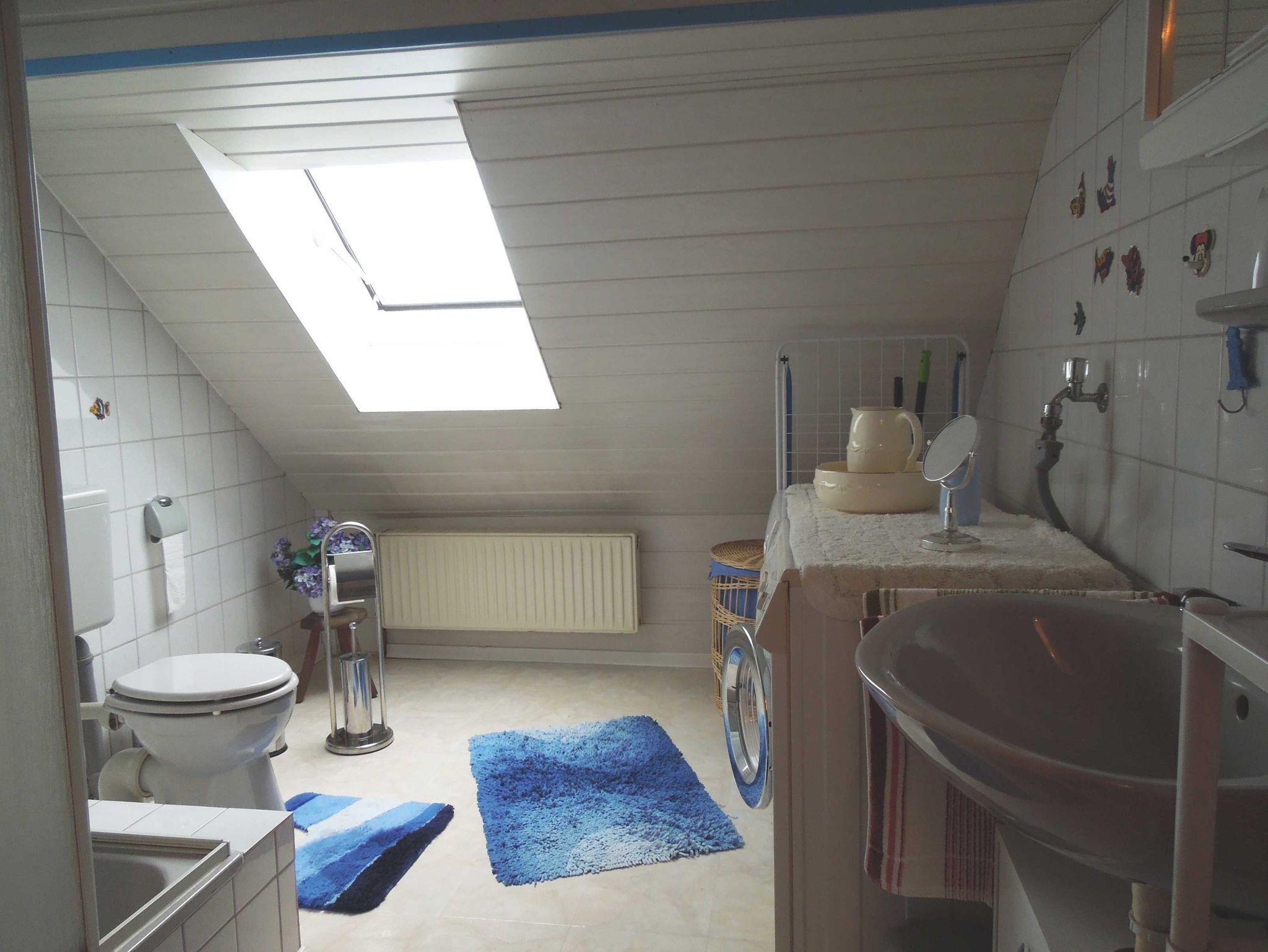 Das Badezimmer ist mit Dusche, WC, Handwaschbecken, Waschmaschine,