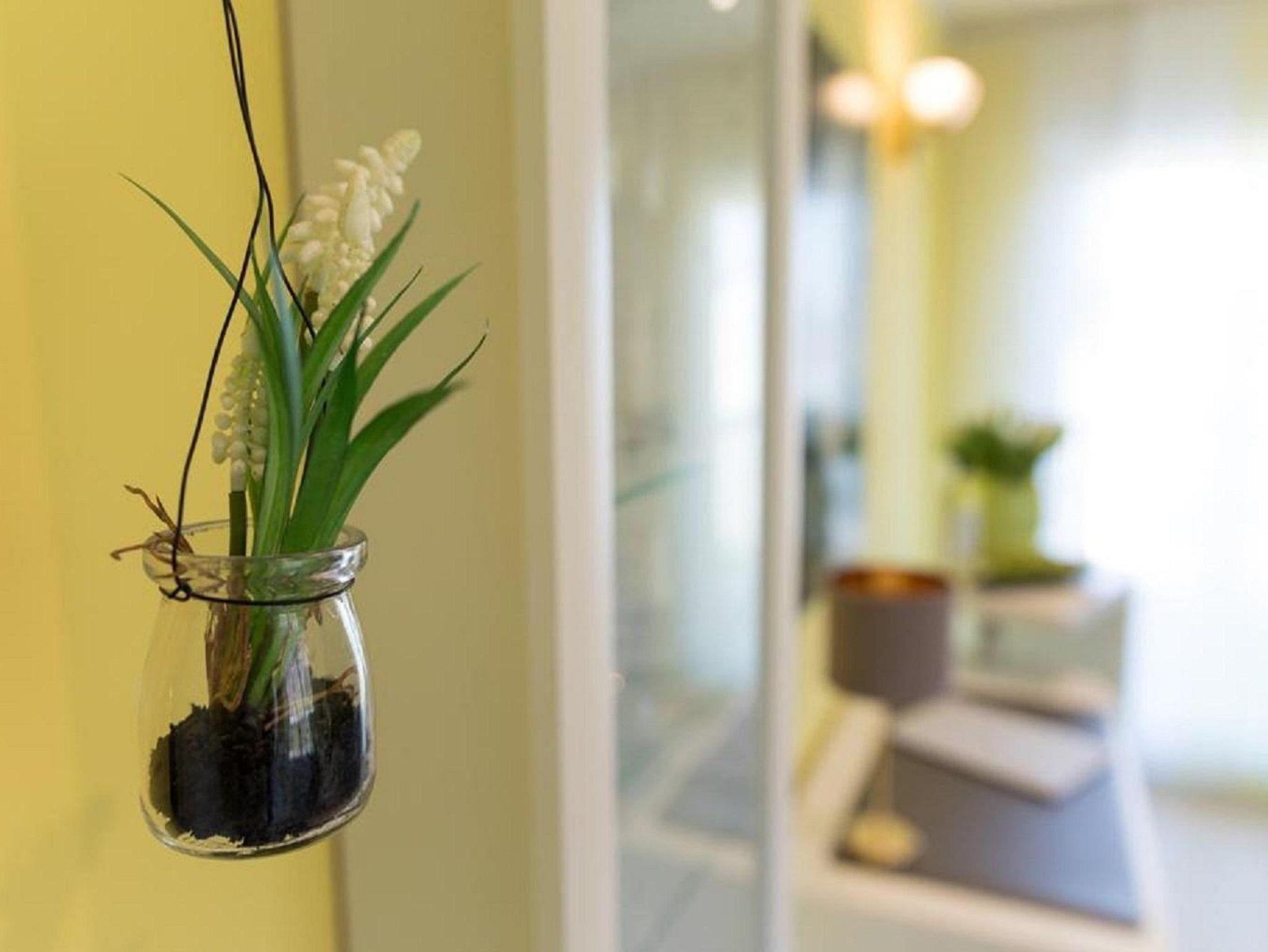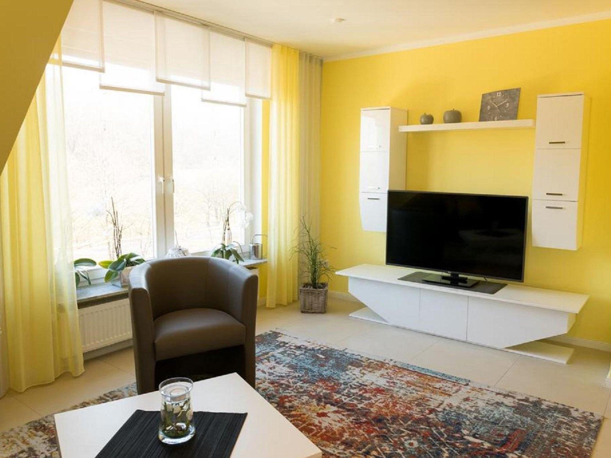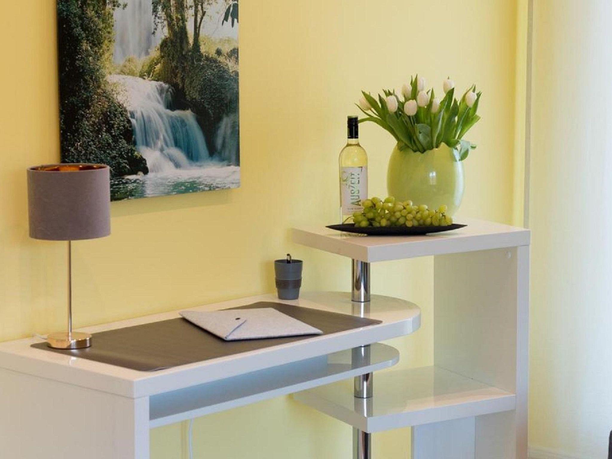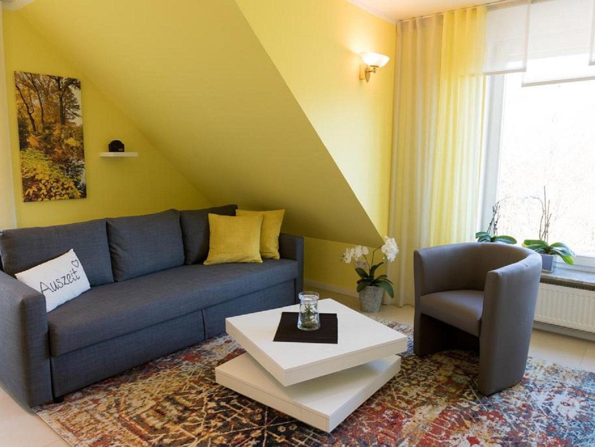 Das farbenfrohe Wohnzimmer verfügt über ein großes Sofa, Sessel, einen Smart-TV, Bücherregal und einen Schreibplatz. WLAN steht kostenlos zur Verfügung. Das Schlafzimmer bietet ein bequemes Doppelbett (2x2 m), das bei Bedarf in Einzelbetten geteilt werden kann, sowie einen großzügigen Kleiderschrank.