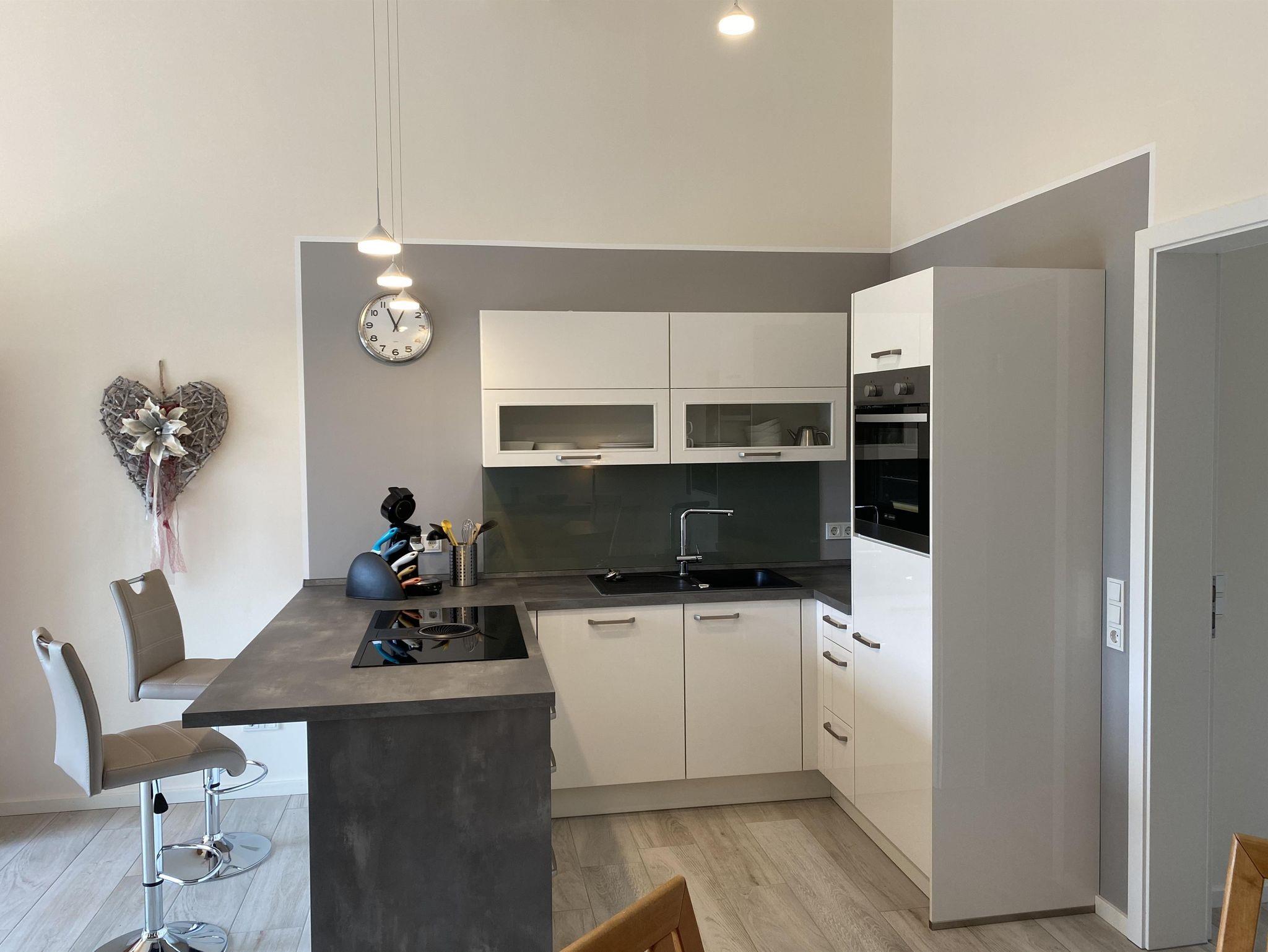 Lichtdurchfluteter großzügiger Wohnraum mit direktem Zugang zur Terrasse, moderne, voll ausgestattete Küche, Bad mit Dusche und WC, Schlafzimmer mit Doppelbett und großem Kleiderschrank. Bettwäsche und Handtücher stehen kostenfrei zur Verfügung.