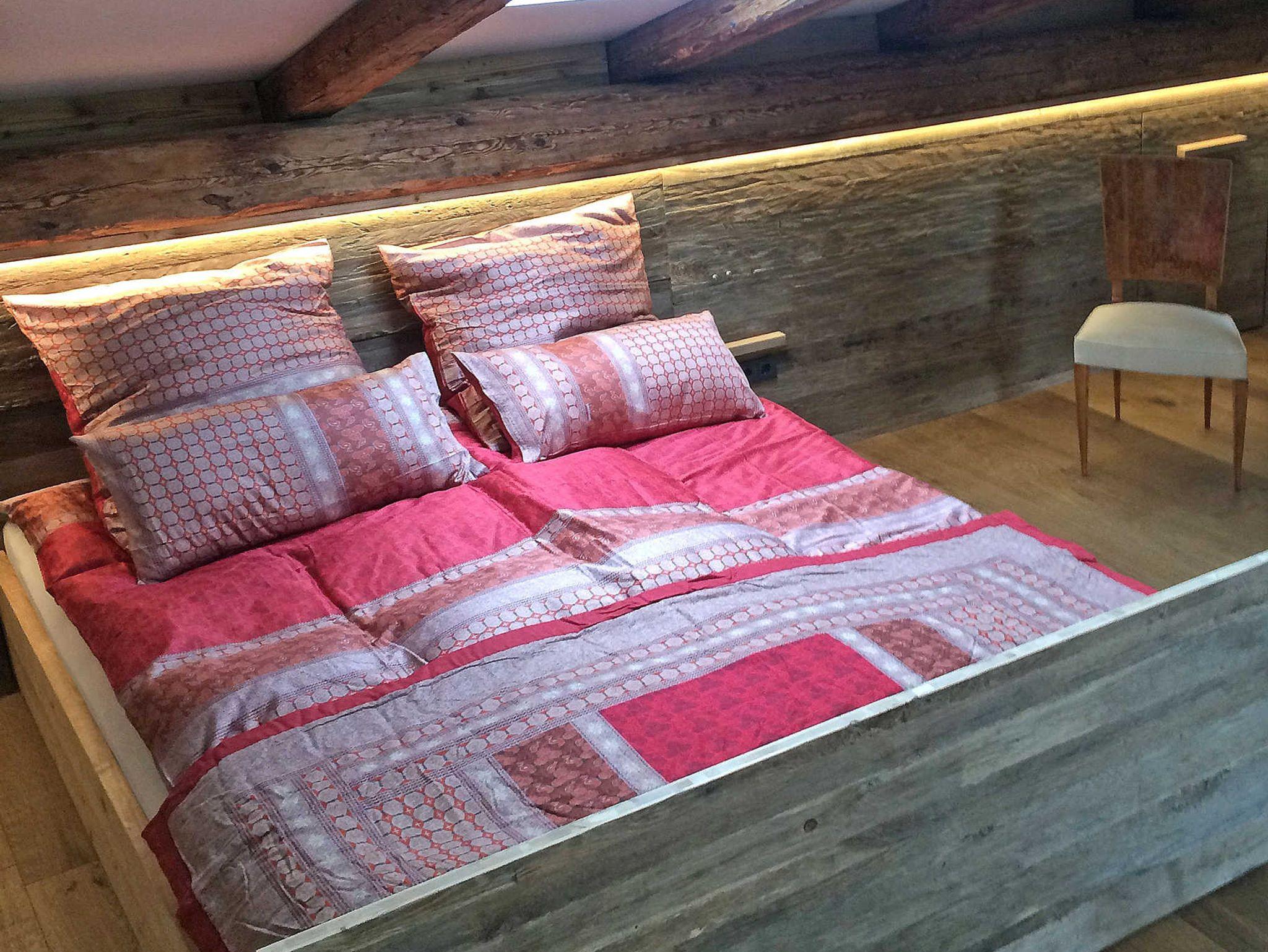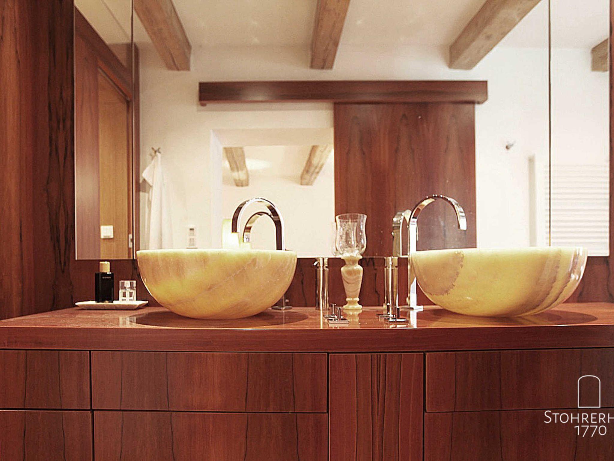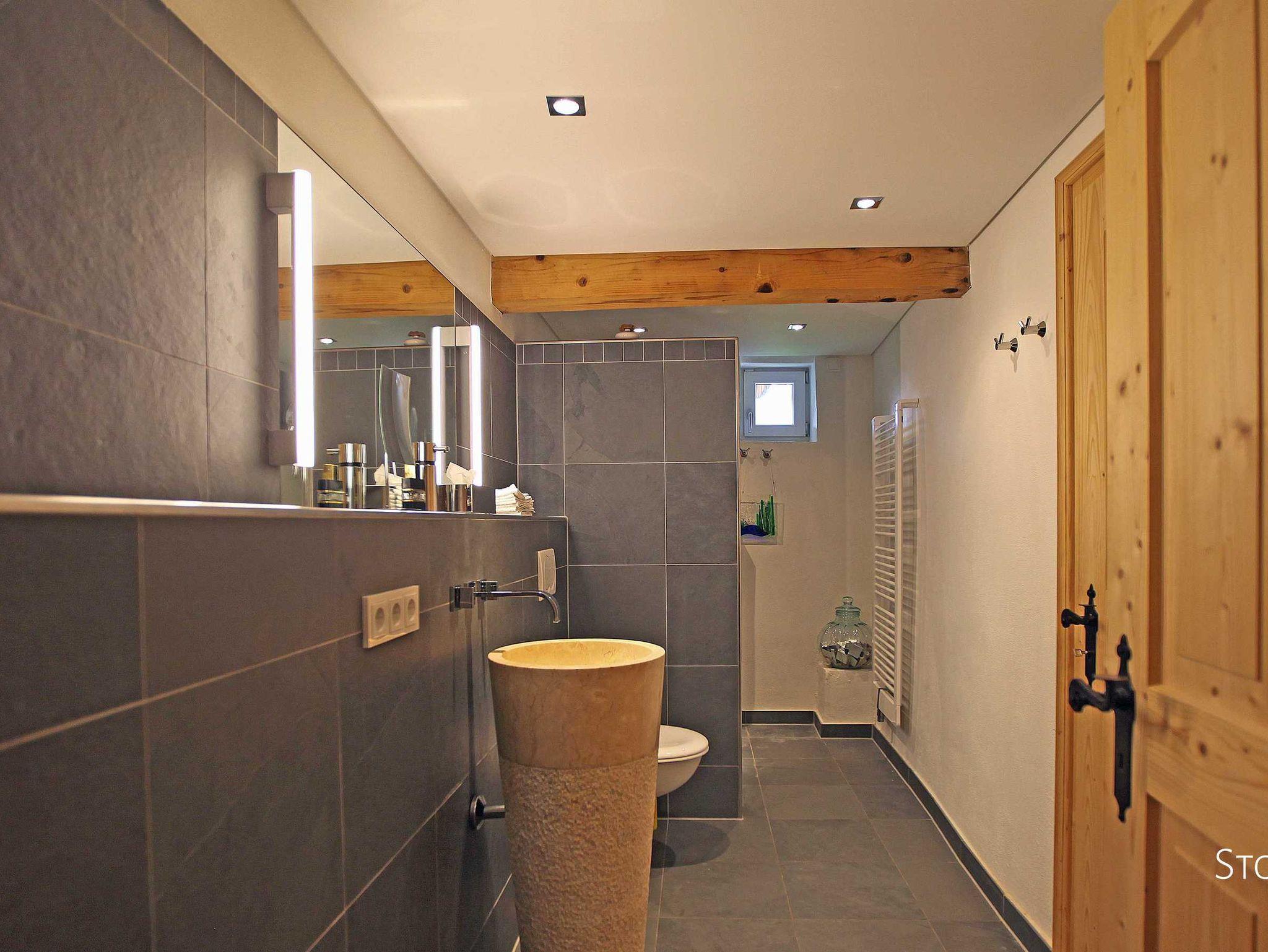 Die drei weiteren Räume des Obergeschosses sind die Ankleide (20qm) mit Hosenbügler, ein Schlafzimmer (21qm) mit Doppelbett (1,80 x 2,00), sowie das 30qm große Badezimmer (Fußbodenheizung, Handtuchtrockner) mit Dusche, Badewanne, Kamin und einem von zwei Seiten begehbaren WC mit Bidet. All diese Räume stechen durch ihre Modernität und aber auch durch ihre besonders exklusiven Ausstattungen mit edlem Jatoba-Boden, kanadischem, grünen Schiefer, der freistehenden Badewanne, dem offenen Kamin, dem geräumigen Duschraum mit beheizbarem Rasierspiegel, den Onyx-Waschbecken und nicht zuletzt durch die hochwertigen Dornbracht Armaturen hervor. Im Schlafzimmer steht Ihnen darüber hinaus ein weiterer Fernseher zur Verfügung. Hochwertige Handtücher stehen selbstverständlich auch in diesem Obergeschoss für jeden Gast zur Verfügung.
