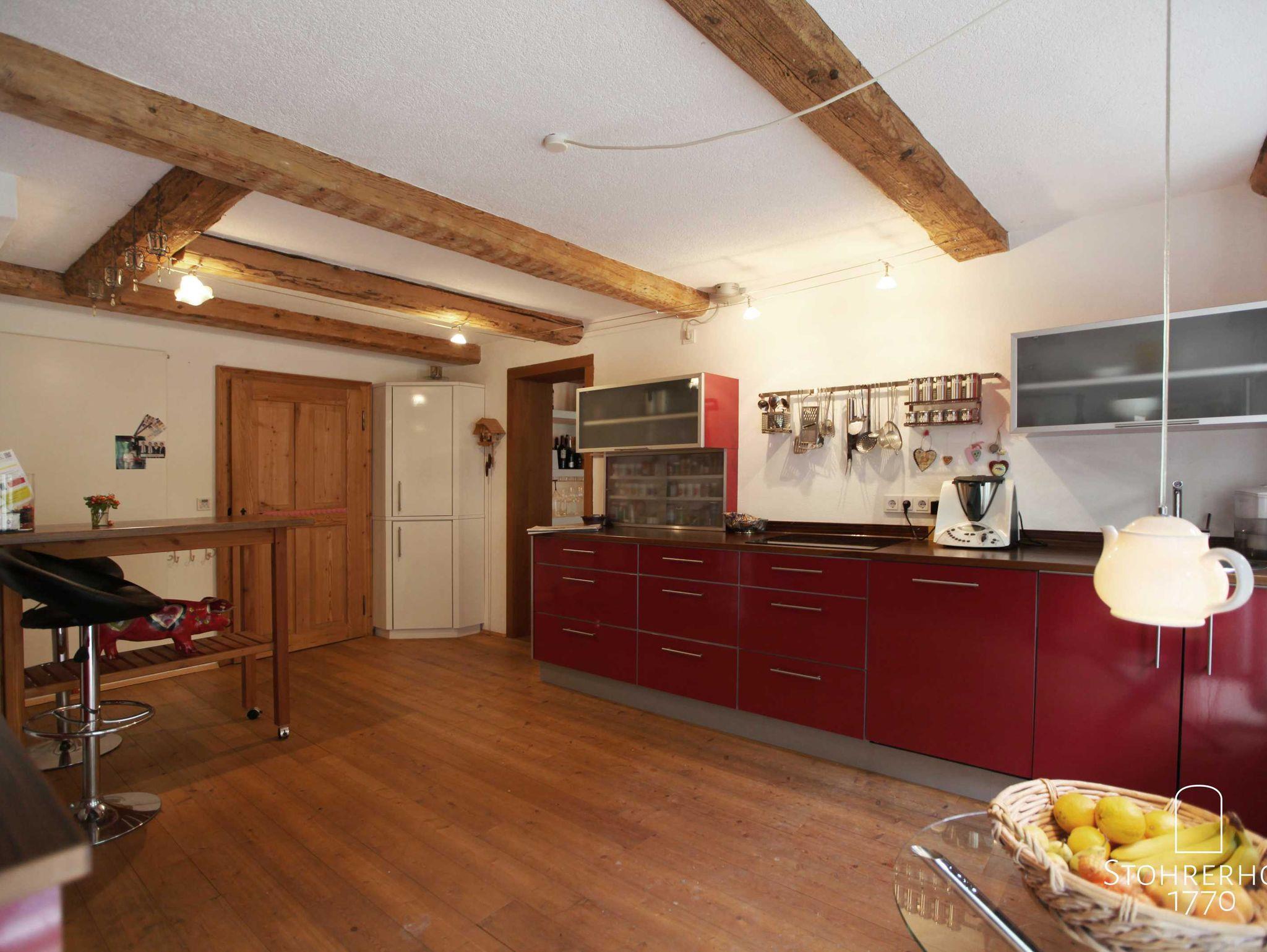Direkt an die Stube schließt sich die moderne und voll ausgestattete Schreiner-Küche (20qm), mit hochwertigen Küchengeräten an. Neben der Spülmaschine, dem Backrohr, einem Ceran-Kochfeld, der Mikrowelle, der Kühl-Gefrier-Kombi stehen Ihnen selbstverständlich ein Kaffeevollautomat für Kaffee- und Espressobohnen, Raclette-Grill für 16 Personen, Toaster, Waffeleisen, elektrische Citrus-Presse und ein Wasserkocher zur Verfügung. Das Geschirr, Gläser und Besteck ist für bis zu 16 Personen in ausreichender Menge bereitgestellt.