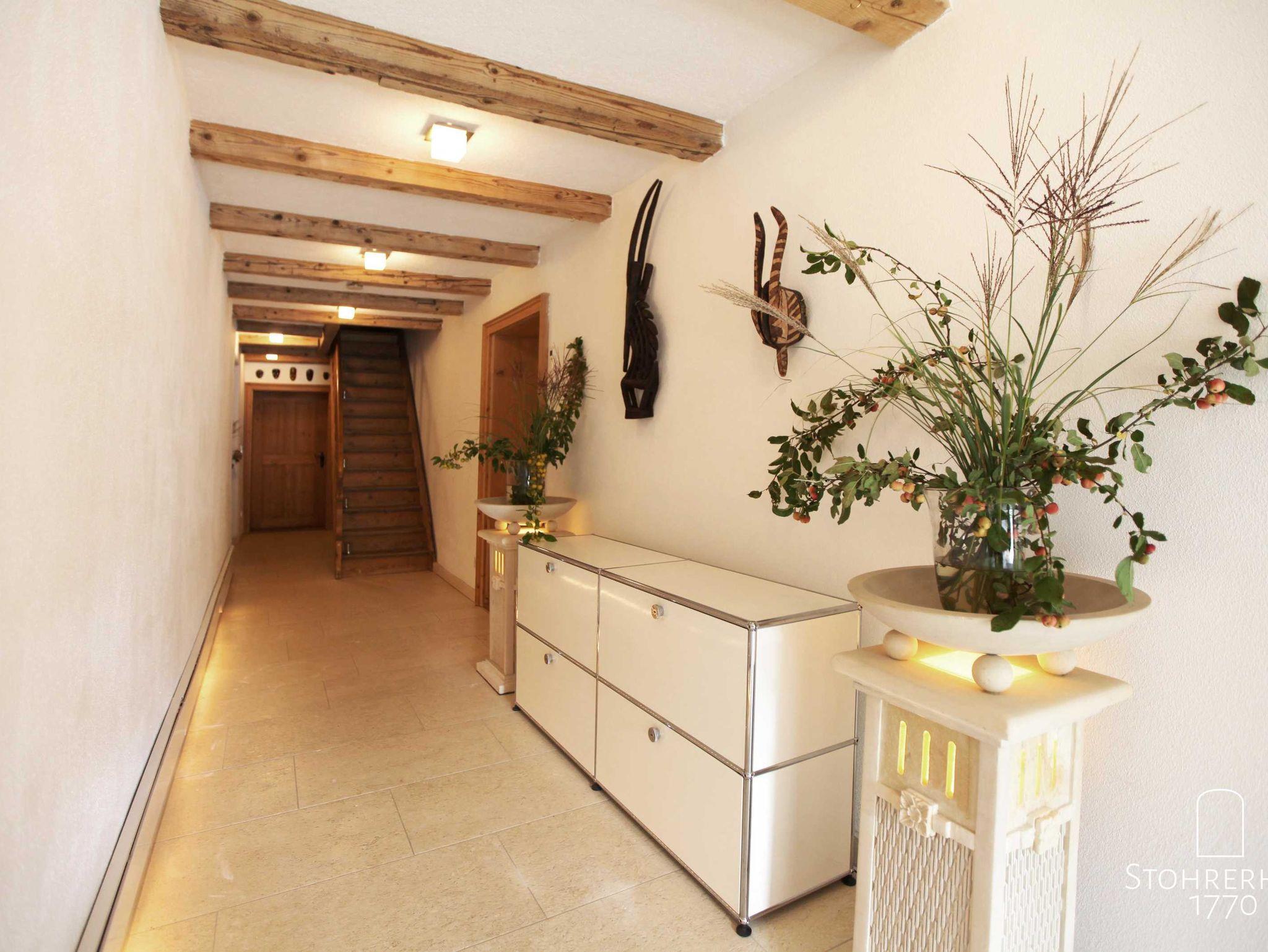 Der großzügige Flur (22qm) im Erdgeschoß mit direkter und indirekter Beleuchtung und zentralen Rauchmeldern sowie USM-Haller Regalen, bietet direkten Zugang zu allen Räumen. Neben der hellen Garderobe (5qm) mit einer Schuhputzmaschine kann man direkt in die historische Bauernstube (28qm) mit seinem wunderschönen Grundofen, Jukebox, Spielen und einem großen Stubentisch (für bis zu 16 Personen), der aus den uralten Dielen des Stubenbodens erstellt wurde, einkehren. Alle Möbel wurden liebevoll von herausragenden Schreinern gestaltet. Die Stühle wurden in Einzelanfertigung besonders für diese Stube hochwertigst, individuell hergestellt. In diesem Haus haben wir nichts dem Zufall überlassen. Wir haben besonders Wert auf den historischen Rückbau dieses Raumes mit seiner alten Holzdecke und der originalen Bauerntür aus dem 18 Jhdt. gelegt.