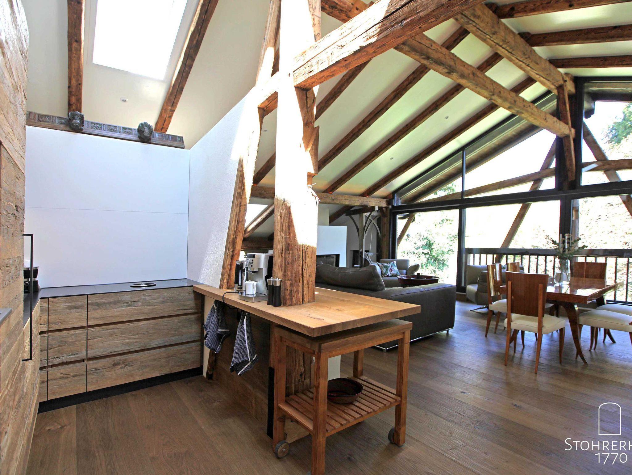 Über die historische Holztreppe erreichen Sie nun direkt das exklusive und lichtdurchflutete ganz offen gestaltete Penthouse (100 qm). Das Penthouse verfügt über zwei von unserem Schreiner eigens designten Doppelbetten (1,80 x 2,00), zwei Bädern, einer Dusche sowie einer separaten Küche. Die komplett verglaste Giebelseite gewährt Ihnen einen wunderbaren Ausblick und der wunderschöne Kaminofen lädt zu gemütlichen Stunden am Feuer ein.