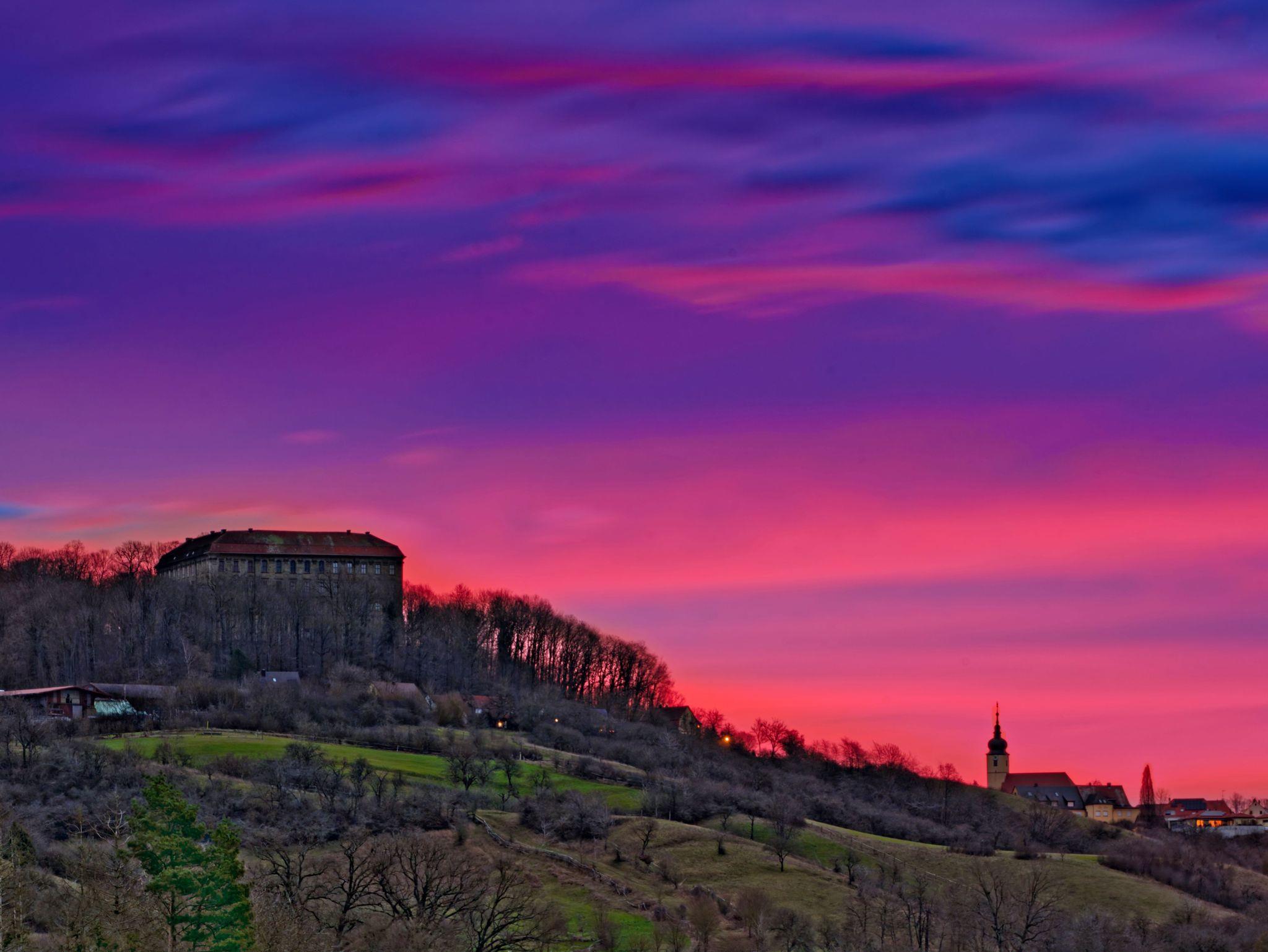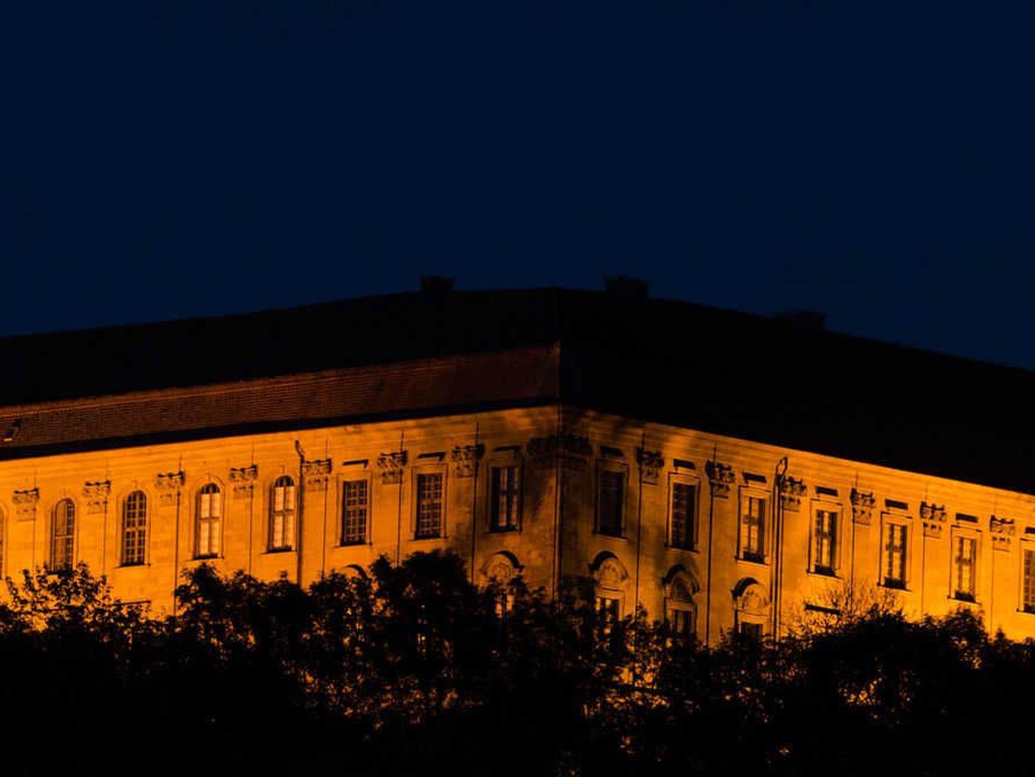 Der rund 10 m² große Balkon bietet einen atemberaubenden Ausblick auf das nächtlich beleuchtete Barockschloss der Fürsten zu Hohenlohe – Schillingsfürst.
