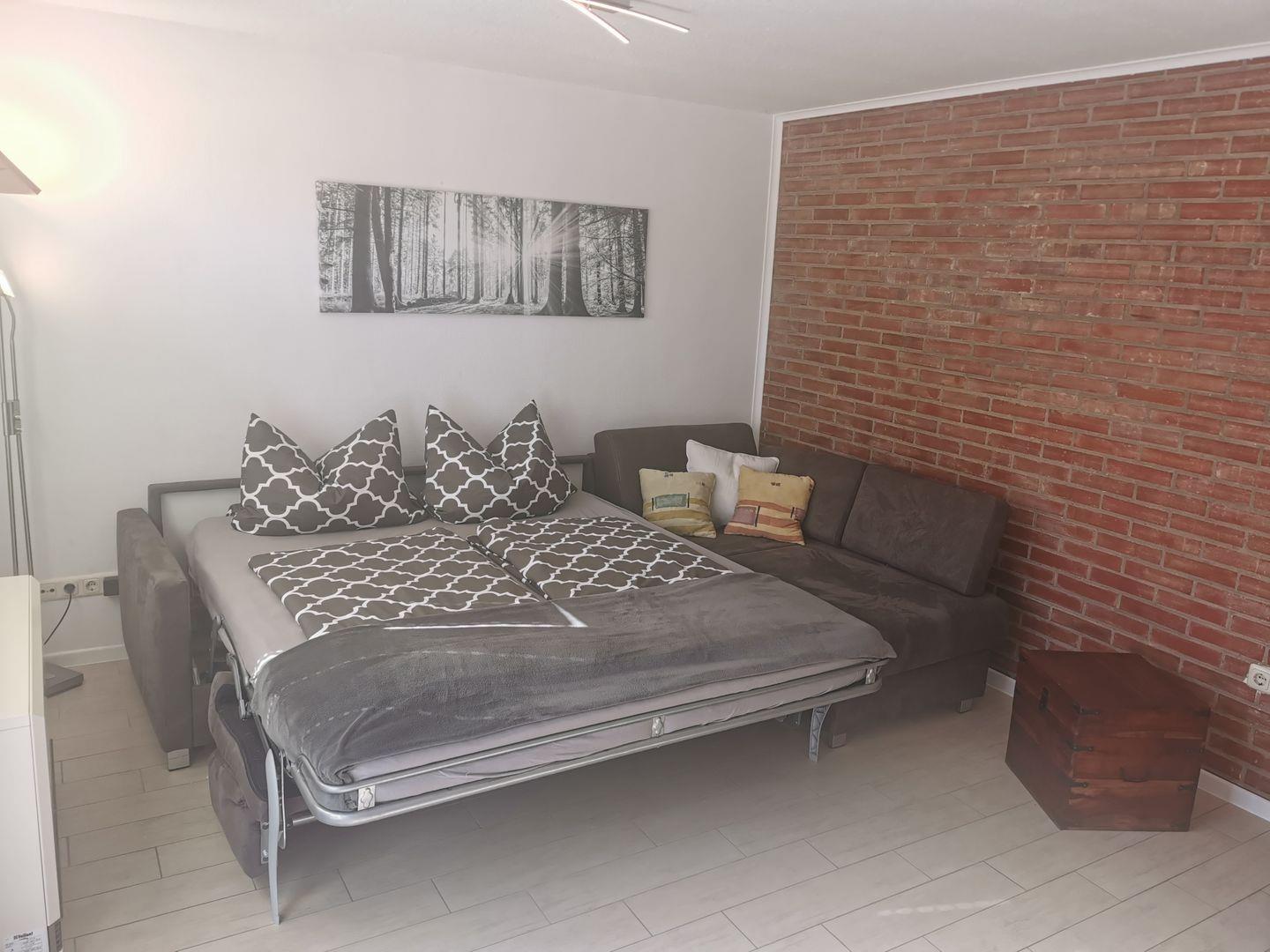 Im Schlafzimmer ist ein Doppelbett und das Sofa kann zu einem bequemen Bett mit Matratze und Federung ausgeklappt werden.