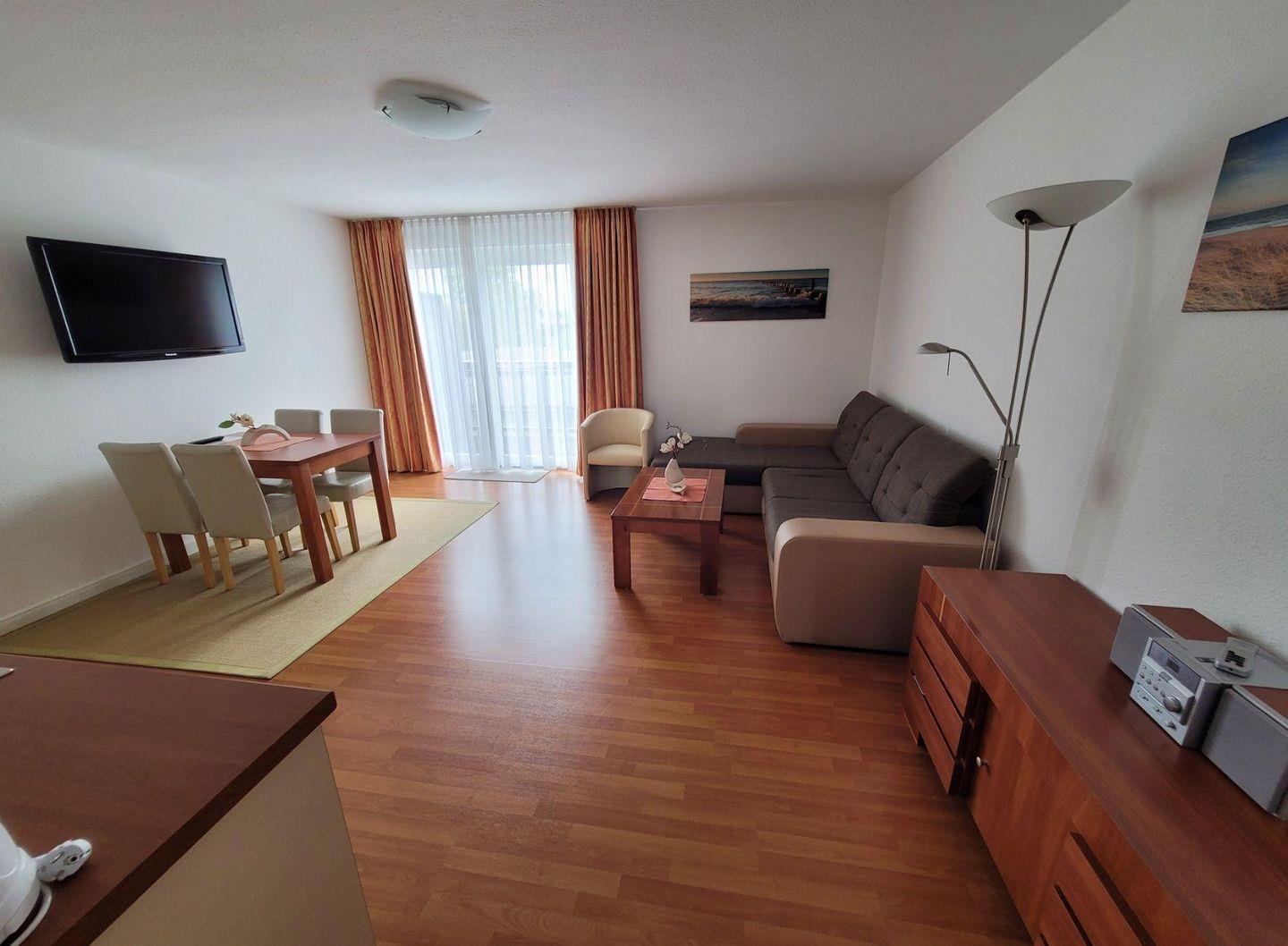 Die gemütliche 2-Zimmer-Ferienwohnung mit Westbalkon befindet sich im 1. Obergeschoss und ist ideal für zwei Personen geeignet – bietet aber auch Platz für bis zu vier Gäste. Der helle Wohnbereich lädt mit einem bequemen Sofa und TV zum Entspannen ein; das Sofa lässt sich bei Bedarf ganz einfach in ein Schlafsofa für zwei weitere Personen verwandeln. Vom Wohnzimmer aus gelangen Sie direkt auf den sonnigen Balkon, der mit Gartenmöbeln ausgestattet ist – perfekt für ein Frühstück im Freien oder entspannte Abende in der Abendsonne.