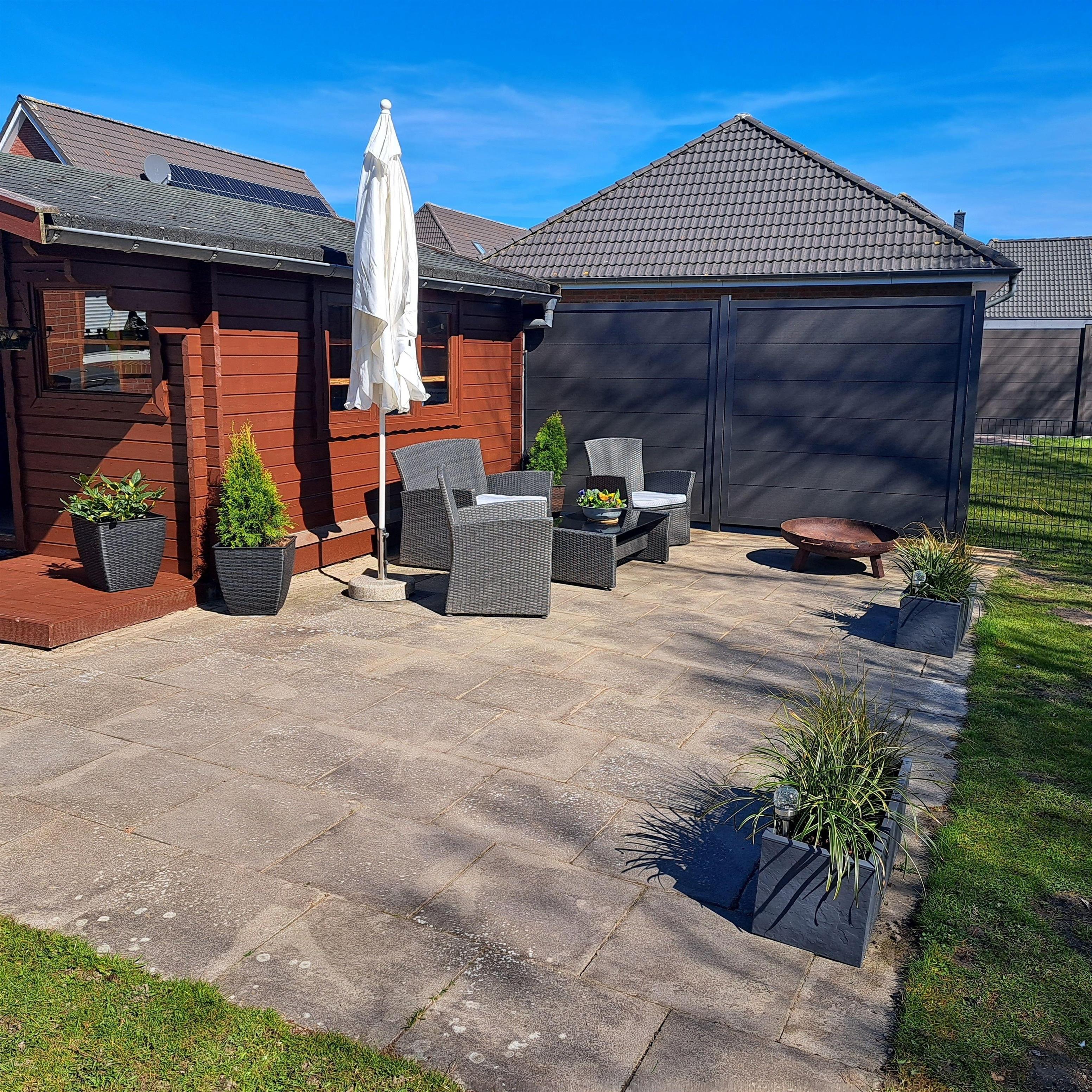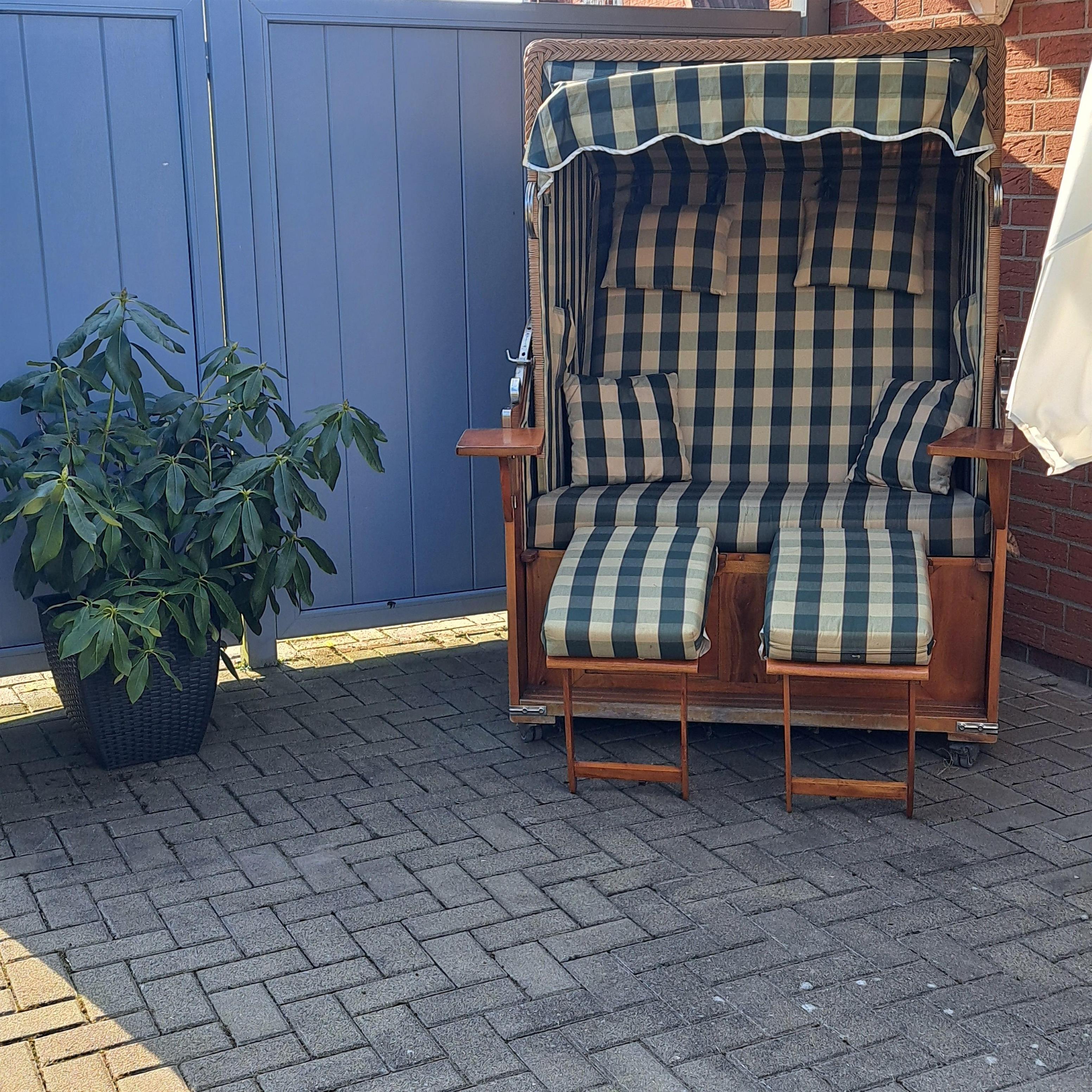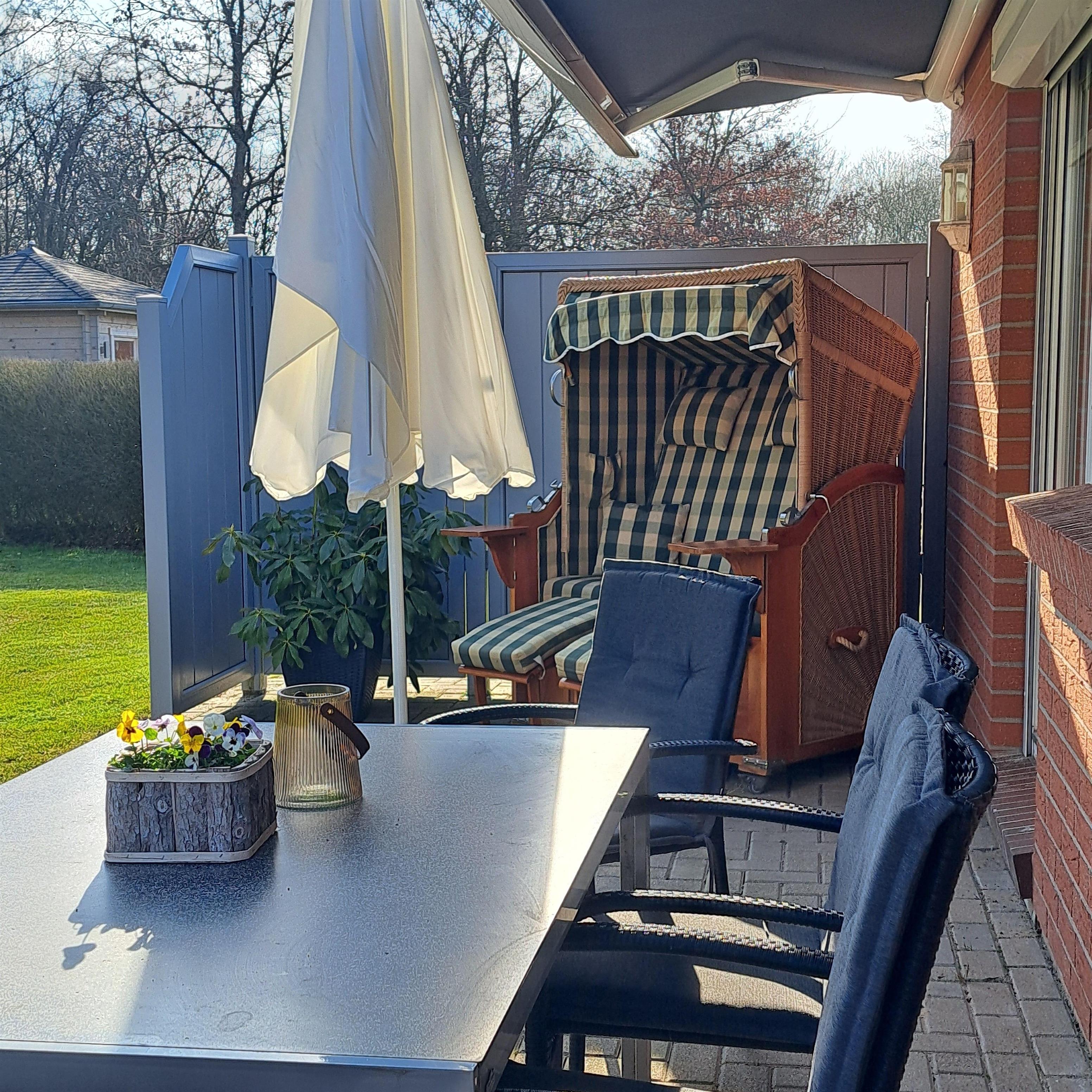 Auf den beiden großen Terassen stehen Gartenmöbel ,Liegen ,ein Strandkorb sowie eine Feuerschalle für Sie bereit .Für Ihre Fahrräder gibt es ein Gartenhaus und ein Carport für Ihr Auto sowie weitere kostenlose Parkplätze .