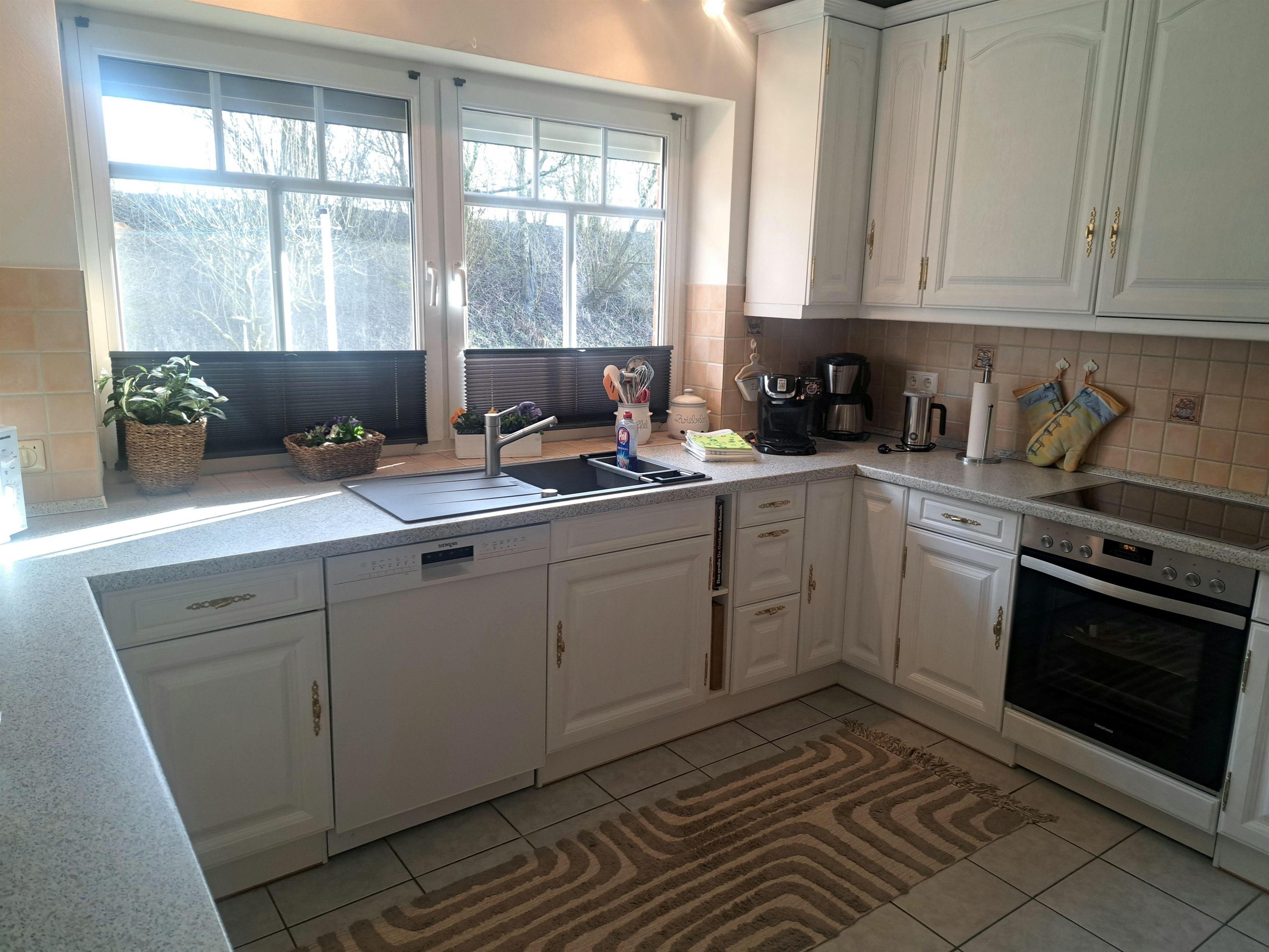 Die große Küche mit Küchenzeile und Essecke ,Geschirrspüler ,Sodestreamer ,Kaffeepadmaschine ,Kaffeemaschine ,Toaster ,Mikrowelle Umluftbackofen und viele kleine Helfer .