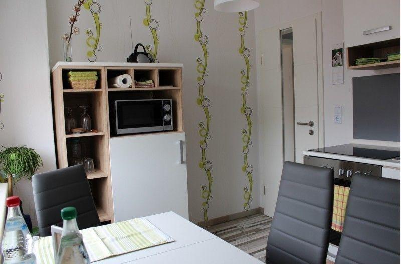 1 Küche mit E-Herd (Ceranfeld), Kühlschrank mit Gefrierfach, Geschirrspülmaschine, Kaffee-maschine, Toaster und Wasserkocher