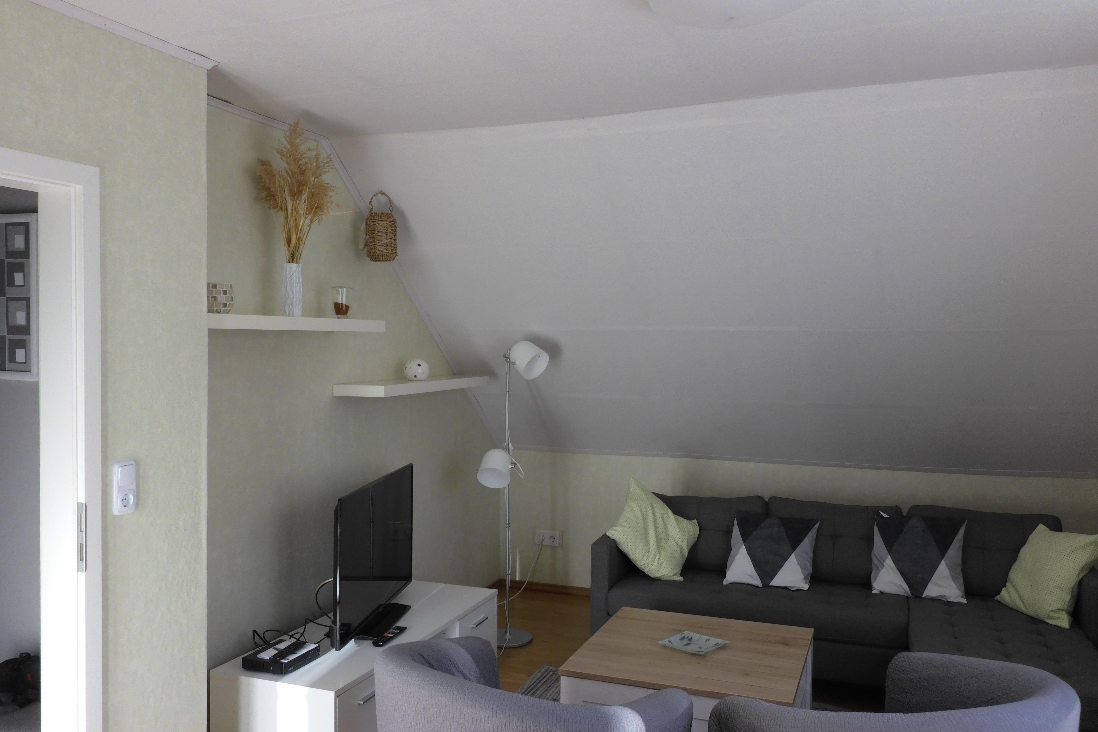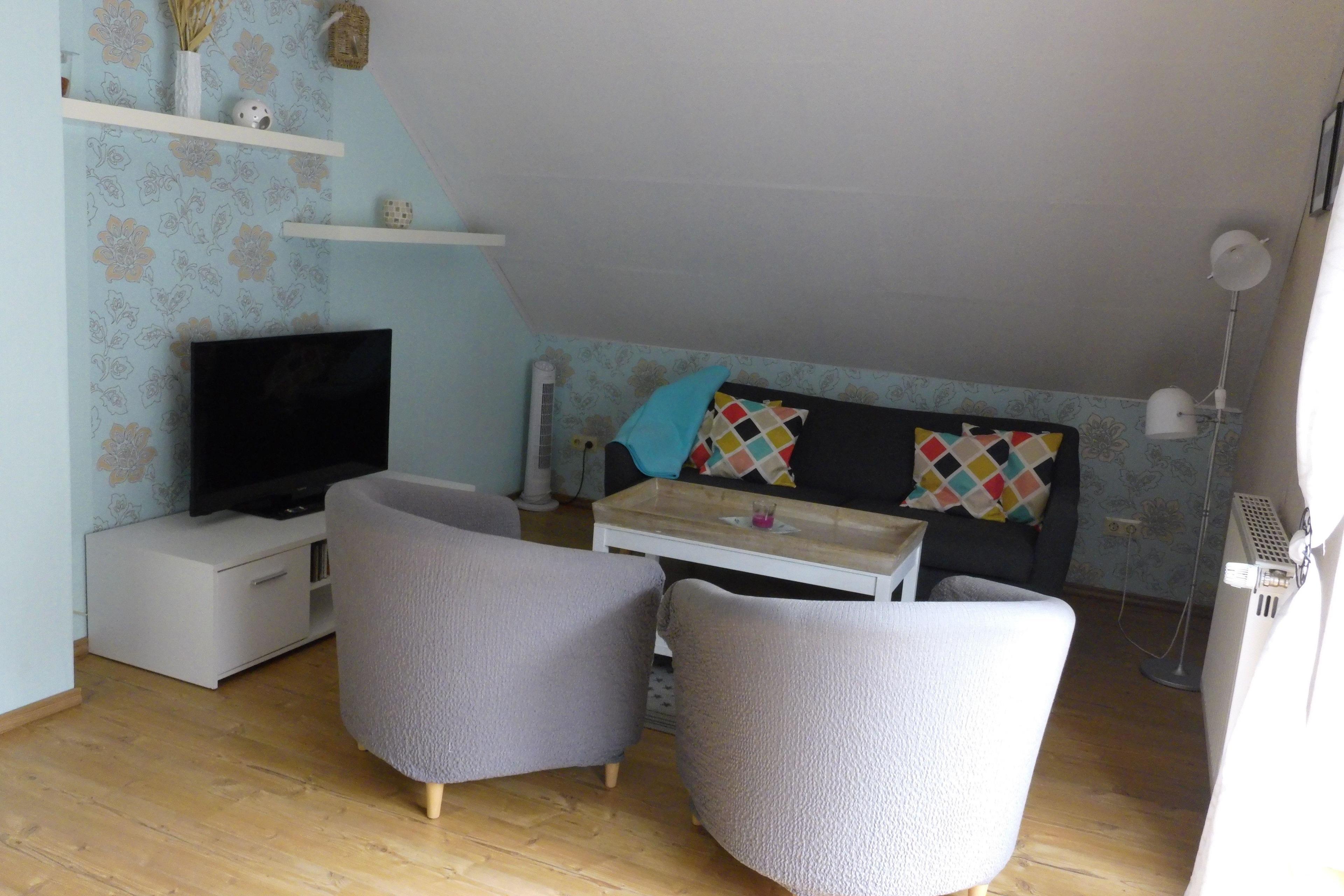 1 Wohnzimmer mit Couch, 2 Sessel ,Fernseher und Zugang zum Balkon hat eine Größe von ca. 16 m²