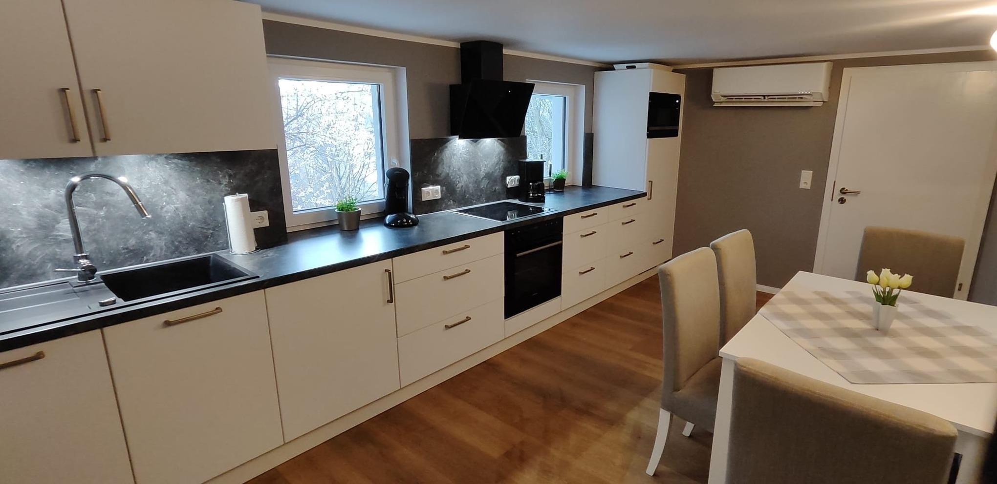 -eine moderne Küchenzeile mit Induktionskochfeld, Backofen, Kühlschrank, Kaffeemaschine, Wasserkocher & Toaster,
