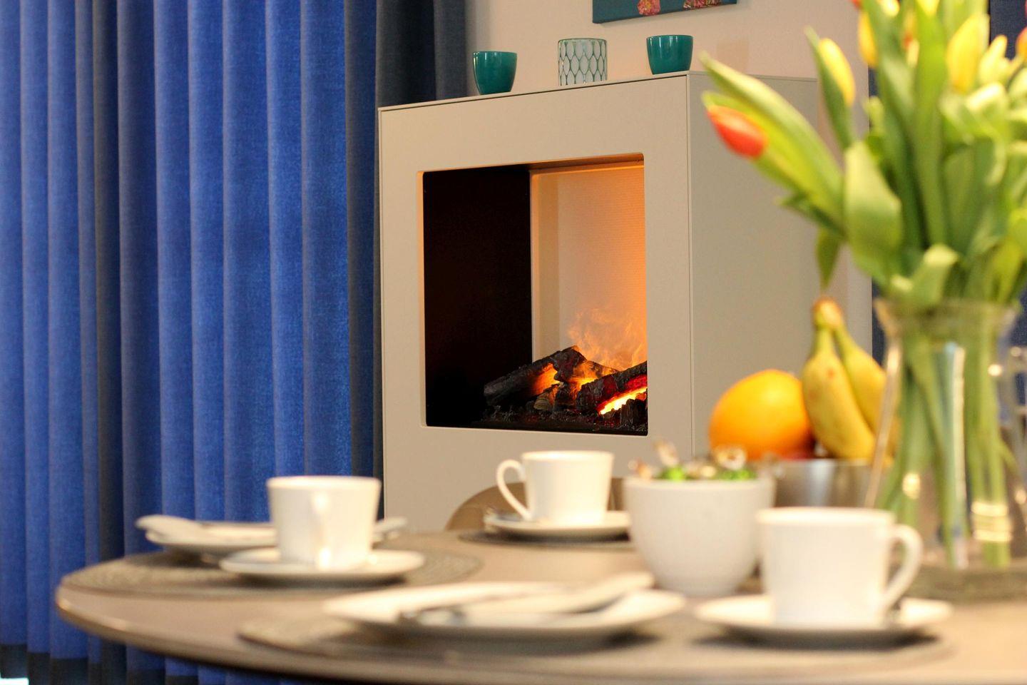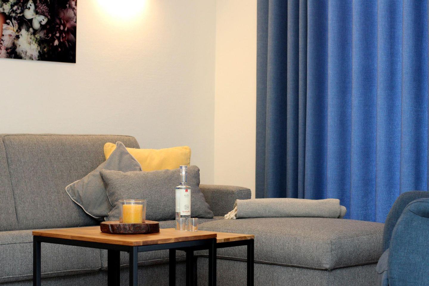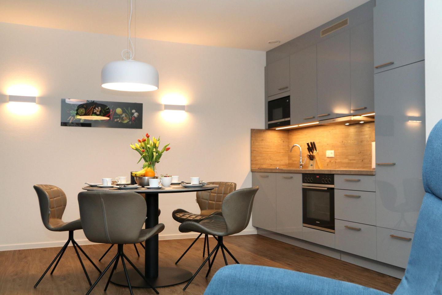 Im Wohnbereich erwartet dich ein großzügiger, heller Raum mit Sitzecke, Flachbild-TV und einem wohligen Elektro-Kaminofen – perfekt für gemütliche Abende. Die offene Küche ist voll ausgestattet und bietet alles, was du zum Kochen brauchst. Von hier aus gelangst du direkt auf die sonnige Terrasse mit Gartenmöbeln und Blick ins Grüne.