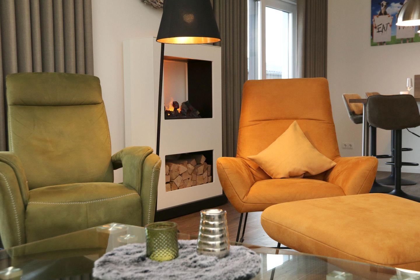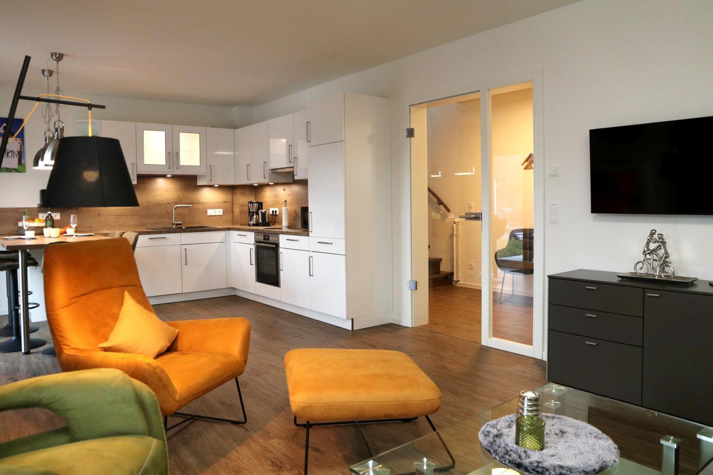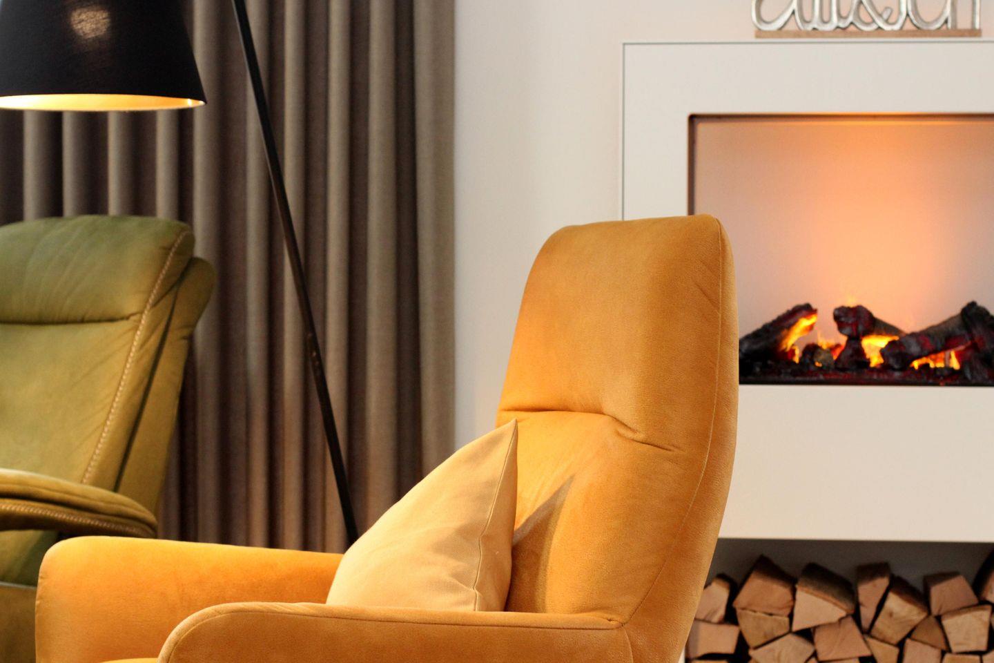 Im lichtdurchfluteten Wohnbereich erwartet dich eine gemütliche Wohnlandschaft mit Sessel und Elektrokamin. Die offene Küche mit Essplatz ist komplett ausgestattet – ideal für gemeinsame Kochabende. Bodentiefe Fenster holen die Natur ins Haus, die angrenzende Terrasse mit Garten lädt zum Entspannen im Grünen ein.