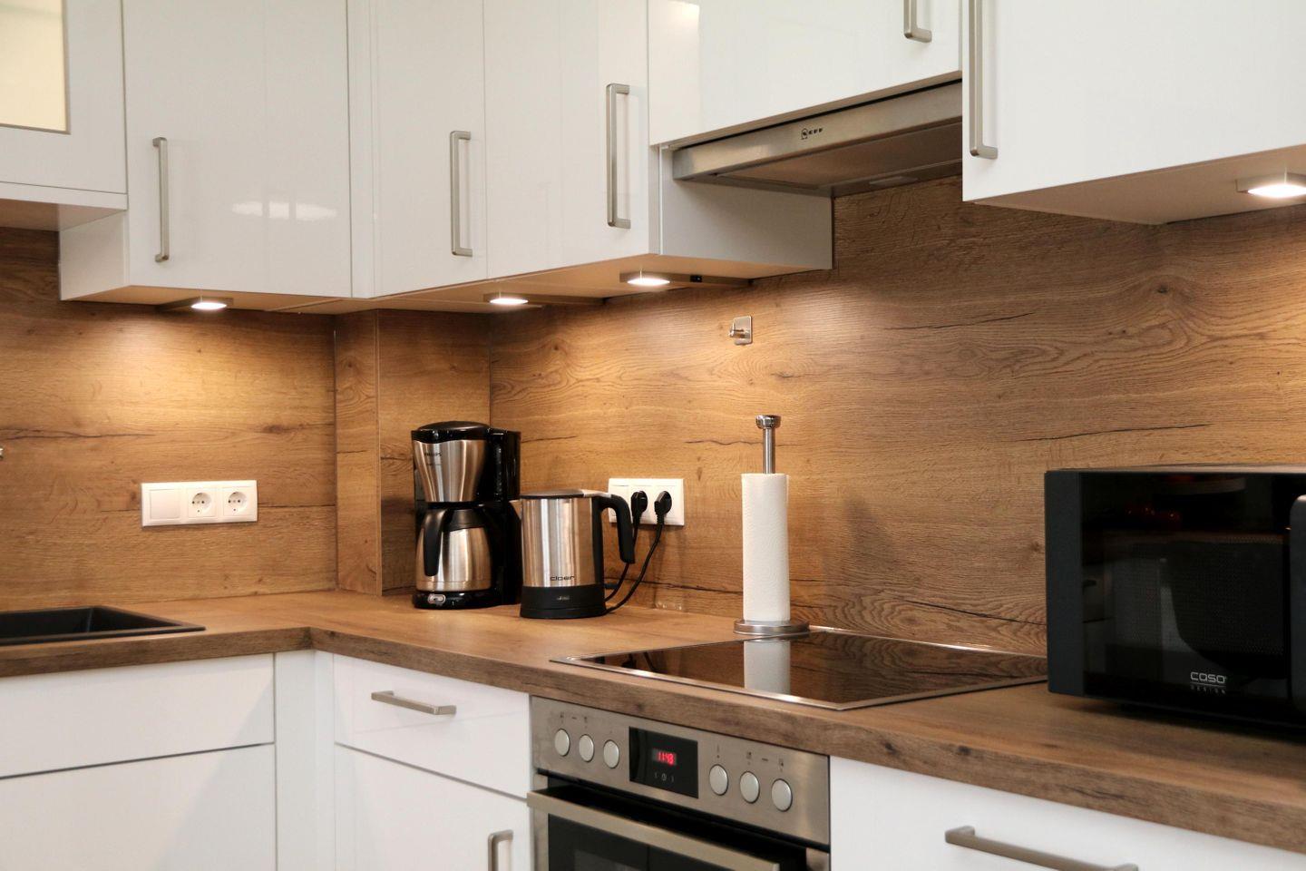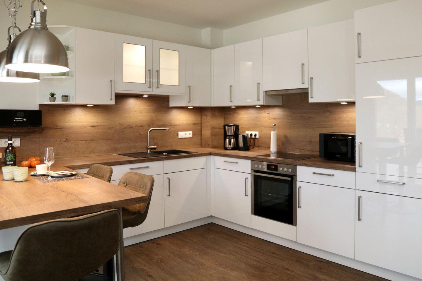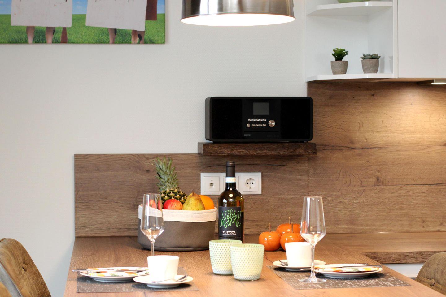 Im lichtdurchfluteten Wohnbereich erwartet dich eine gemütliche Wohnlandschaft mit Sessel und Elektrokamin. Die offene Küche mit Essplatz ist komplett ausgestattet – ideal für gemeinsame Kochabende. Bodentiefe Fenster holen die Natur ins Haus, die angrenzende Terrasse mit Garten lädt zum Entspannen im Grünen ein.