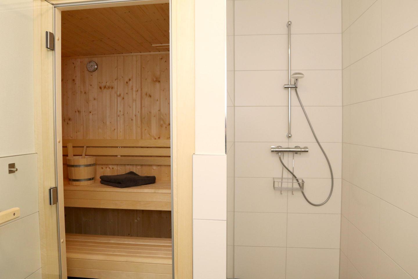 Entspanne in deinem privaten Wellnessbereich mit Sauna, bodentiefer Dusche und großzügigem Raumgefühl. Die Sauna befindet sich im Obergeschoss – ideal für dein persönliches Spa-Erlebnis nach einem aktiven Tag.