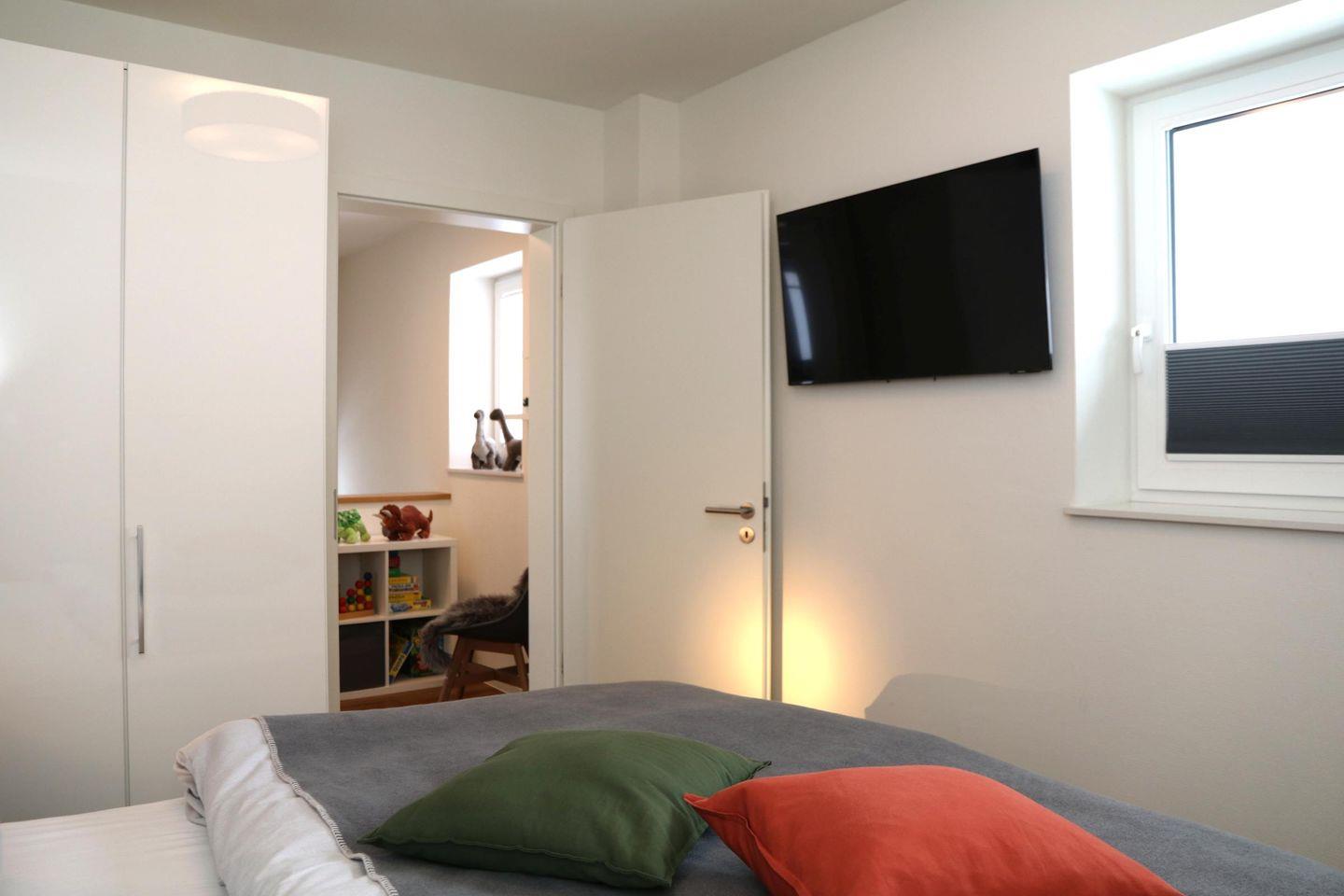 Zwei Schlafzimmer im Erdgeschoss mit Zugang zur Terrasse bieten dir Boxspringbetten, Seeblick und Smart-TVs mit Magenta TV. Das dritte Schlafzimmer im Obergeschoss ist ruhig gelegen und ebenso hochwertig ausgestattet – ebenfalls mit Smart-TV und Magenta TV – für erholsame Nächte mit Privatsphäre.