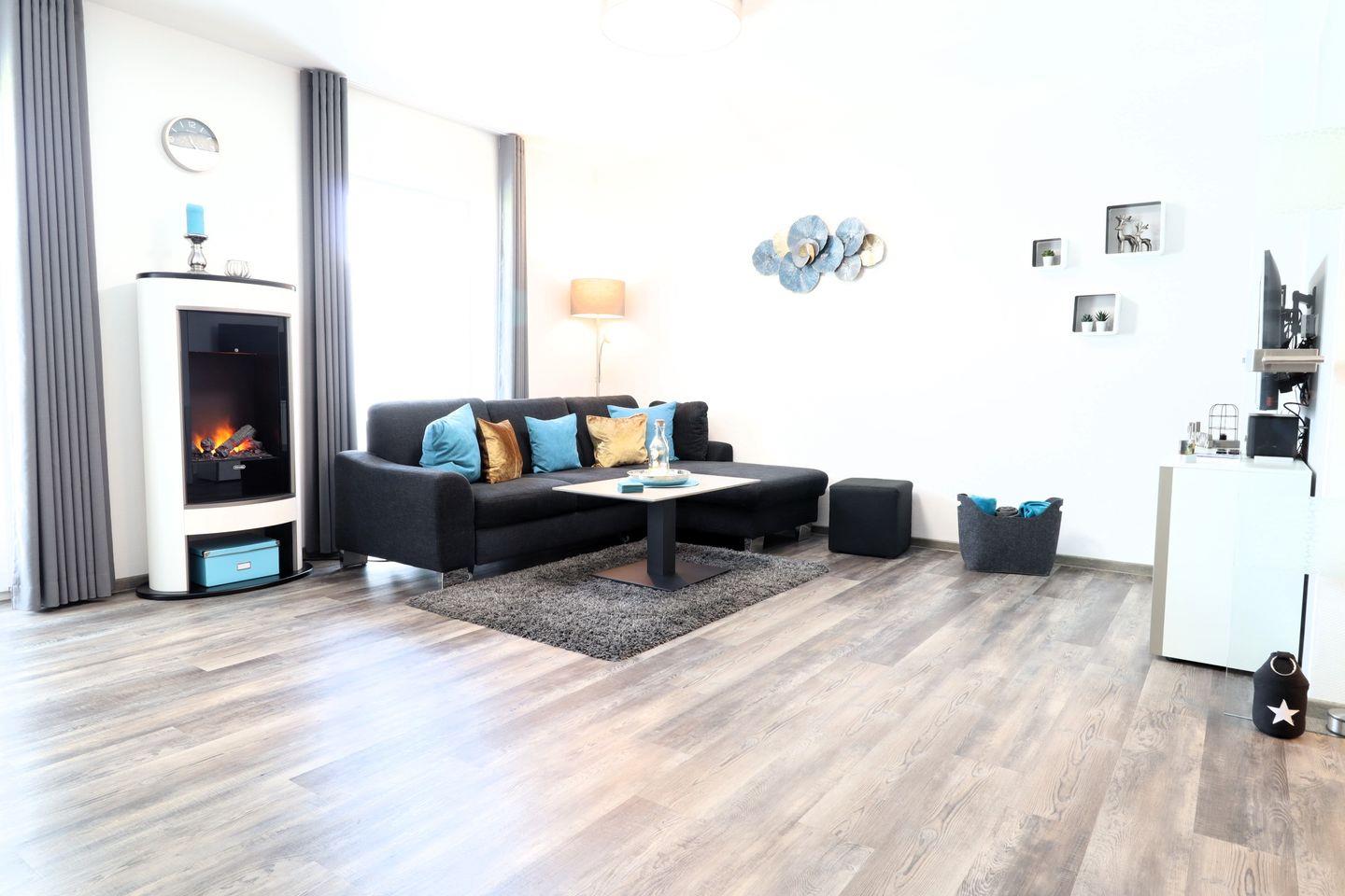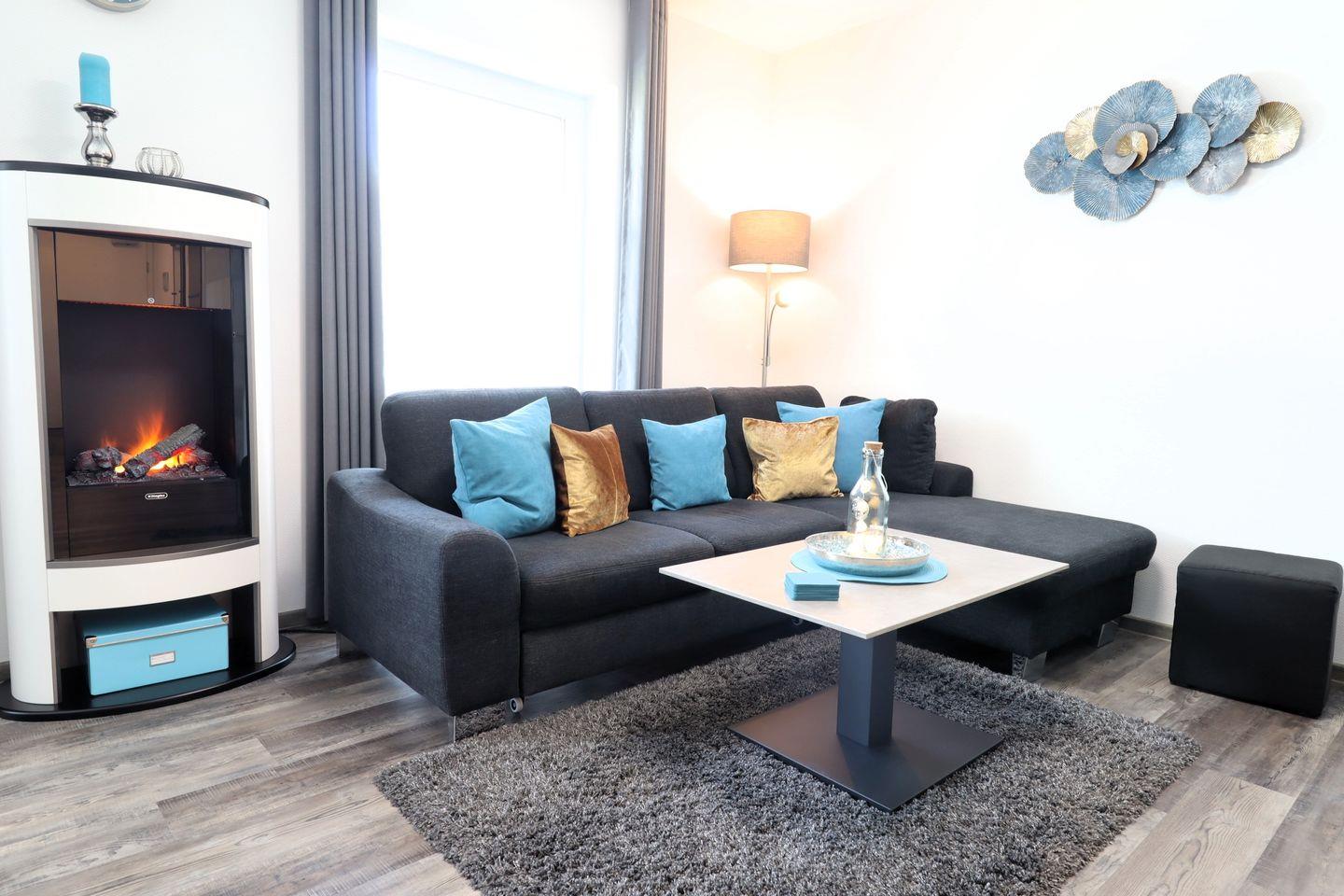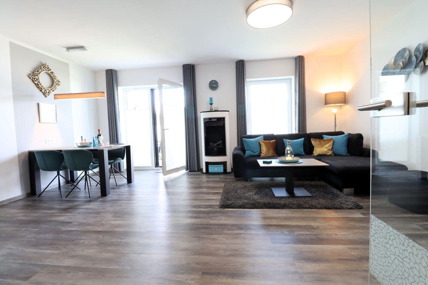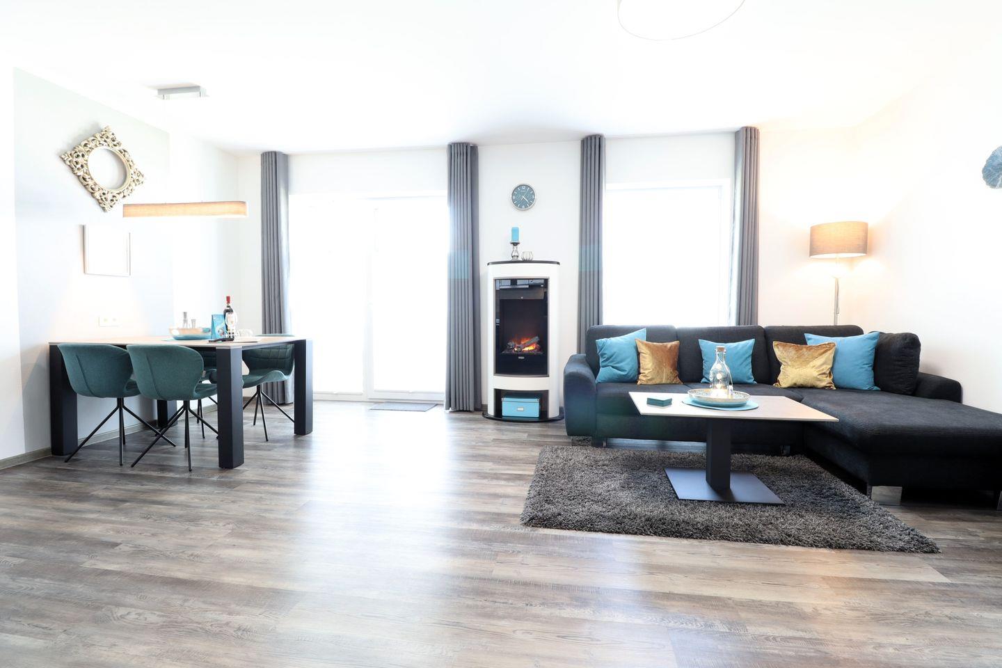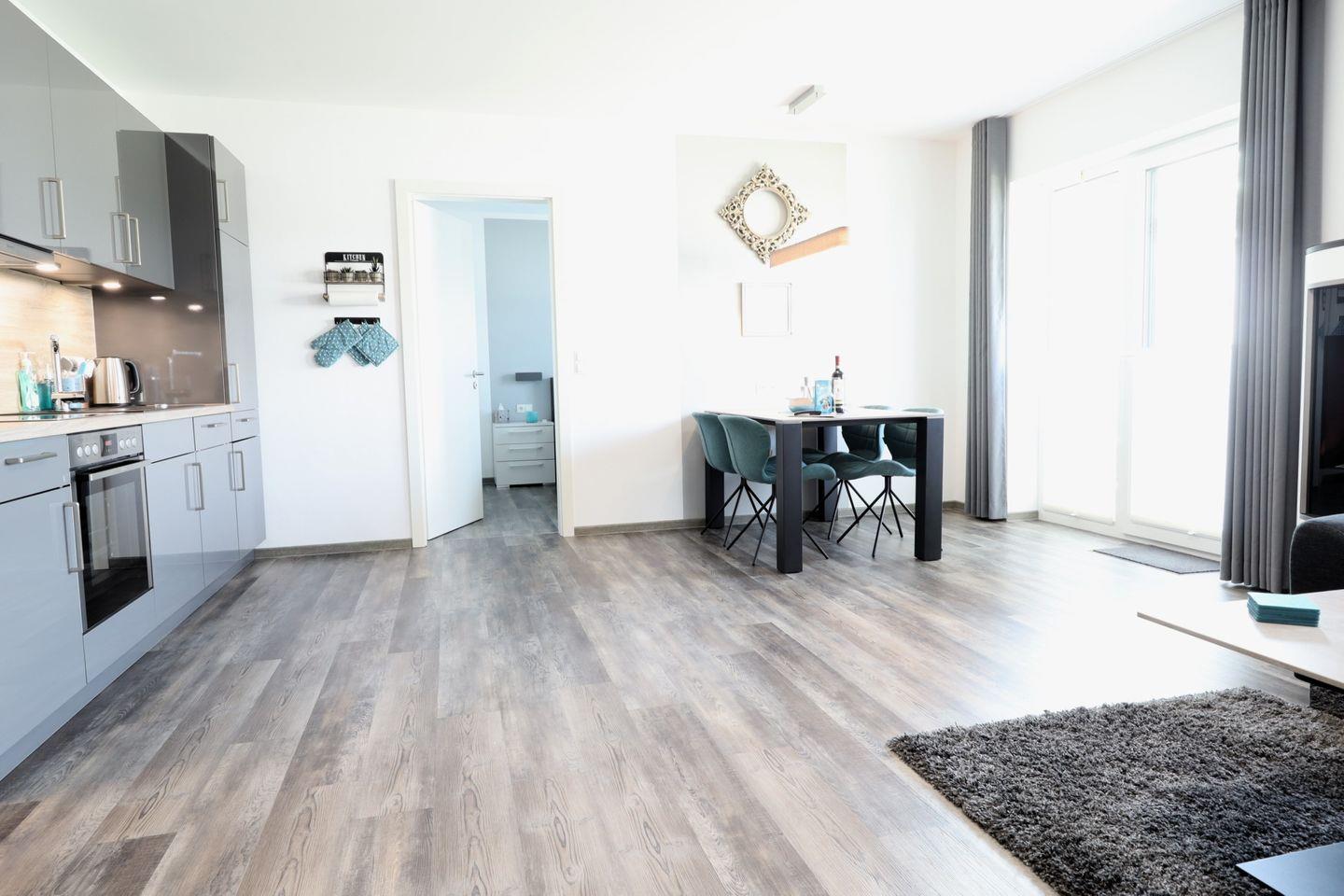 Das Wohnzimmer ist offen gestaltet und lichtdurchflutet. Auf dem gemütlichen Sofa kannst du den Tag entspannt ausklingen lassen – ob bei einem Film oder einem Spieleabend. Der Esstisch bietet Platz für zwei bis vier Personen, ideal für gemeinsame Mahlzeiten. Ein harmonisches Farbkonzept sorgt für eine behagliche Atmosphäre und unterstreicht den modernen Stil der Wohnung.
