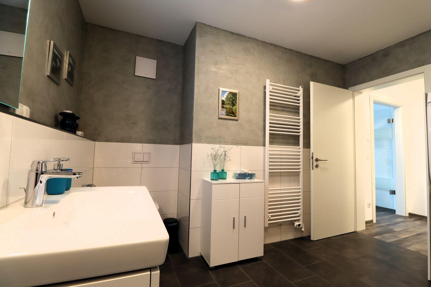 Das moderne Tageslichtbad ist mit einer ebenerdigen Dusche, WC, Waschbecken und Handtuchheizung ausgestattet. Für einen angenehmen Start in den Tag sorgen warme Farben und hochwertige Sanitärkeramik.
