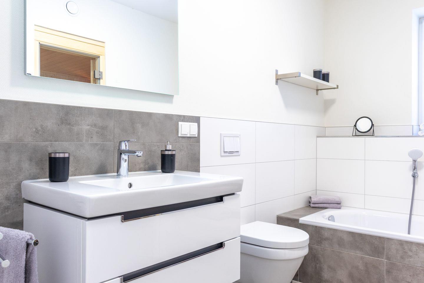 Im Obergeschoss erwartet dich ein großzügiges Wellnessbad mit Badewanne, ebenerdiger Dusche und privater Sauna – für deine Entspannung zu jeder Jahreszeit. Ein zweites Bad mit Dusche und WC im Erdgeschoss sorgt für zusätzlichen Komfort.